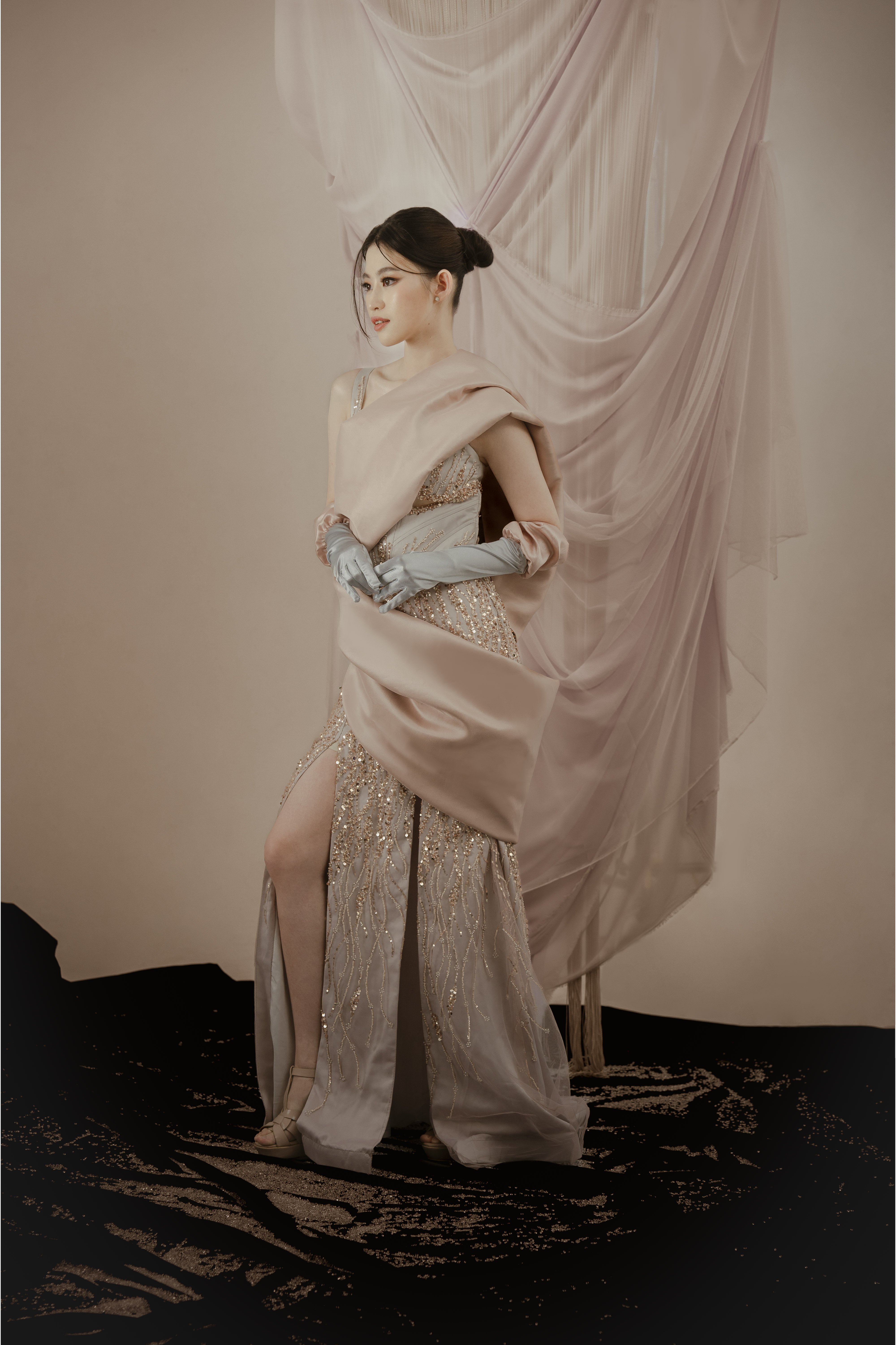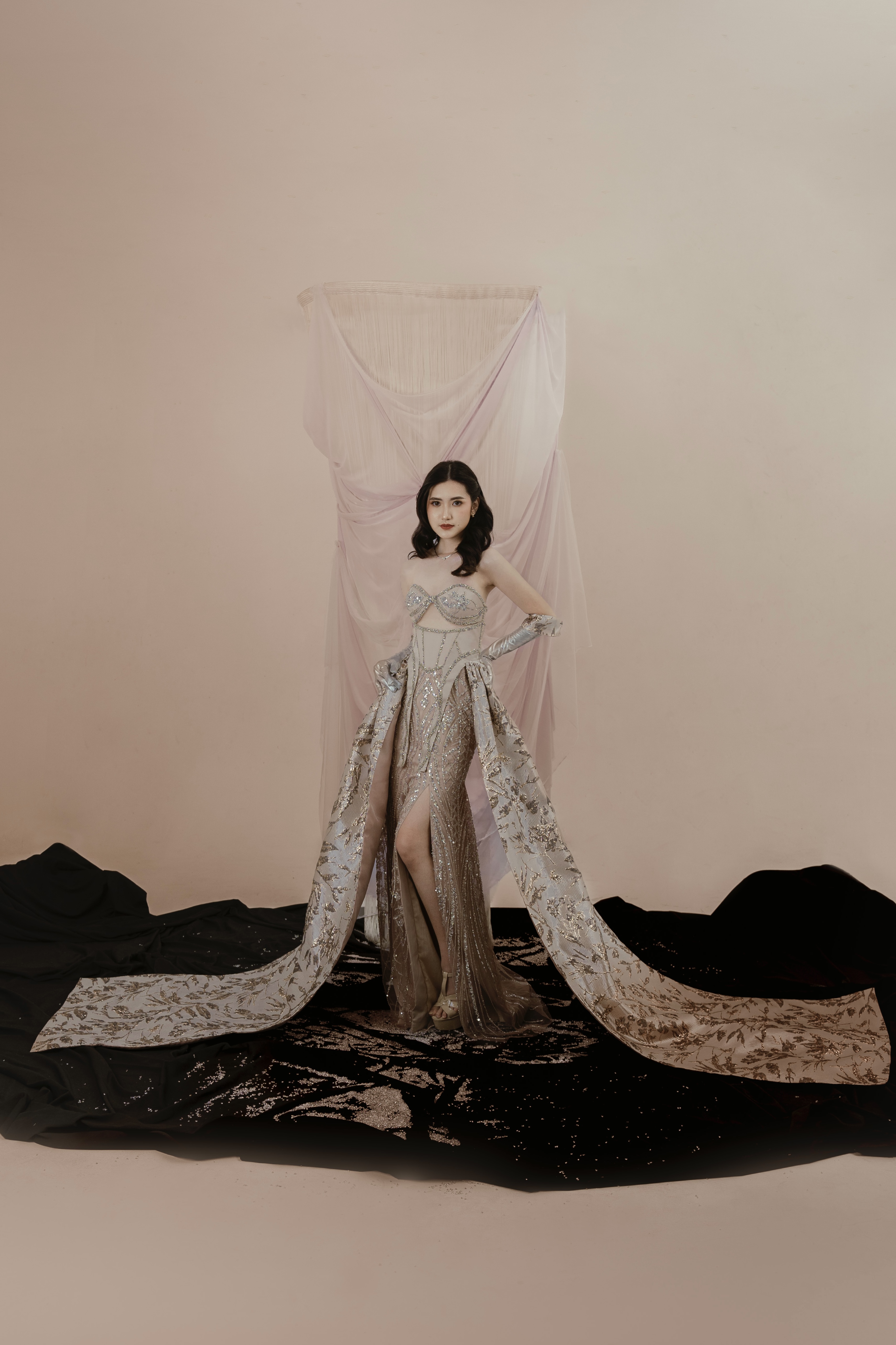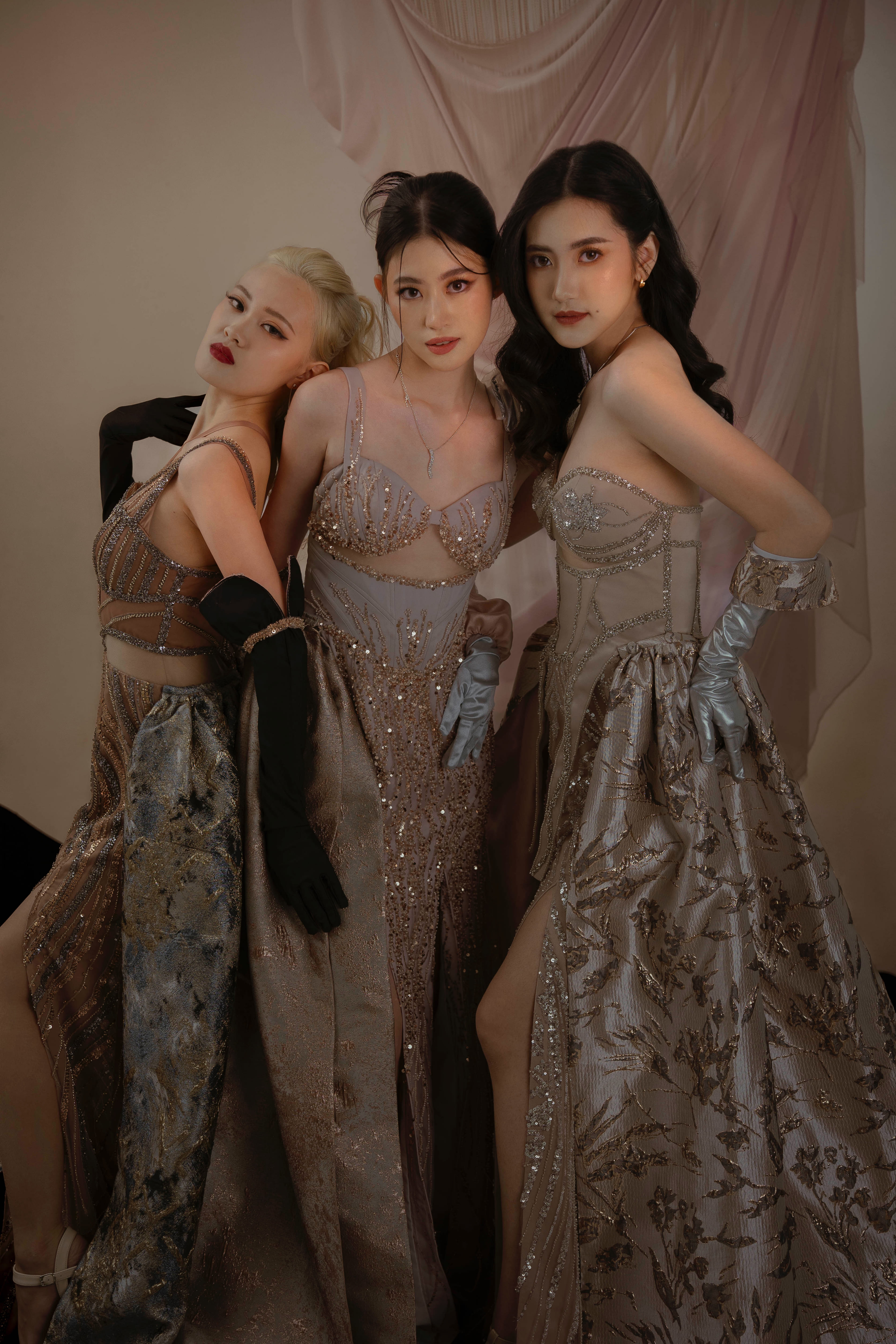 Industri hiburan yang semakin berkembang di Indonesia meningkatkan kebutuhan akan pakaian yang unik bagi publik figur. Pakaian menjadi elemen krusial dalam penampilan mereka, di mana semakin unik dan tidak biasa busana yang dipilih, semakin besar juga sorotan terhadap eksistensi mereka. Namun, dalam kenyataannya, didapati bahwa kurangnya pilihan busana existing yang sesuai dengan standar yang diinginkan untuk acara-acara industri hiburan, sehingga seringkali publik figur atau stylist yang bertanggung jawab harus melakukan custom busana khusus untuk setiap kesempatan. Dalam menanggapi kebutuhan ini, perancang melakukan inovasi dengan menciptakan gaun rekayasa yang unik dan elegan, yang dilengkapi dengan sarung tangan dengan desain yang dapat menampilkan dua tampilan pula. Metode perancangan yang diterapkan adalah metode design thinking dengan enam tahapan, mulai dari tahap understand hingga tahap test. Proses perancangan ini bertujuan untuk menciptakan gaun couture dengan konsep yang menggabungkan inovasi gaun rekayasa yang unik dan elegan, sesuai dengan permintaan pasar industri hiburan yang terus meningkat. Beberapa bagian dari gaun, seperti bagian pundak dan pinggang, dirancang agar dapat dilepas dan dipasang kembali untuk menghasilkan dua tampilan busana yang berbeda. Transformasi ini diperkuat dengan penggunaan kain tafeta polos untuk tampilan pertama dan kain jacquard bermotif untuk tampilan kedua, menunjukkan perubahan yang dramatis antara dua tampilan tersebut. Selain memberikan kesan unik, perancangan ini juga bertujuan untuk mengurangi masalah penyimpanan busana yang berlebihan. Fokus utama dari proyek perancangan ini adalah pada busana couture dengan menggunakan bahan berkualitas medium-to-high. Hasil akhir dari proyek ini adalah tiga koleksi gaun couture dengan desain gaun rekayasa yang unik dan elegan, yang dilengkapi dengan tiga sarung tangan berdesain ganda sesuai dengan busana utama. Pola visual berstruktur tiga dimensi yang diterapkan pada area tertentu seperti bahu dan pinggang dapat dengan mudah dilepas-pasang, menciptakan transformasi yang mencolok dan menarik perhatian publik. Berdasarkan hasil uji coba, ketiga busana ini telah terbukti sesuai untuk industri hiburan seperti acara red carpet, beauty pageant, dan sweet seventeen. Bahkan, responden menilai bahwa busana semacam ini sangat diminati dalam dunia industri hiburan saat ini.