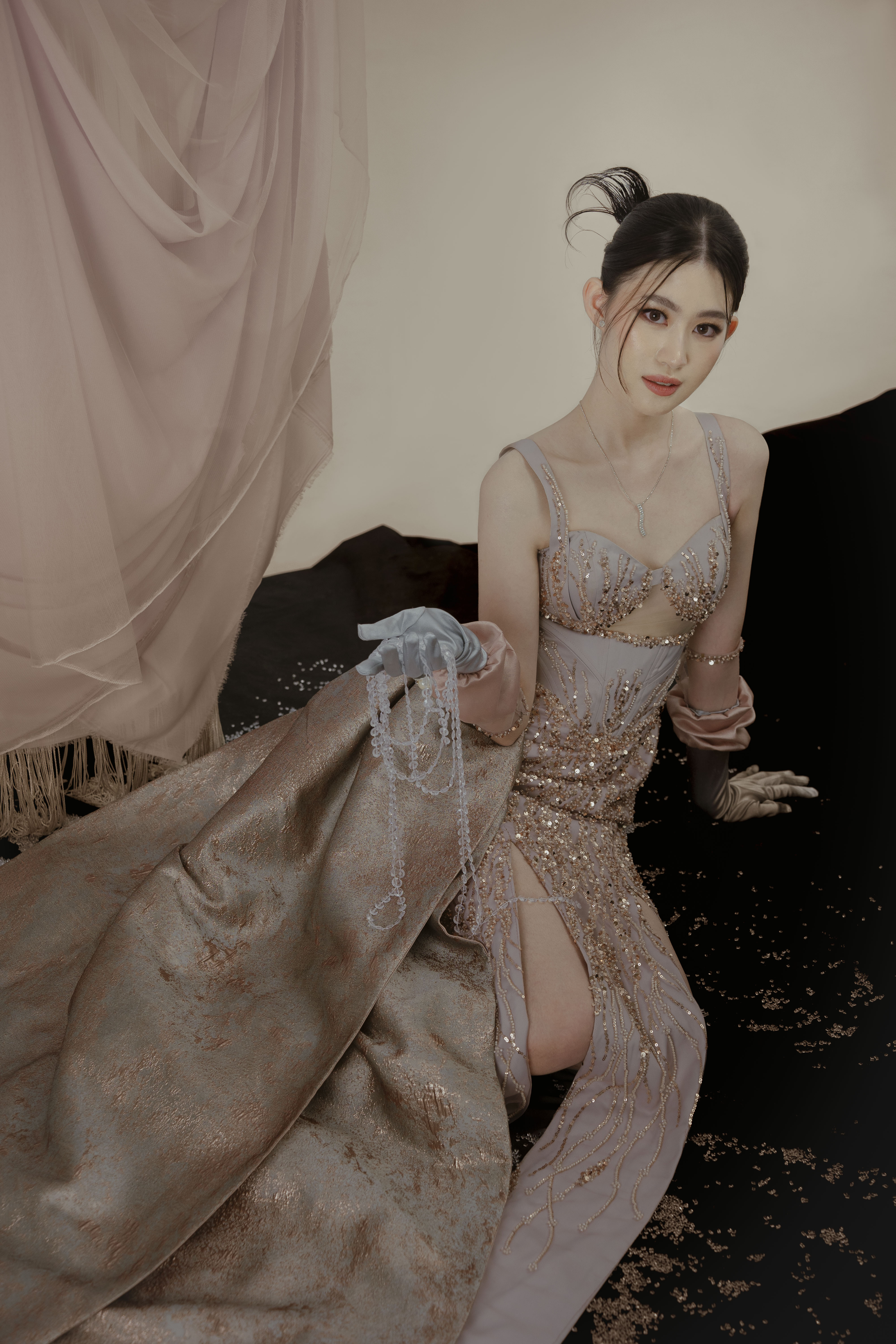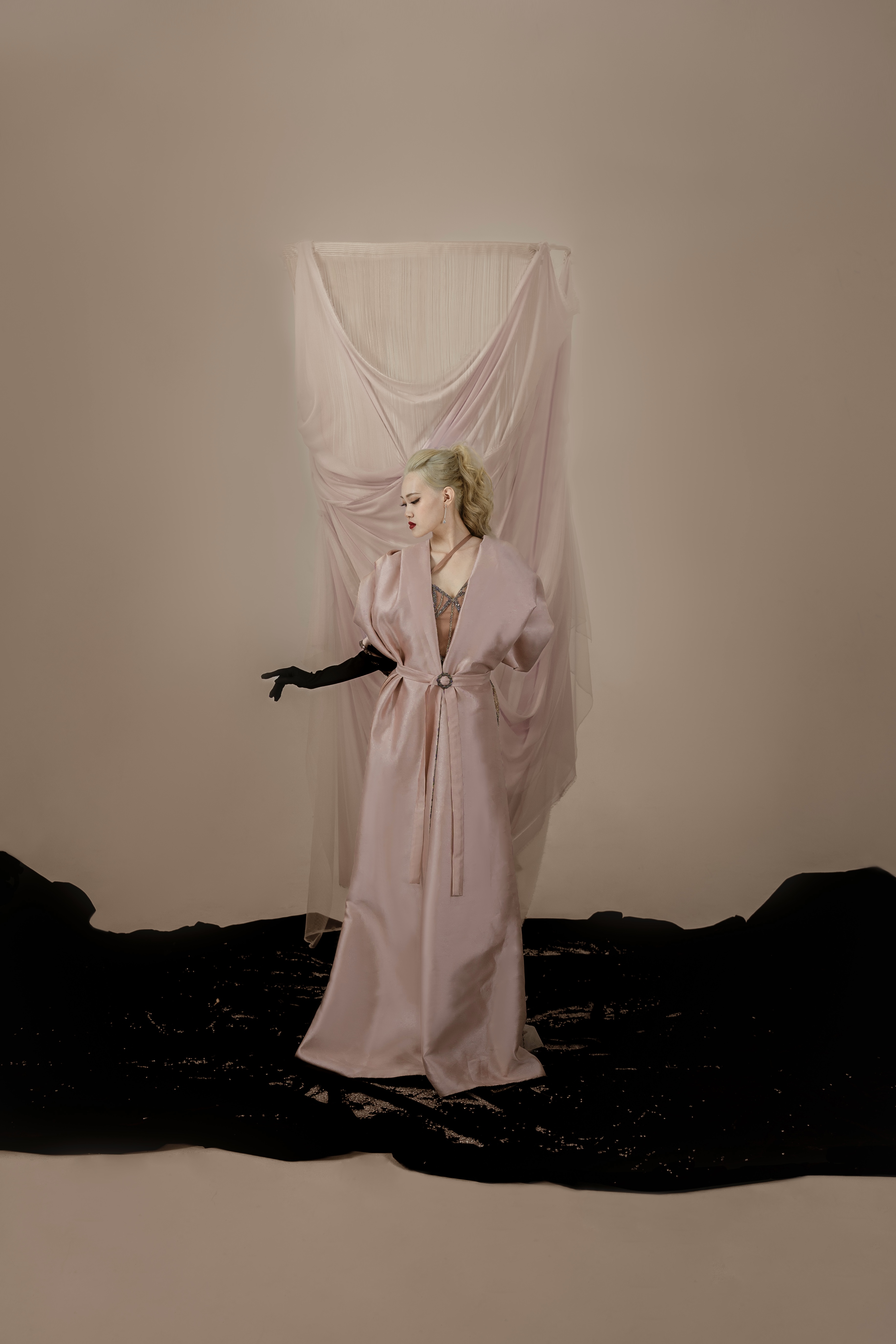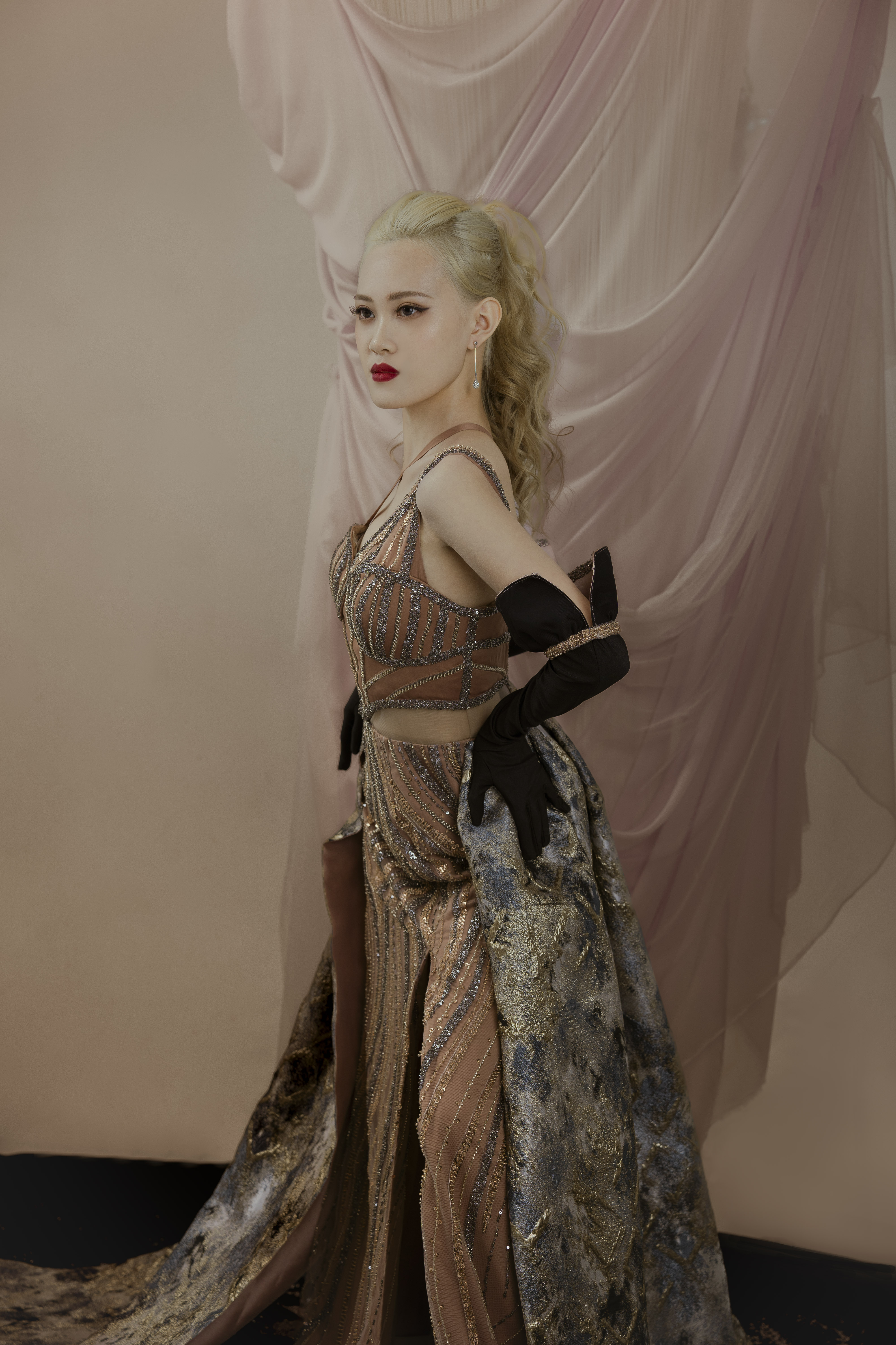 Industri hiburan yang semakin berkembang di Indonesia meningkatkan kebutuhan akan pakaian yang unik bagi publik figur. Pakaian menjadi elemen krusial dalam penampilan mereka, di mana semakin unik dan tidak biasa busana yang dipilih, semakin besar juga sorotan terhadap eksistensi mereka. Namun, dalam kenyataannya, didapati bahwa kurangnya pilihan busana existing yang sesuai dengan standar yang diinginkan untuk acara-acara industri hiburan, sehingga seringkali publik figur atau stylist yang bertanggung jawab harus melakukan custom busana khusus untuk setiap kesempatan. Dalam menanggapi kebutuhan ini, perancang melakukan inovasi dengan menciptakan gaun rekayasa yang unik dan elegan, yang dilengkapi dengan sarung tangan dengan desain yang dapat menampilkan dua tampilan pula. Metode perancangan yang diterapkan adalah metode design thinking dengan enam tahapan, mulai dari tahap understand hingga tahap test. Proses perancangan ini bertujuan untuk menciptakan gaun couture dengan konsep yang menggabungkan inovasi gaun rekayasa yang unik dan elegan, sesuai dengan permintaan pasar industri hiburan yang terus meningkat. Beberapa bagian dari gaun, seperti bagian pundak dan pinggang, dirancang agar dapat dilepas dan dipasang kembali untuk menghasilkan dua tampilan busana yang berbeda. Transformasi ini diperkuat dengan penggunaan kain tafeta polos untuk tampilan pertama dan kain jacquard bermotif untuk tampilan kedua, menunjukkan perubahan yang dramatis antara dua tampilan tersebut. Selain memberikan kesan unik, perancangan ini juga bertujuan untuk mengurangi masalah penyimpanan busana yang berlebihan. Fokus utama dari proyek perancangan ini adalah pada busana couture dengan menggunakan bahan berkualitas medium-to-high. Hasil akhir dari proyek ini adalah tiga koleksi gaun couture dengan desain gaun rekayasa yang unik dan elegan, yang dilengkapi dengan tiga sarung tangan berdesain ganda sesuai dengan busana utama. Pola visual berstruktur tiga dimensi yang diterapkan pada area tertentu seperti bahu dan pinggang dapat dengan mudah dilepas-pasang, menciptakan transformasi yang mencolok dan menarik perhatian publik. Berdasarkan hasil uji coba, ketiga busana ini telah terbukti sesuai untuk industri hiburan seperti acara red carpet, beauty pageant, dan sweet seventeen. Bahkan, responden menilai bahwa busana semacam ini sangat diminati dalam dunia industri hiburan saat ini.