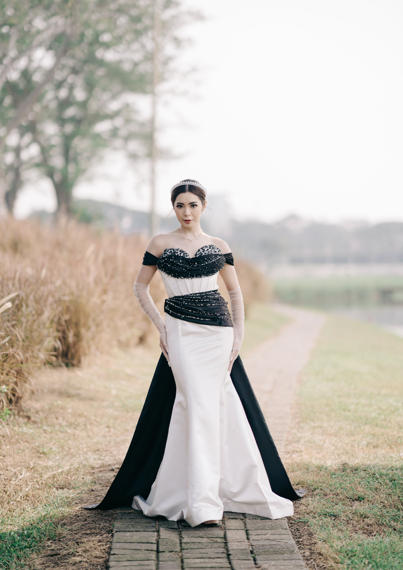 Pernikahan merupakan sebuah momen yang sakral dalam perjalanan hidup seseorang, karena dilakukan sekali seumur hidup dan akan dikenang seumur hidup. Pernikahan tak hanya menyatukan dua manusia, namun juga menyatukan dua keluarga besar dalam jalinan persaudaraan. Perkembangan zaman yang terus berubah, acara pernikahan pun seiring berjalannya waktu semakin berubah dan berkembang. Acara resepsi yang dulunya sering diadakan secara indoor, namun saat ini sudah banyak yang menggunakan konsep pernikahan outdoor. Wedding outdoor membutuhkan wedding gown yang nyaman digunakan untuk acara tersebut. Maka dari itu, penulis membuat wedding gown dengan konsep outdoor untuk membantu para wanita mencari gown yang nyaman digunakan untuk acara resepsi mereka. Tak hanya itu, Perancangan ini membuat wedding gown dengan kombinasi duotone yang bertujuan untuk argumentasi pada statement bahwa wedding gown tidak selamanya harus selalu berwarna putih dan ingin membuat wedding gown agar pemakainya dapat tampil berbeda di hasil spesial mereka. Metode penelitian yang digunakan yaitu metode Design Thinking. Pendalaman penelitian ini juga dilakukan melalui pendalaman data melalui artikel, jurnal, buku, dan observasi brand bridal kota-kota besar serta observasi selama magang di Grace Wang Bridal. Hasil dari perancangan ini yaitu 3 look wedding gown dengan kombinasi duotone menggunakan teknik draping. Dari uji coba yang sudah dilakukan, dapat disimpulkan bahwa perancangan ini bisa dibilang berhasil karena setelah dilakukan uji coba atau test kebeberapa orang, mereka mengatakan bahwa wedding gown duotone ini layak dipasarkan, mereka tertarik dan mengatakan walaupun wedding gown ini menggunakan kombinasi duotone, namun hal tersebut tidak memberikan kesan negatif jika dikenakan. Wedding gown ini juga cocok digunakan untuk acara outdoor karena memiliki siluet mermaid dan unsur drapingnya sendiri memberikan kesan focus point pada busana tersebut.