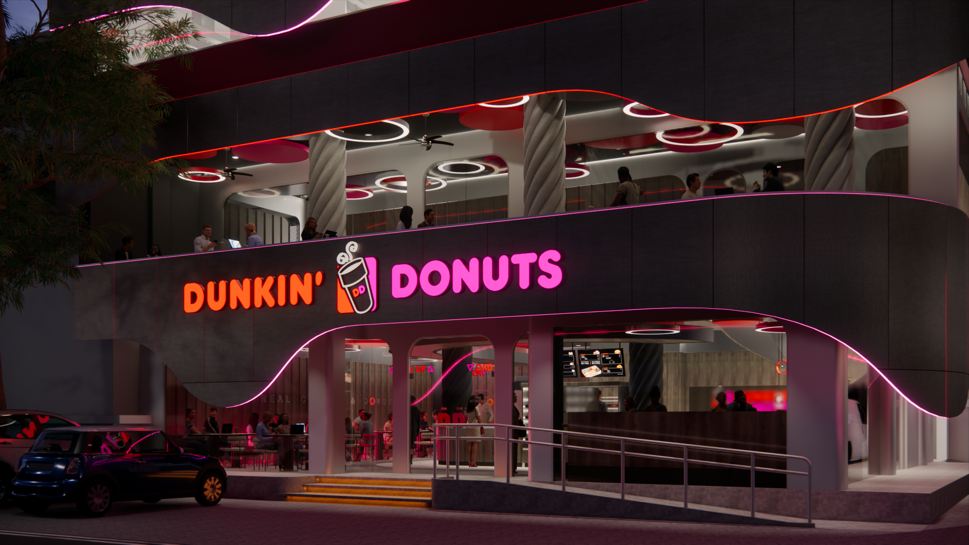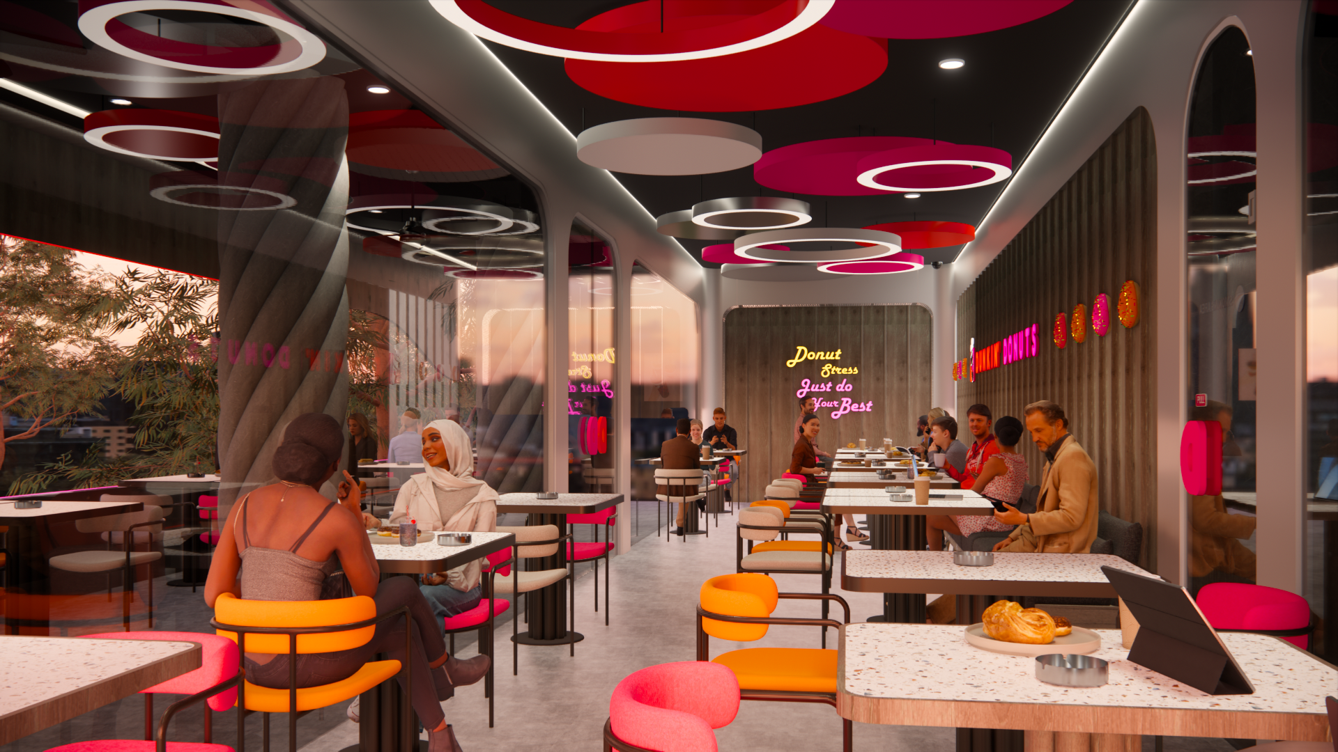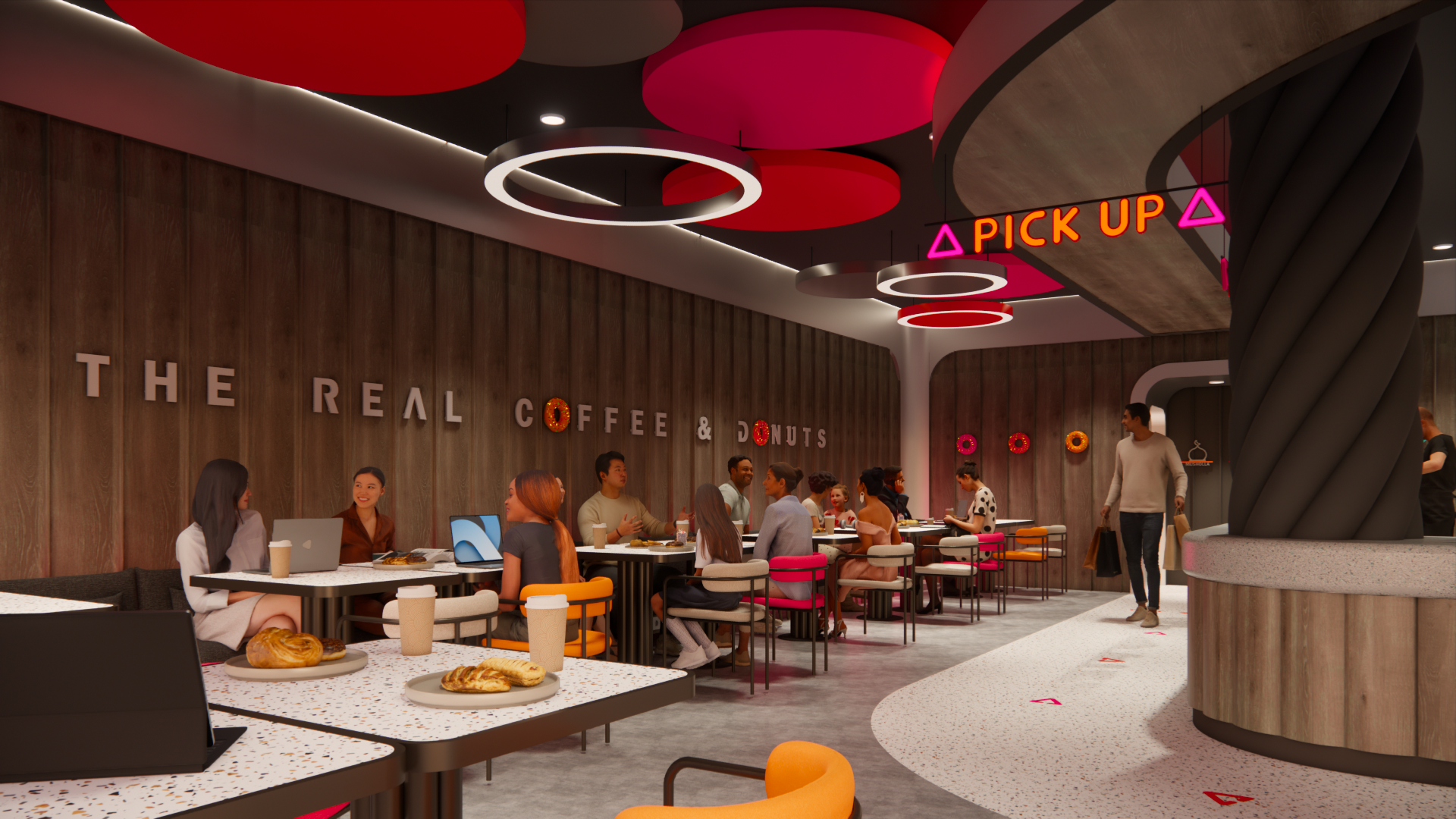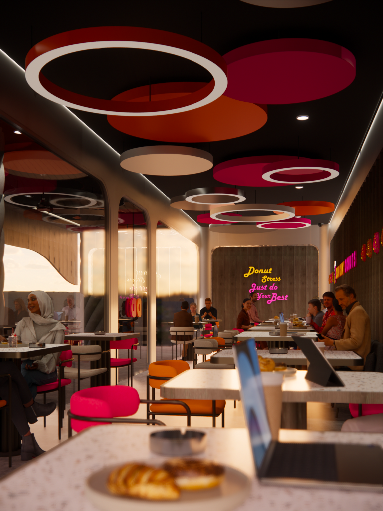 Umumnya, kafe adalah suatu tempat untuk makan dan minum sambil berkumpul, berbincang, bersantai, ataupun sekedar mengisi waktu luang. Namun seiring berkembangnya zaman, fungsi kafe berkembang menjadi tempat untuk bekerja. Mengingat sejak era pandemi, banyak orang harus menggunakan sistem kerja ‘work from home (WFH)’. Sistem tersebut berpengaruh pada kebiasaan dan pola kerja masyarakat, yang mana saat ini telah berkembang menjadi ‘work from café (WFC)’. Banyak orang yang merasa lebih nyaman dan produktif ketika bekerja di kafe. Sehingga kini kafe yang nyaman menjadi tempat yang banyak dicari orang. Maka dari itu, penulis mengangkat topik perancangan interior Dunkin’ Donuts dengan menggunakan pendekatan human-centered design (HCD), tujuannya untuk mendukung kenyamanan aktivitas pengguna. Perancangan ini menggunakan metode design thinking yang terdiri dari sembilan tahap, untuk menciptakan solusi yang menjawab permasalahan dan kebutuhan pengguna. Fokus perancangan ini mendukung kenyamanan pengguna dalam beraktivitas dengan menyesuaikan fungsi dan kebutuhan ruang berdasarkan penggunanya. Tujuan perancangan ini untuk meningkatkan minat pengunjung dan mendukung produktivitas seluruh pengguna baik pengunjung maupun staf. Perancangan ini menghasilkan desain kafe yang fokus pada kebutuhan dan pola aktivitas pengguna, guna memaksimalkan produktivitas, kualitas layanan, minat dan tingkat kepuasan pengunjung, dan brand awareness suatu kafe.