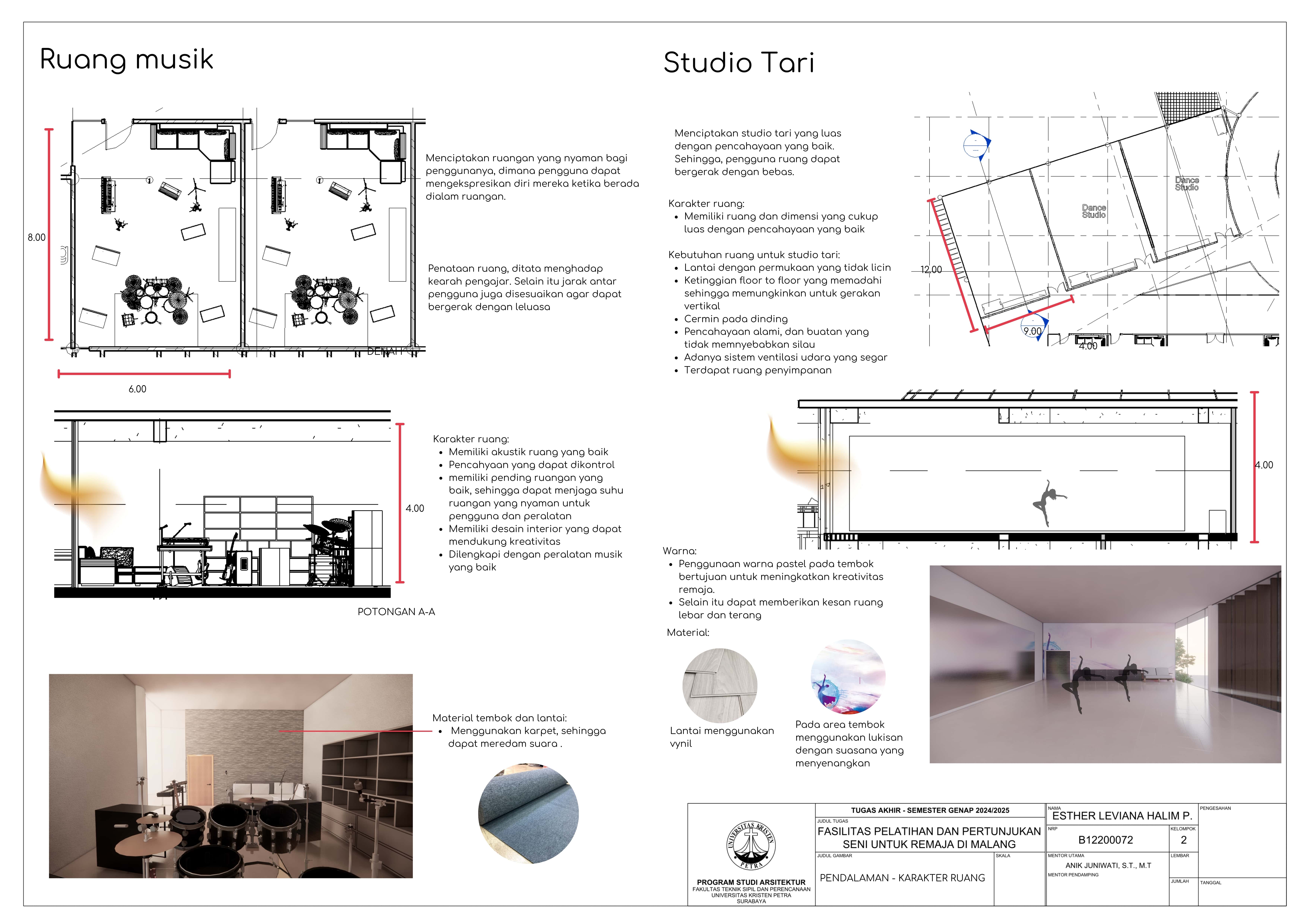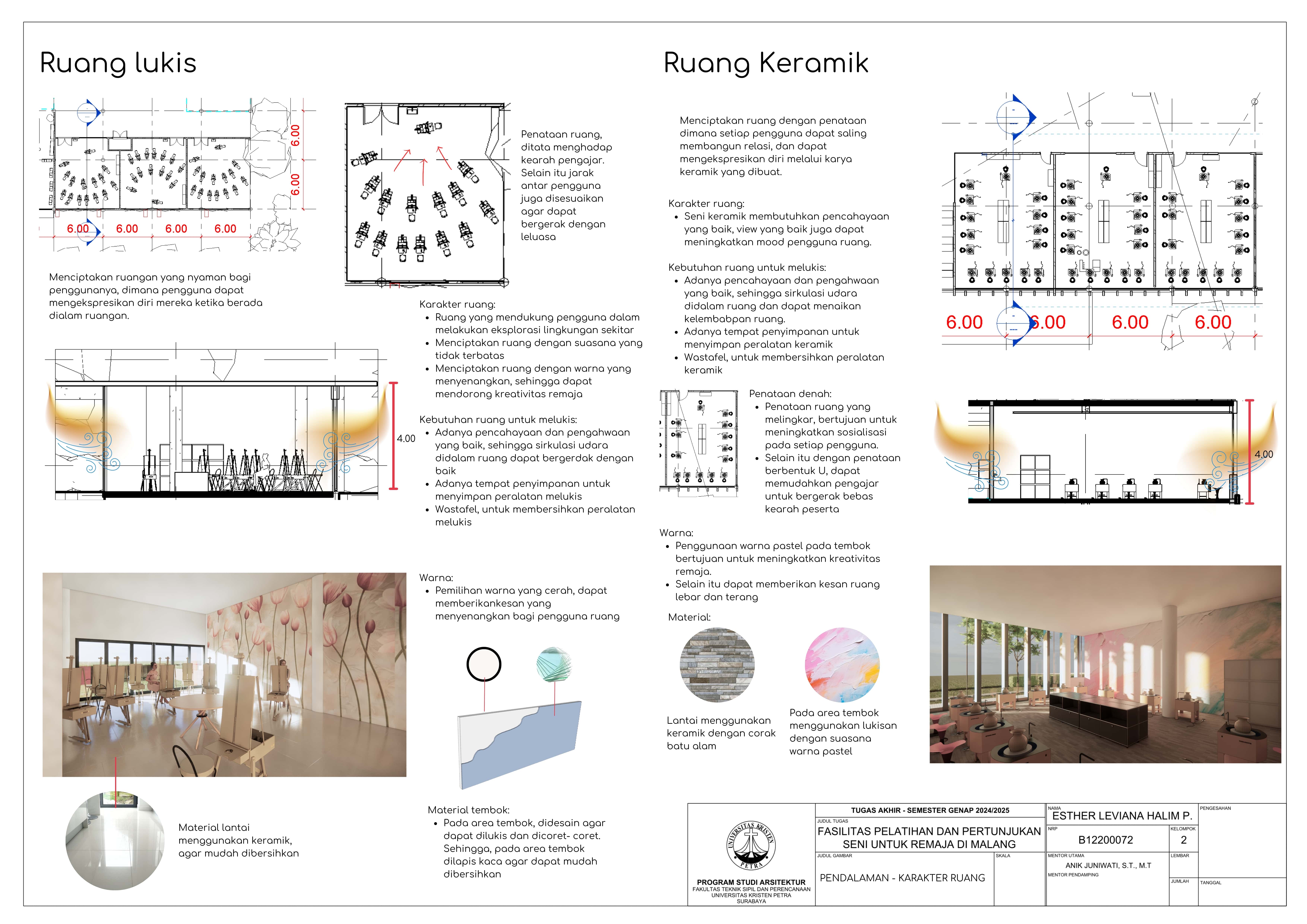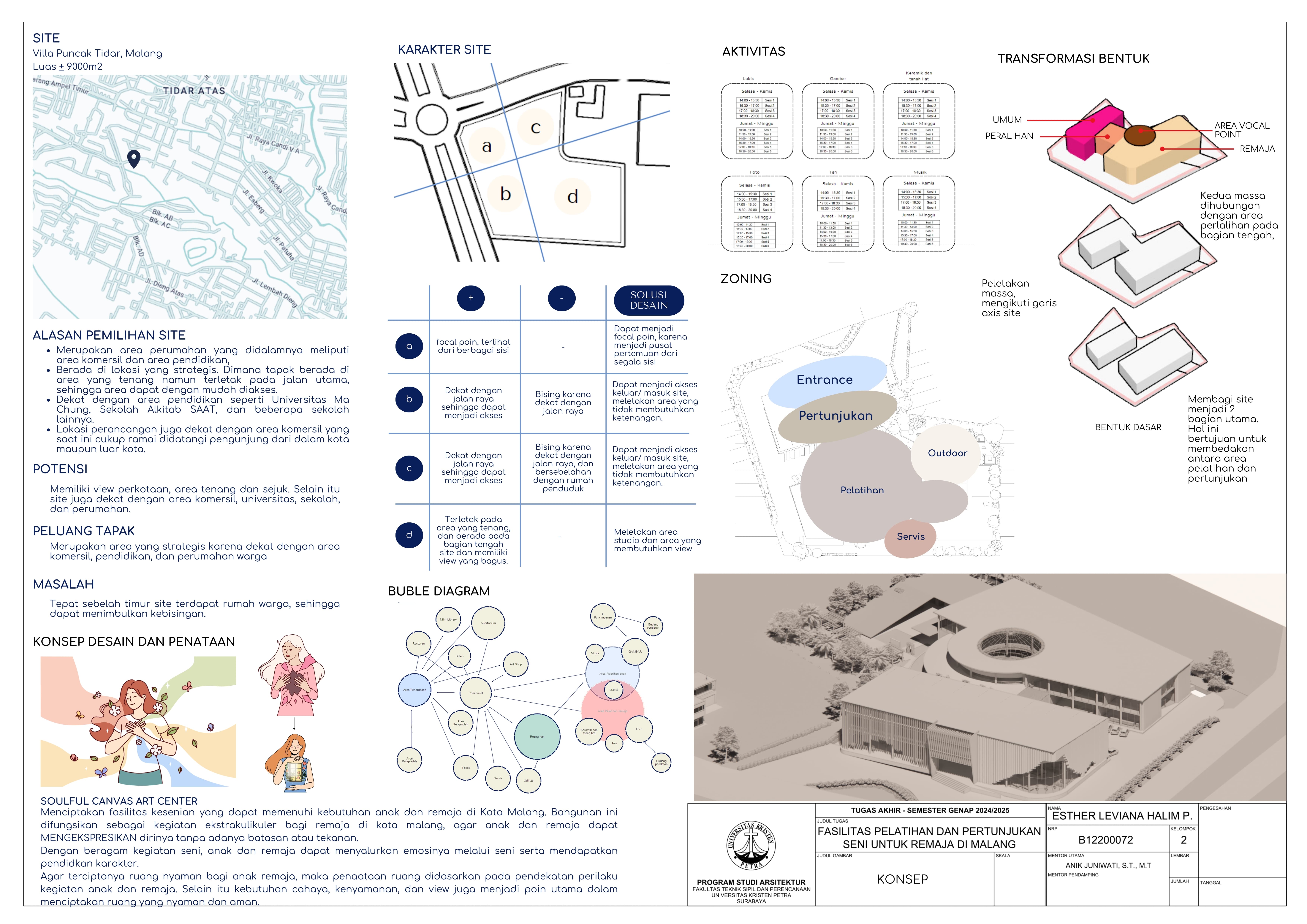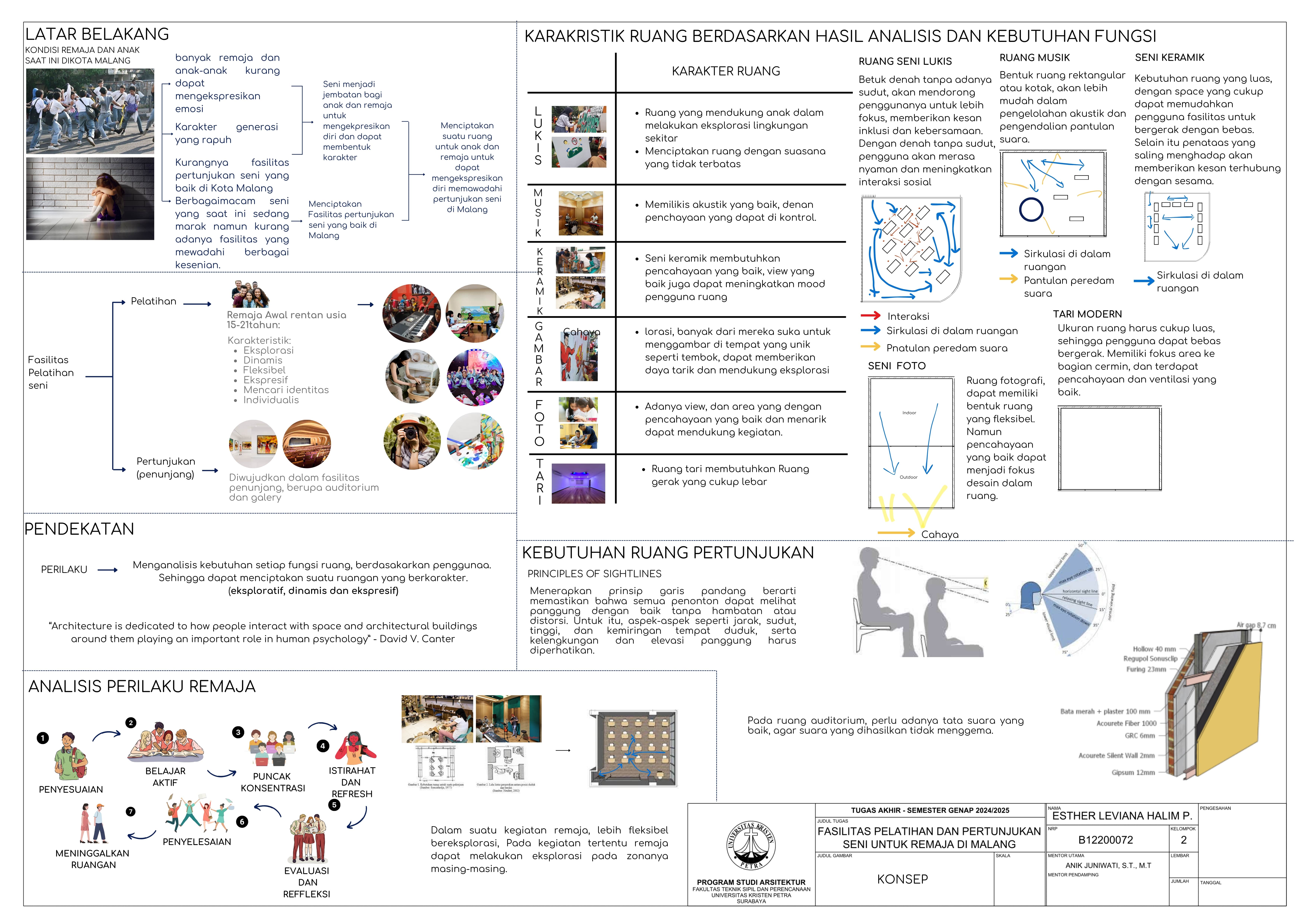 Saat ini, generasi Z berada pada persentase populasi terbanyak di Indonesia. Banyak dari mereka tumbuh di lingkungan yang membentuk mereka menjadi pribadi yang kurang dapat mengekspresikan diri serta memiliki karakter yang rapuh. Untuk menjawab permasalahan generasi Z, seni dapat menjadi salah satu alternatif bagi remaja untuk dapat mengekspresikan diri dan membentuk karakter. Seni sendiri adalah suatu hasil karya manusia yang mengandung keindahan dan dapat diekspresikan melalui gerak ataupun ekspresi lainnya. Dengan adanya fasilitas kesenian dapat menjawab kebutuhan remaja khususnya di Kota Malang, dengan mendorong para remaja untuk dapat menyalurkan ekspresinya dengan baik dan tumbuh menjadi generasi yang tangguh melalui seni. Pada perencanaan desain, dibagi menjadi dua area besar yaitu area fasilitas pelatihan dan area pertunjukan. Pada fasilitas pelatihan dikhususkan untuk pengguna fasilitas yaitu remaja, dengan kegiatan di dalamnya berupa studio untuk kegiatan seni lukis, seni keramik, seni tari, seni musik, seni fotografi, dan seni gambar. Di samping itu pada area pertunjukan remaja dapat memamerkan hasil seninya melalui fasilitas galeri dan juga auditorium, pada area ini pengunjung juga dapat menonton dan melihat hasil karya remaja. Untuk itu perancangan fasilitas ini didesain dengan pendekatan perilaku, sehingga dapat menciptakan setiap ruang dengan karakteristik yang sesuai dengan fungsi di dalamnya dan dapat mendorong remaja untuk dapat berekspresi dengan bebas.