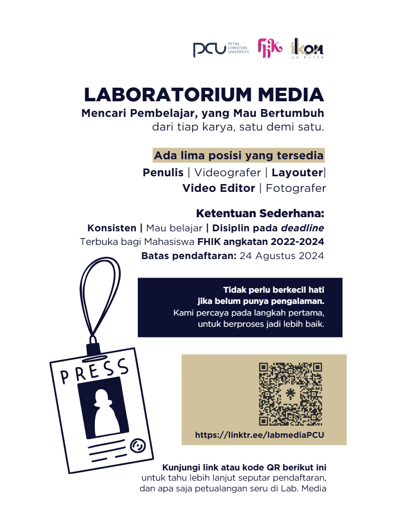 Tim laboratorium media UK Petra Surabaya, membuka kesempatan bagi mahasiswa Ilmu Komunikasi UK Petra Surabaya untuk bergabung dalam tim. Dibutuhkan tenaga untuk penulis dan videografer. Pendaftaran ini ditutup pada tanggal 24 Agustus 2024.