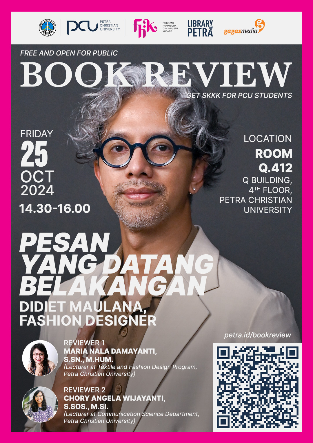 Buku “Pesan yang Datang Belakangan” merupakan sebuah antologi yang menggambarkan berbagai fase kehidupan penulis, dari perayaan hidup hingga pertemuan dan kehilangan. Buku ini berisi refleksi mendalam dari pengalaman pribadi yang jarang dibicarakan, disajikan dalam bentuk pesan dan sajak. Setiap babak dalam buku ini menggambarkan perjalanan yang mengajak pembaca untuk merenungkan makna kehidupan, cinta, dan epiphany atau kesadaran yang datang belakangan. Kegiatan bedah buku ini bertujuan untuk membuka ruang diskusi dan apresiasi atas cerita-cerita yang menyentuh dan relevan dengan perjalanan hidup setiap individu. Acara bedah buku ini diselenggarakan pada 25 Oktober 2024 jam 14.30 - 16.00 WIB. bertempat di gedung Q.412. lantai 4.