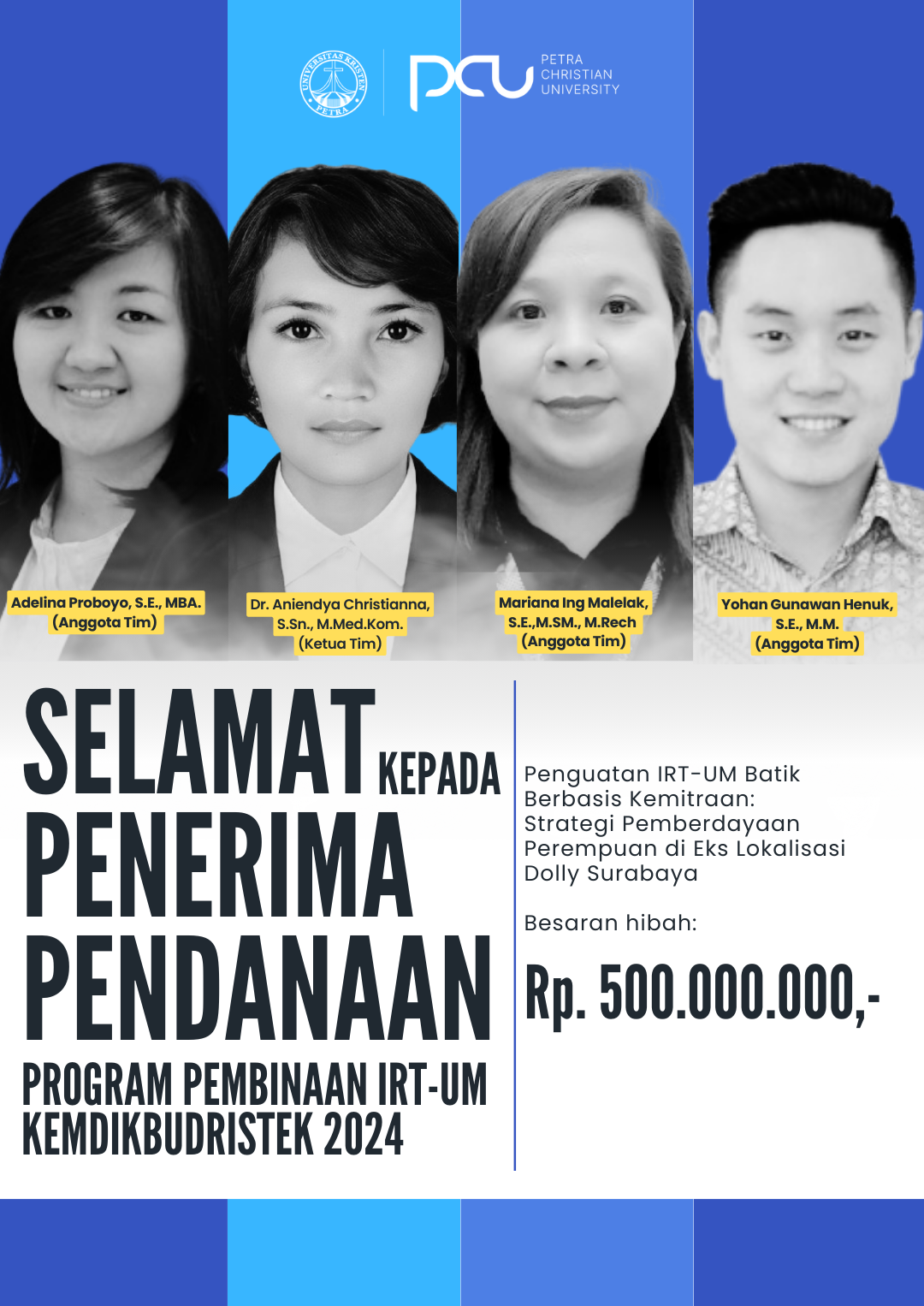 Ucapan selamat kepada Penerima Program Pendanaan IRT-UM dari DIKTI tahun anggaran 2024. Dosen yang mendapatkan dana ini ialah Dr. Aniendya Christianna sebagai ketua tim dengan anggota Adelina Praboyo, MBA dan Mariana Ing Malelak, M.Sm., M.Rech., dan Yohan Gunawan Henuk, M.M