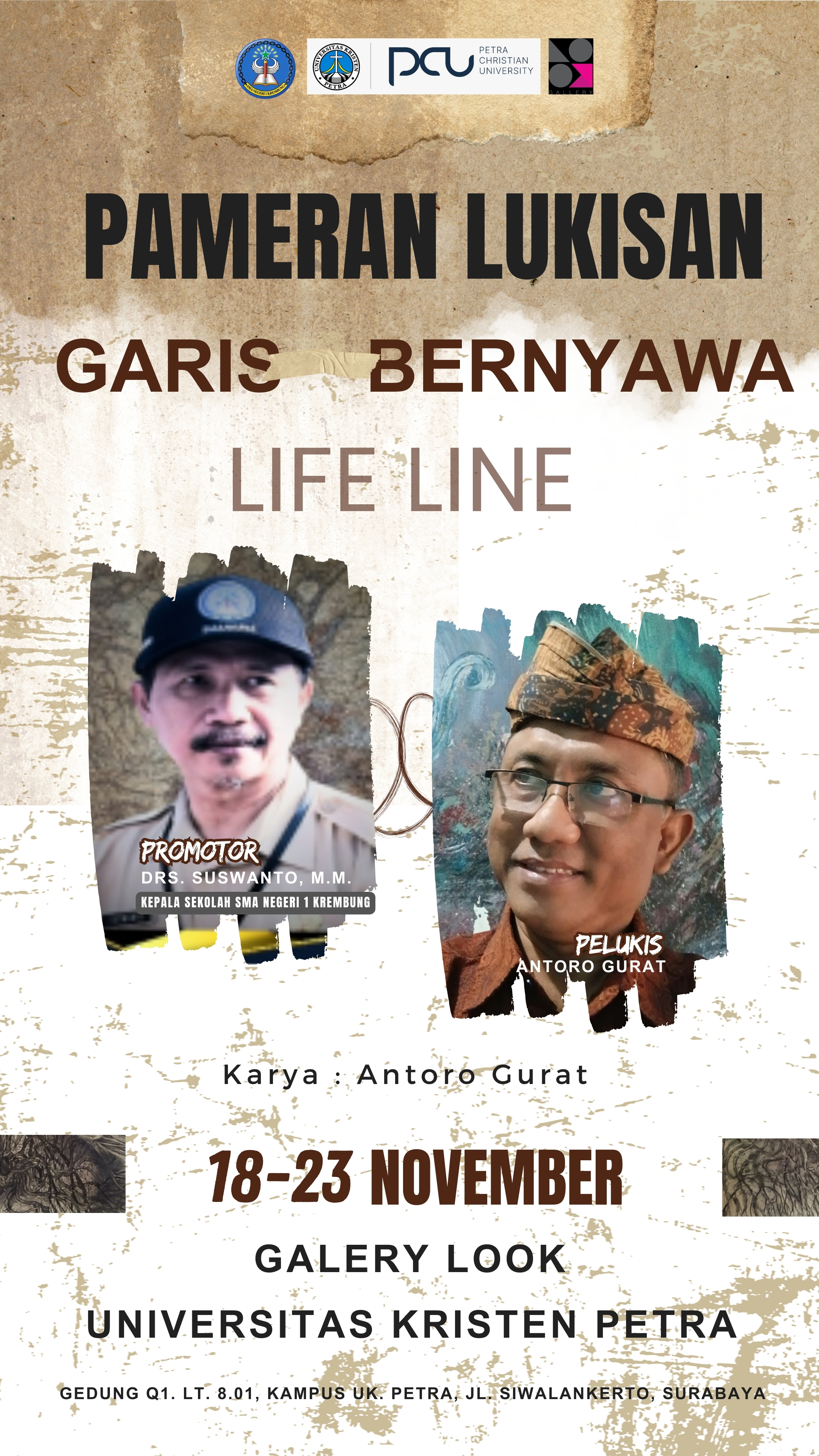 Pameran tunggal lukisan karya Antoro Gurat dengan tema "garis bernyawa". Akan diselenggarakan oleh Fakultas Humaniora dan Industri Kreatif UK Petra pada tanggal 18-23 November 2024 bertempat di Galery Look Universitas Kristen Petra.