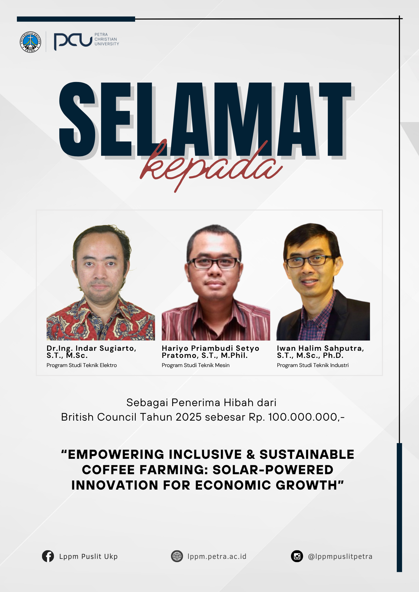 Selamat atas prestasi yang diraih oleh Dr.Ing.Indar Sugiarto, Hariyo Priambudi Setyo Pratomo, S.T., M.Phil., dan Iwan Halim Sahputra, Ph.D. sebagai penerima hibah dari British Council tahun 2025.