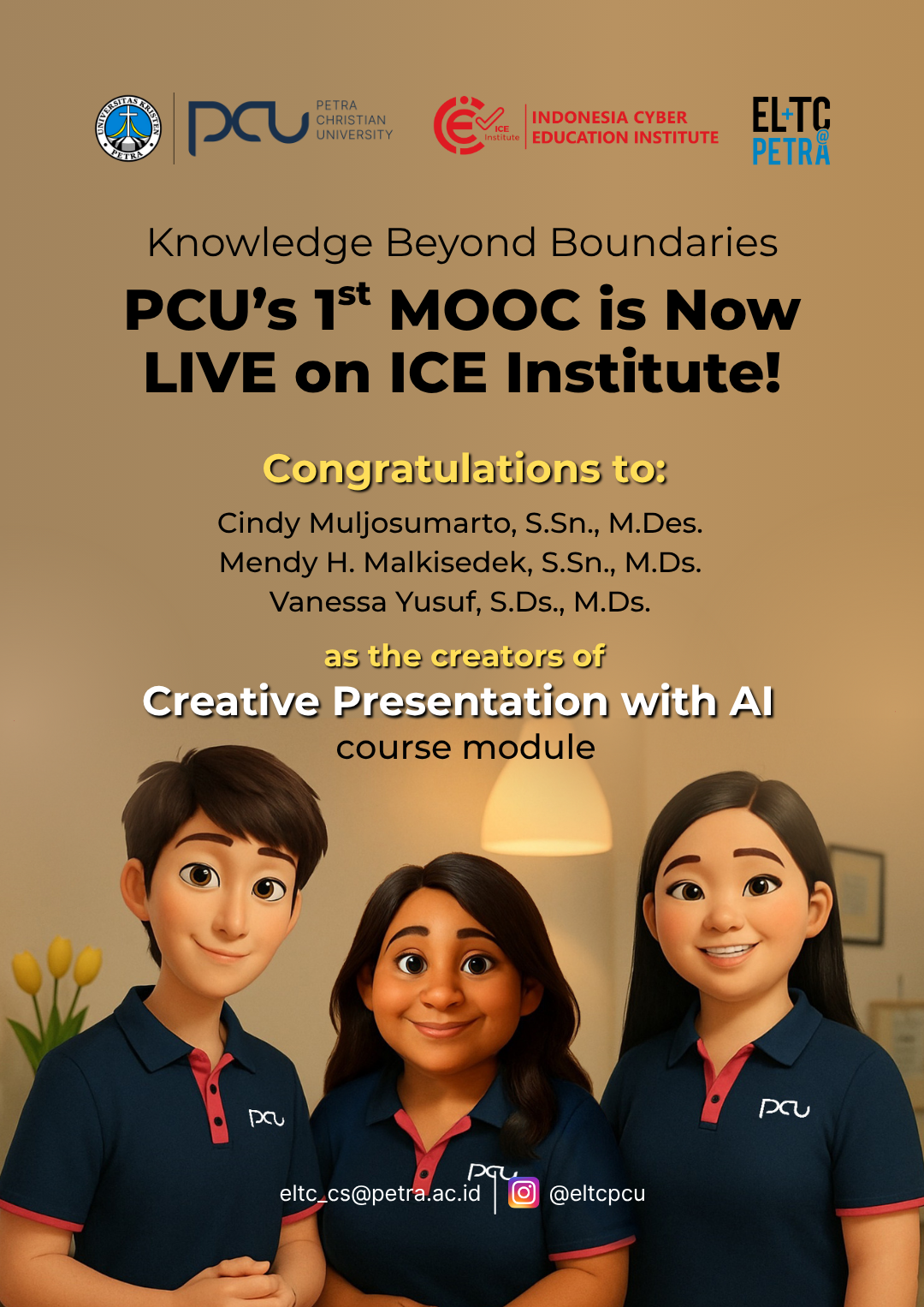 Selamat buat Cindy Muljosumarto, S.Sn., M.Des., Dan Mendy H. Malkisedek, S.Sn., M. Ds., dan Vanessa Yusuf, S.Ds., M.Ds. atas prestasinya yang telah membuat modul pembelajaran menggunakan AI.