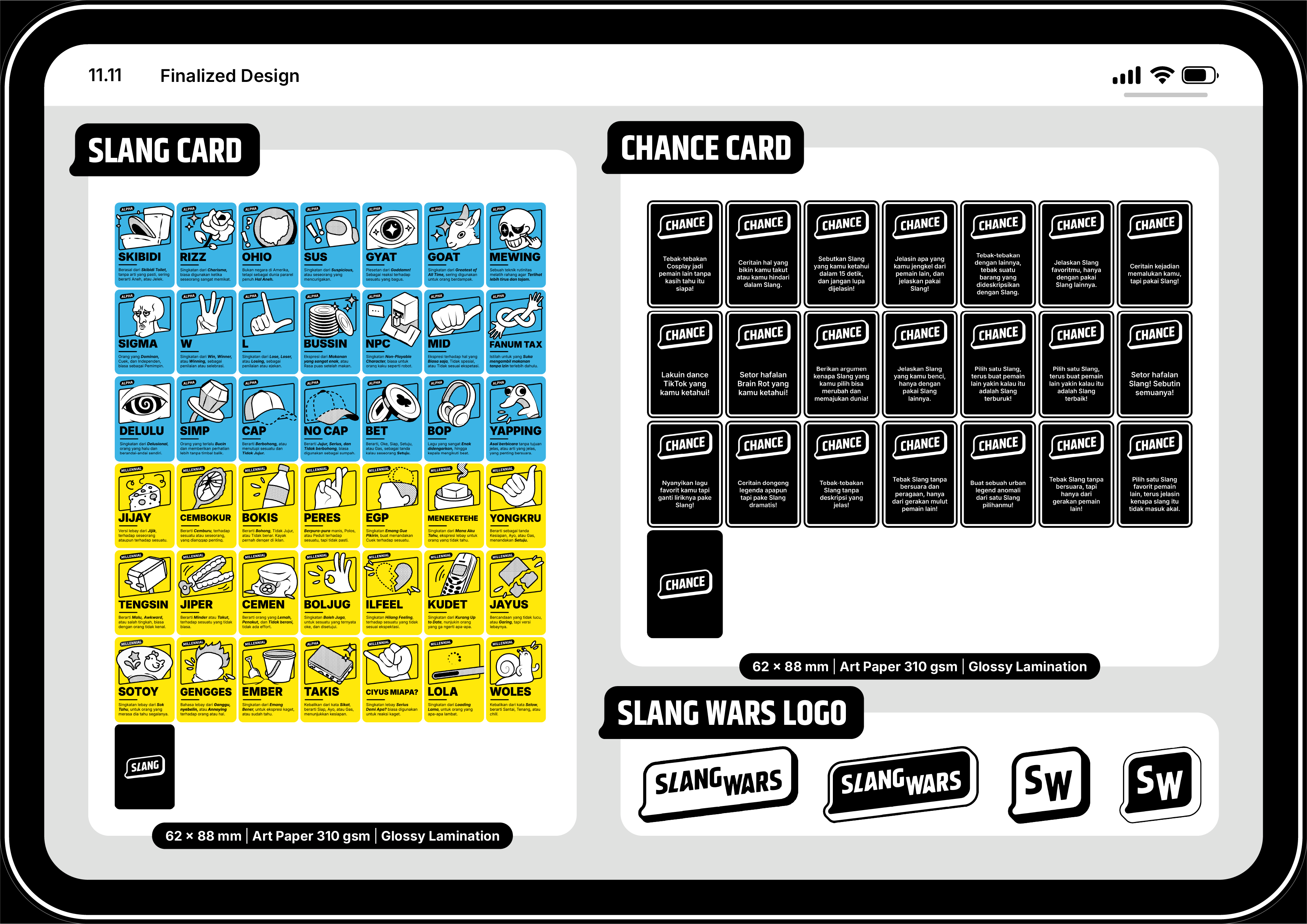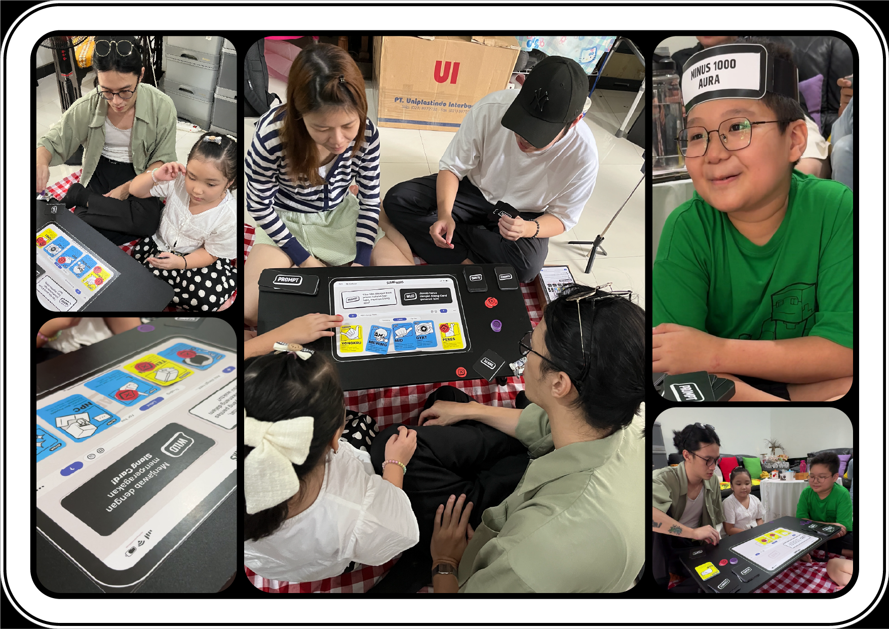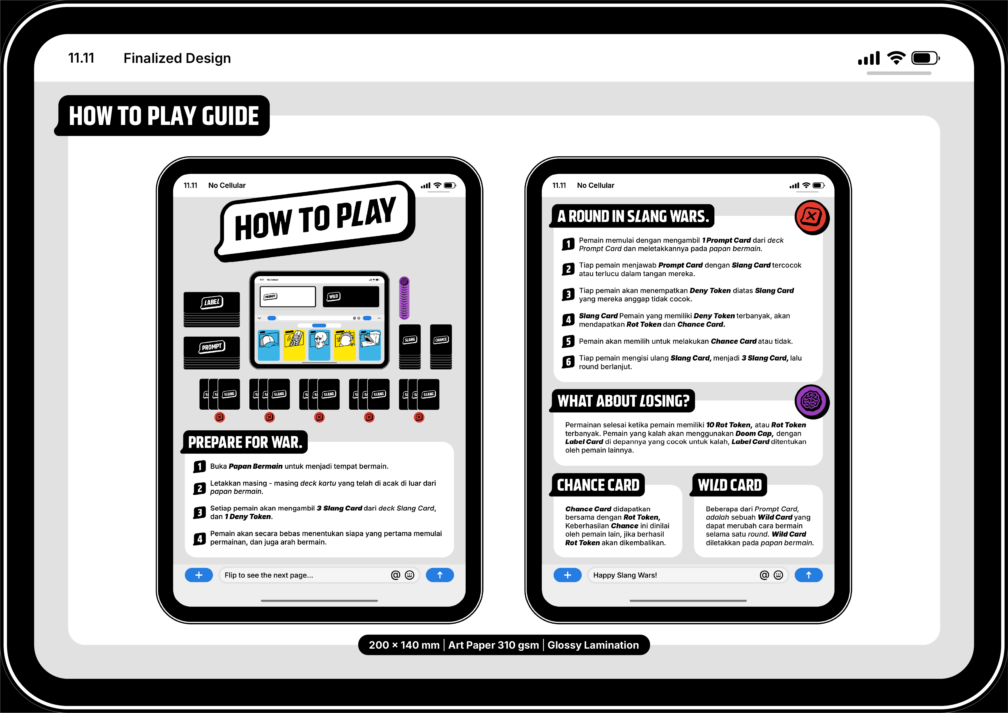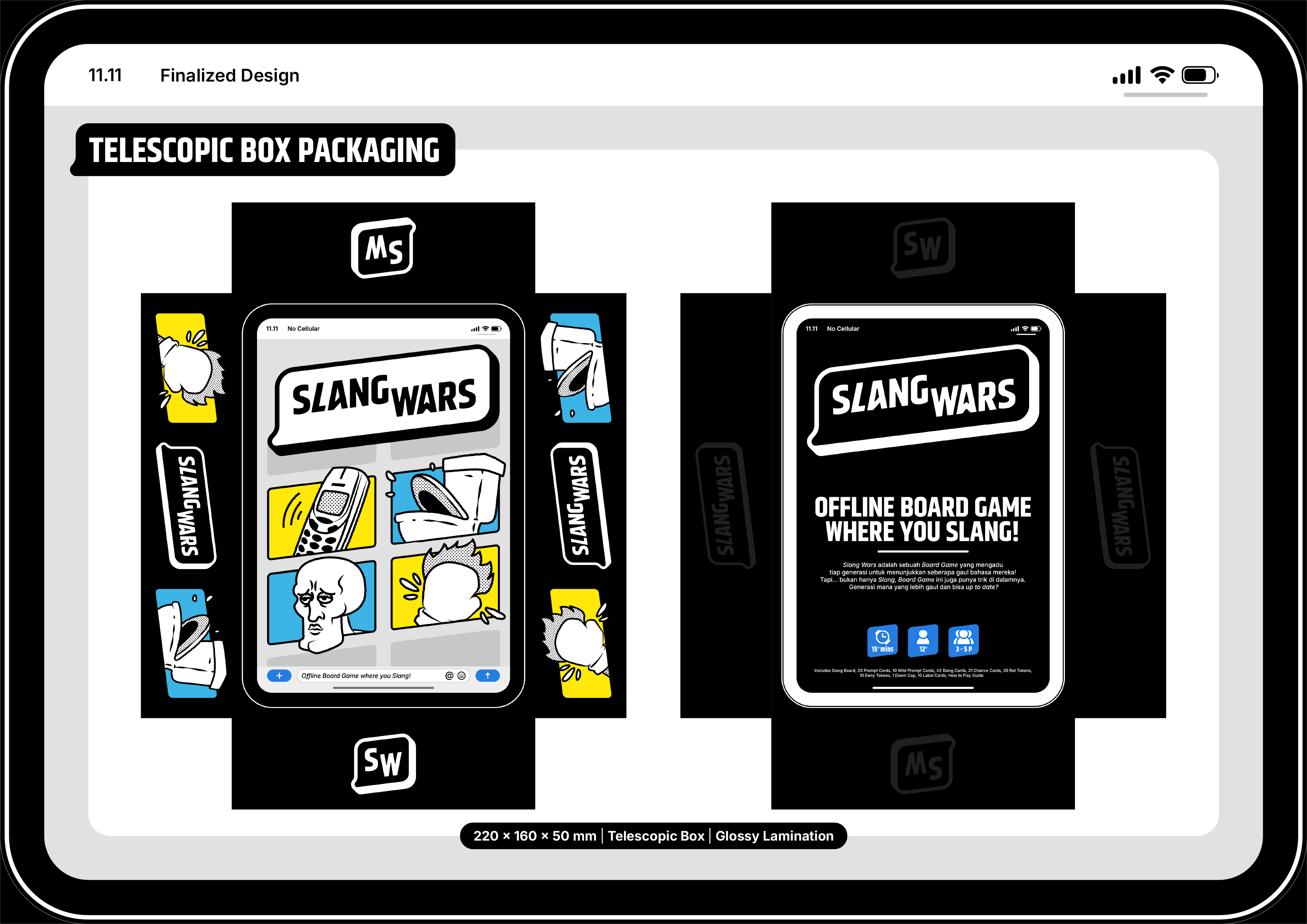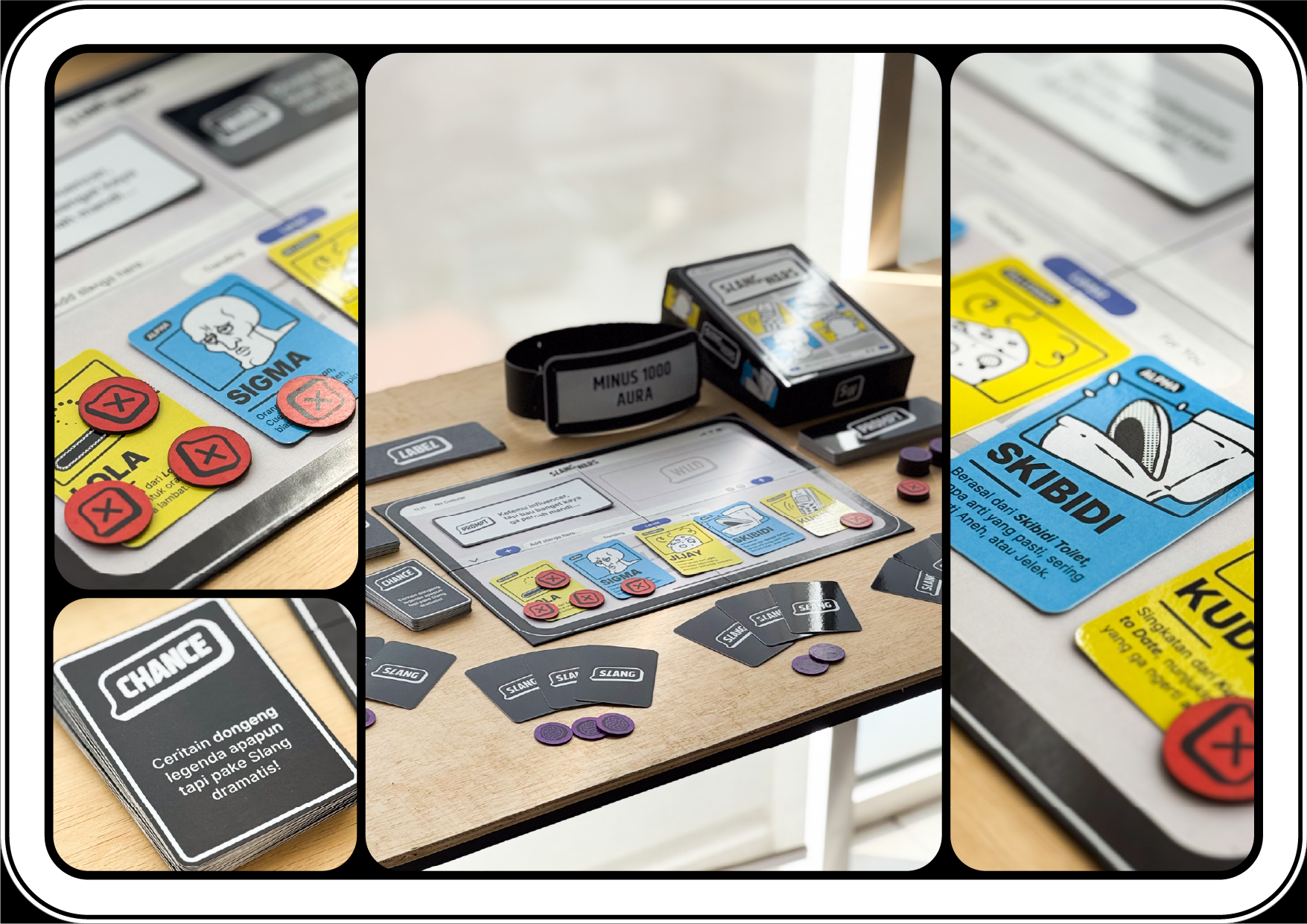 Perbedaan generasi sering kali menciptakan generation gap, terutama antara generasi Millennial dan generasi Alpha. Salah satu faktor utama dari generation gap ini adalah perbedaan dalam penggunaan bahasa, referensi budaya, serta cara berkomunikasi yang terus berkembang. Skripsi tugas akhir ini bertujuan untuk merancang sebuah board game interaktif yang dapat membantu menjembatani permasalahan miskomunikasi antara kedua generasi. Board game ini dirancang dengan mekanisme permainan tantangan, di mana pemain dari kedua generasi harus berperang untuk memahami serta menggunakan slang language. Desain permainan mendorong interaksi positif dan pemahaman antar generasi. Melalui proses uji coba, board game ini diharapkan dapat meningkatkan kesadaran, toleransi, dan keterampilan komunikasi antar generasi, sehingga memperkecil miskomunikasi yang terjadi dalam lingkungan keluarga maupun sosial. Dengan konsep yang fleksibel dan mudah dimainkan, board game ini diharapkan menjadi media alternatif yang mampu mempererat hubungan antara generasi Millennial dan Alpha dengan cara yang menyenangkan dan interaktif.