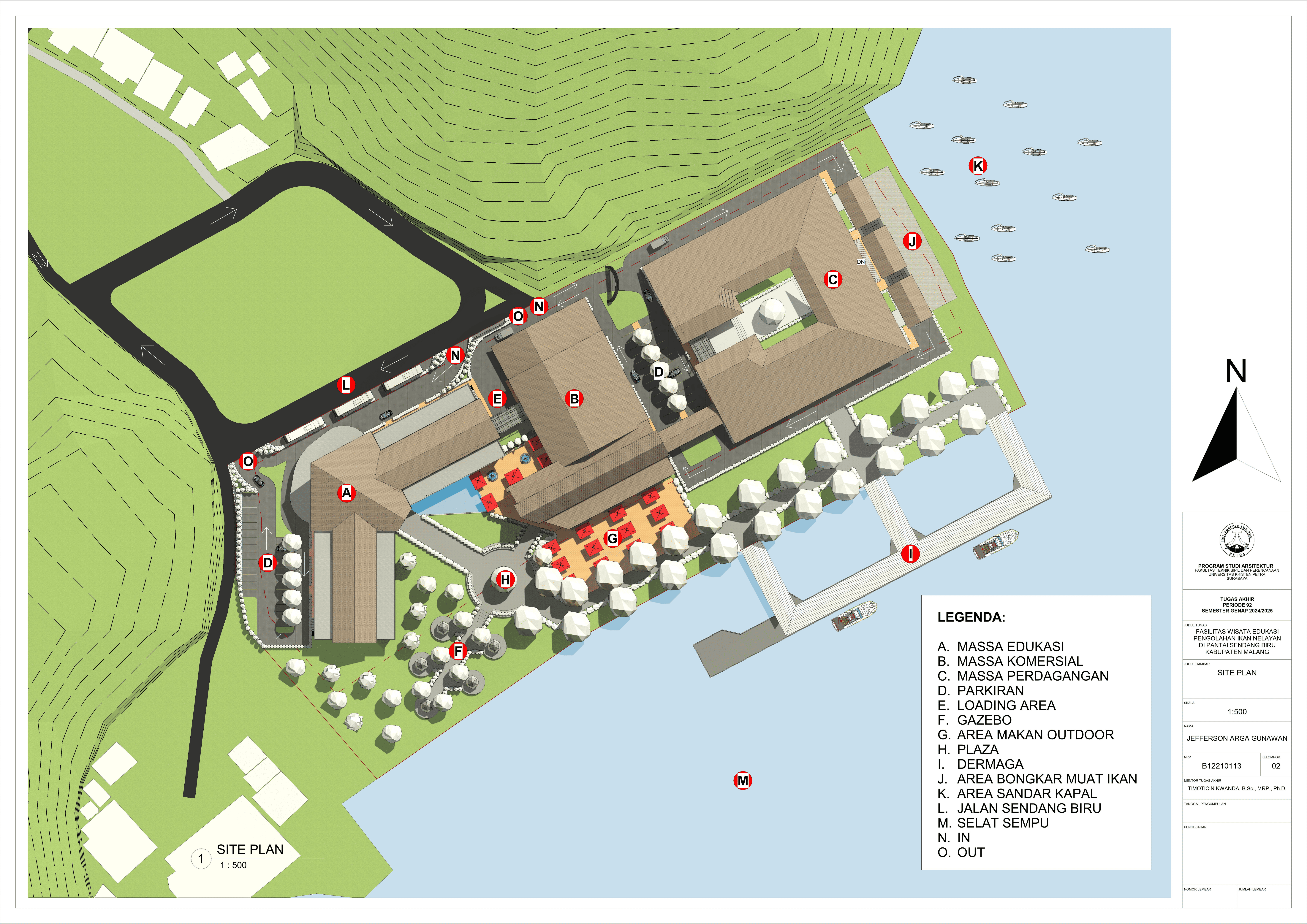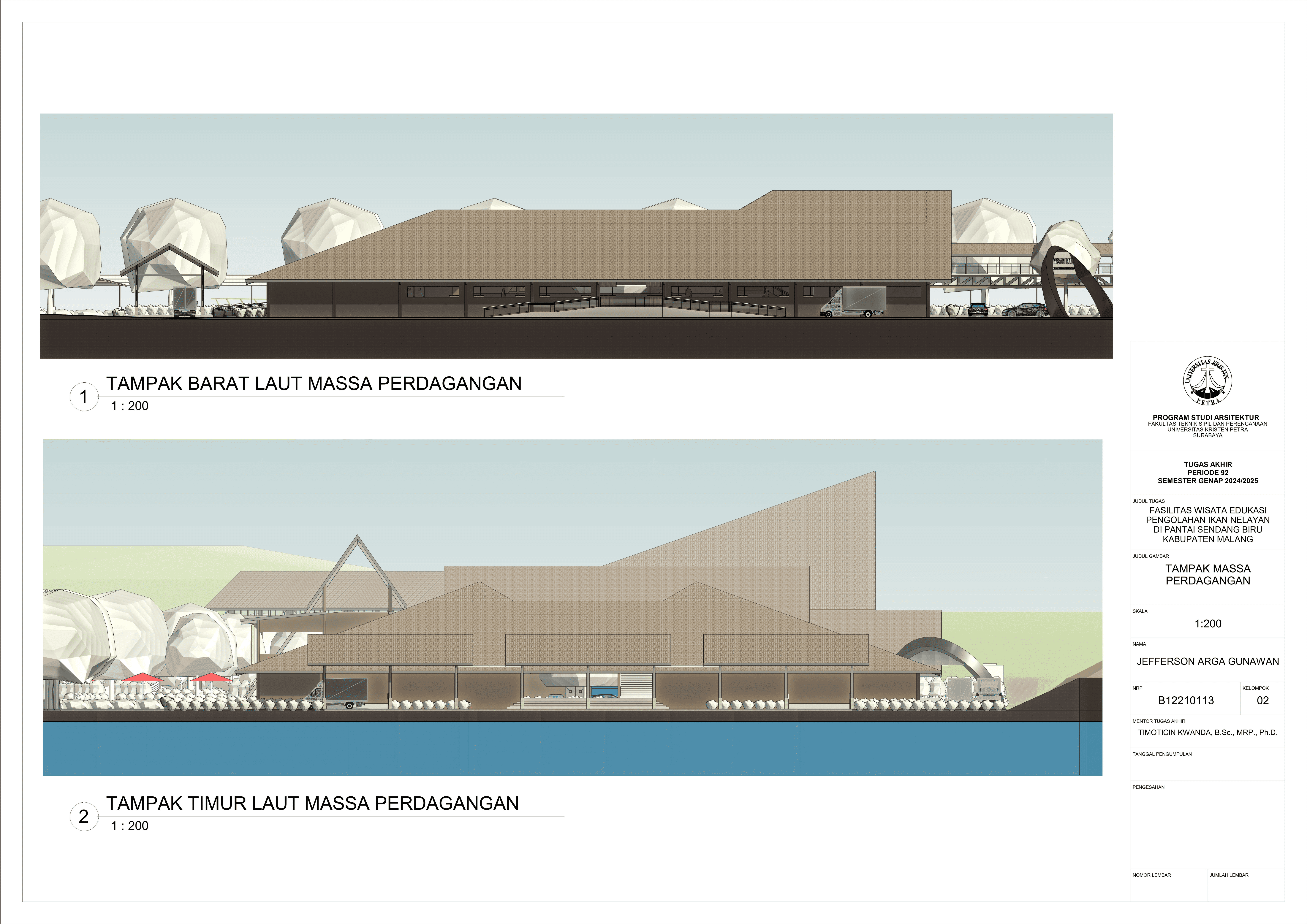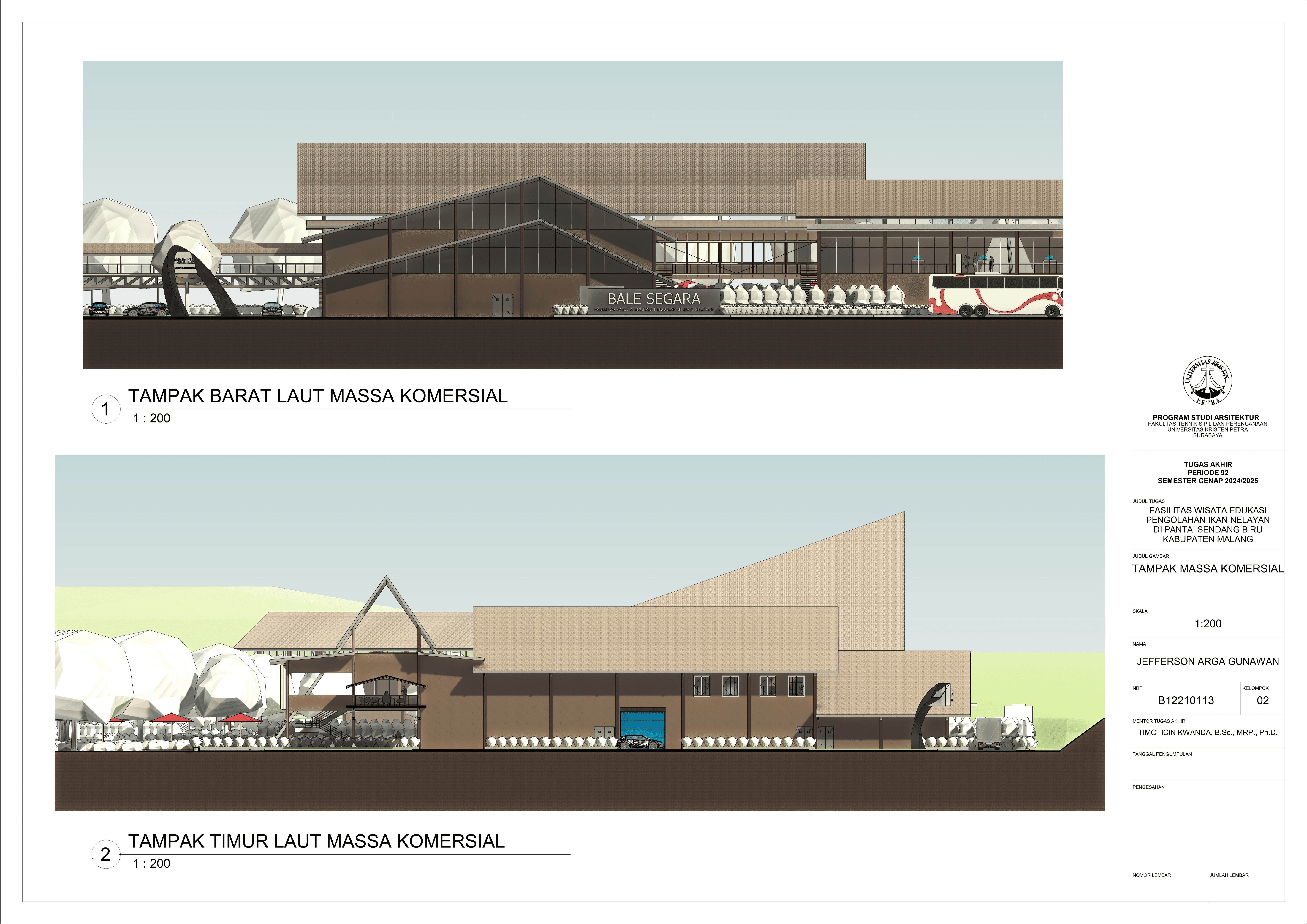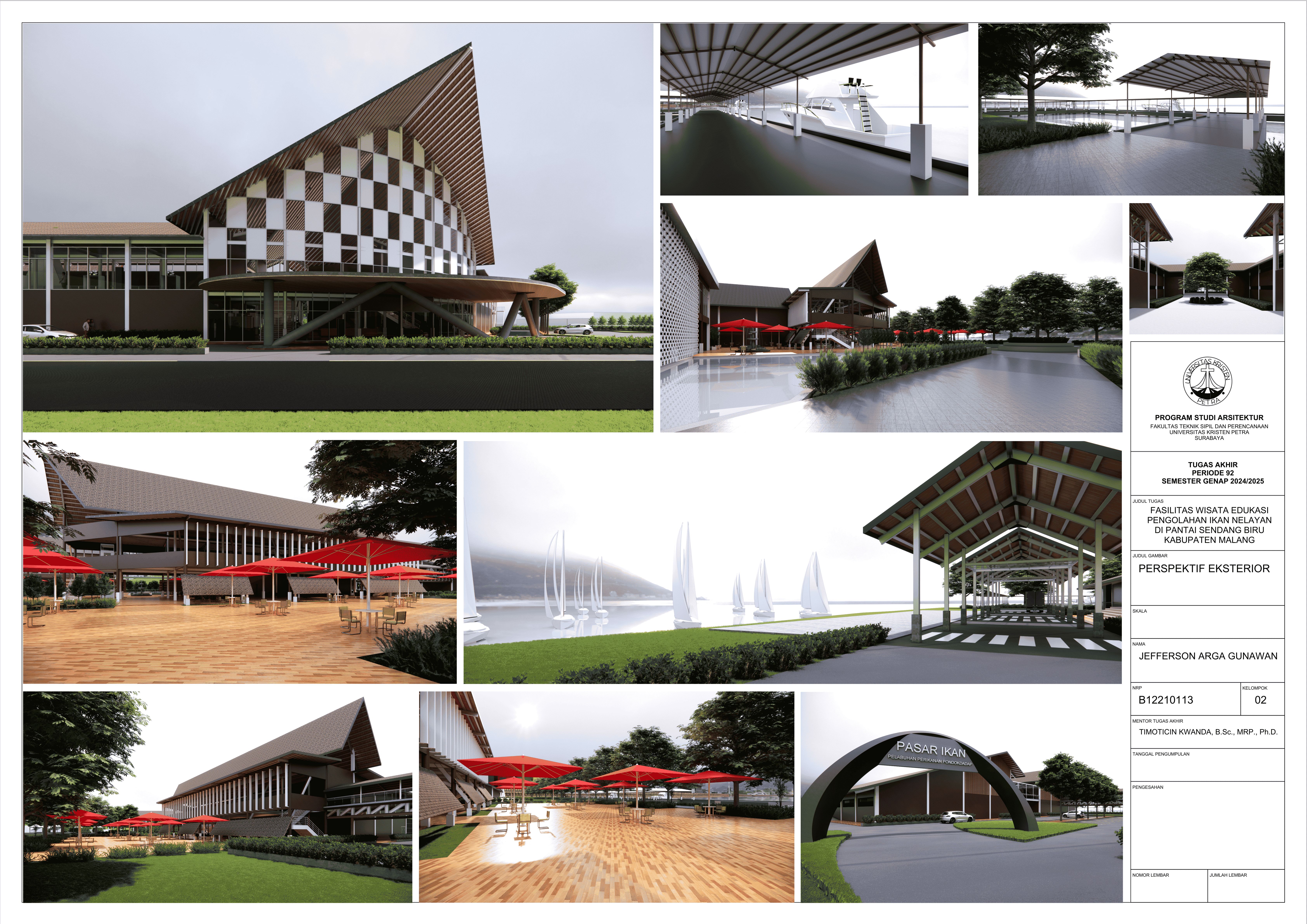 Perancangan fasilitas wisata edukasi di Pantai Sendang Biru bertujuan untuk mengatasi kebutuhan terhadap sarana dalam mengoptimalkan potensi wisata dan edukasi di kawasan pesisir tersebut. Permasalahan utama dalam perancangan fasilitas ini yaitu merancang sebuah bangunan yang tidak hanya informatif tetapi juga memberikan pengalaman kepada pengguna dan mampu mengatasi bau dari aktivitas perikanan pada area tersebut. Konsep perancangan yang digunakan menggunakan pendekatan spasial terhadap hubungan antar ruang dan pendalaman multisensori dengan menggunakan indera agar merasakan pengalaman ruang secara menyeluruh yang nantinya akan menghasilkan parameter desain berupa fleksibilitas ruang, interaksi antar pengguna, dan penggunakan indera. Proses perancangan ini nantinya akan menghasilkan tiga massa dengan fungsi bangunan masing-masing yang saling terhubung melalui ruang transisi dengan mengoptimalkan potensi view dan sirkulasi udara alami agar mendukung pengalaman pengunjung secara menyeluruh. Hasil rancangan ini diharapkan mampu menghasilkan sarana yang dapat menyatukan aktivitas nelayan dengan pengalaman wisata yang informatif dan menghidupkan kembali budaya lokal melalui pengalaman nyata dari proses perikanan. Desain ini tidak hanya menjawab kebutuhan edukasi dan wisata tetapi juga menjadi kontribusi terhadap pemberdayaan ekonomi dan identitas lokal masyarakat setempat.