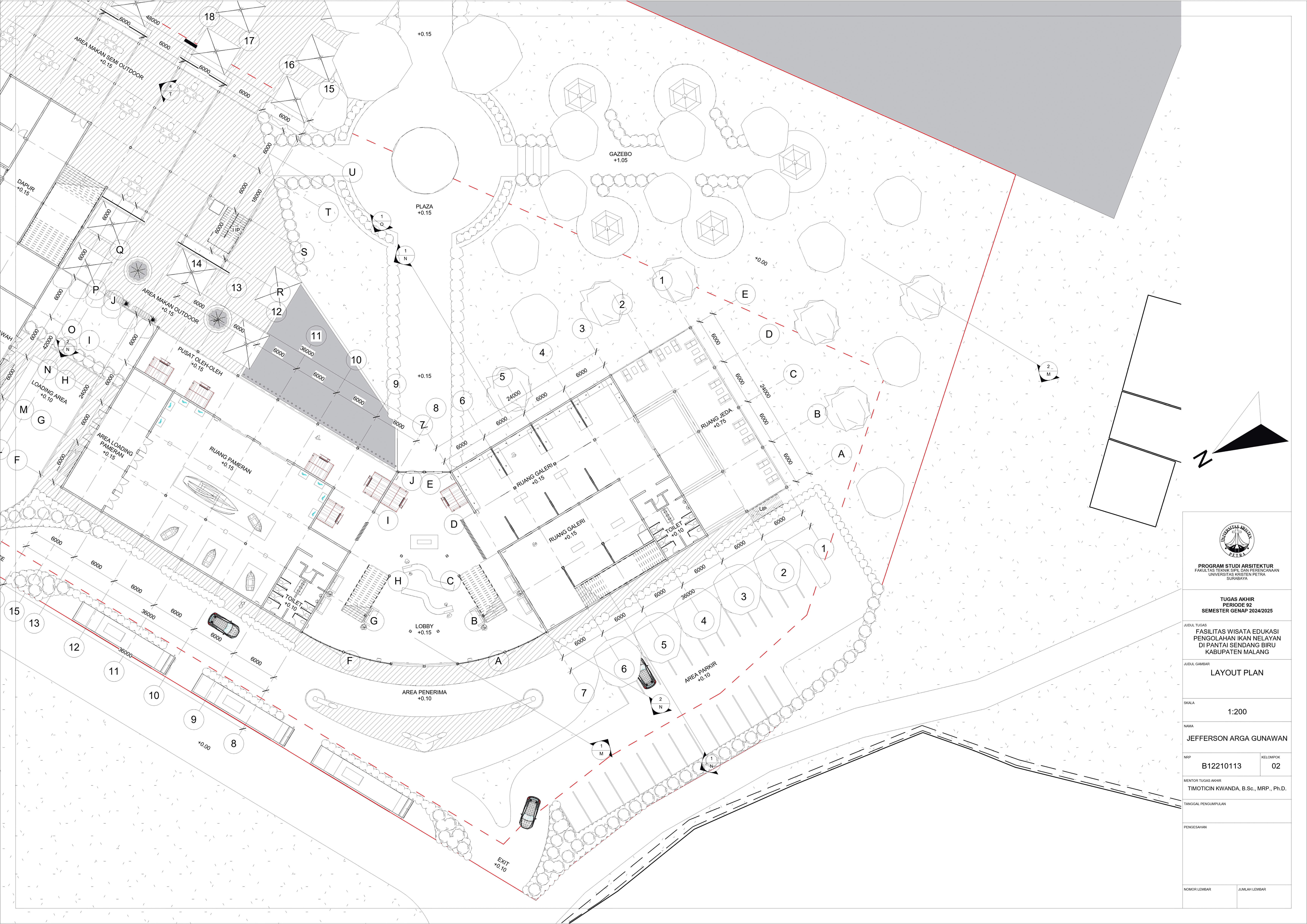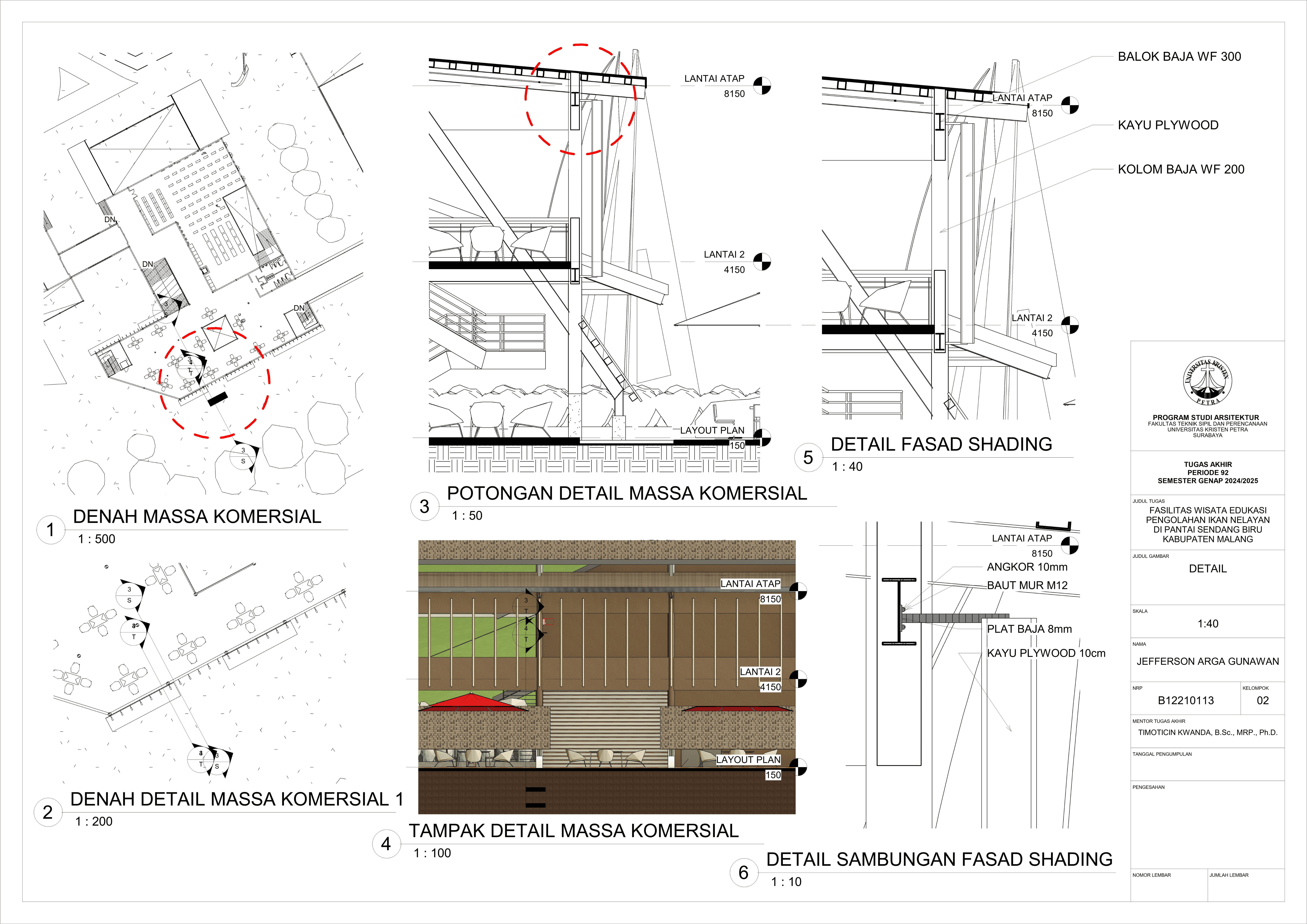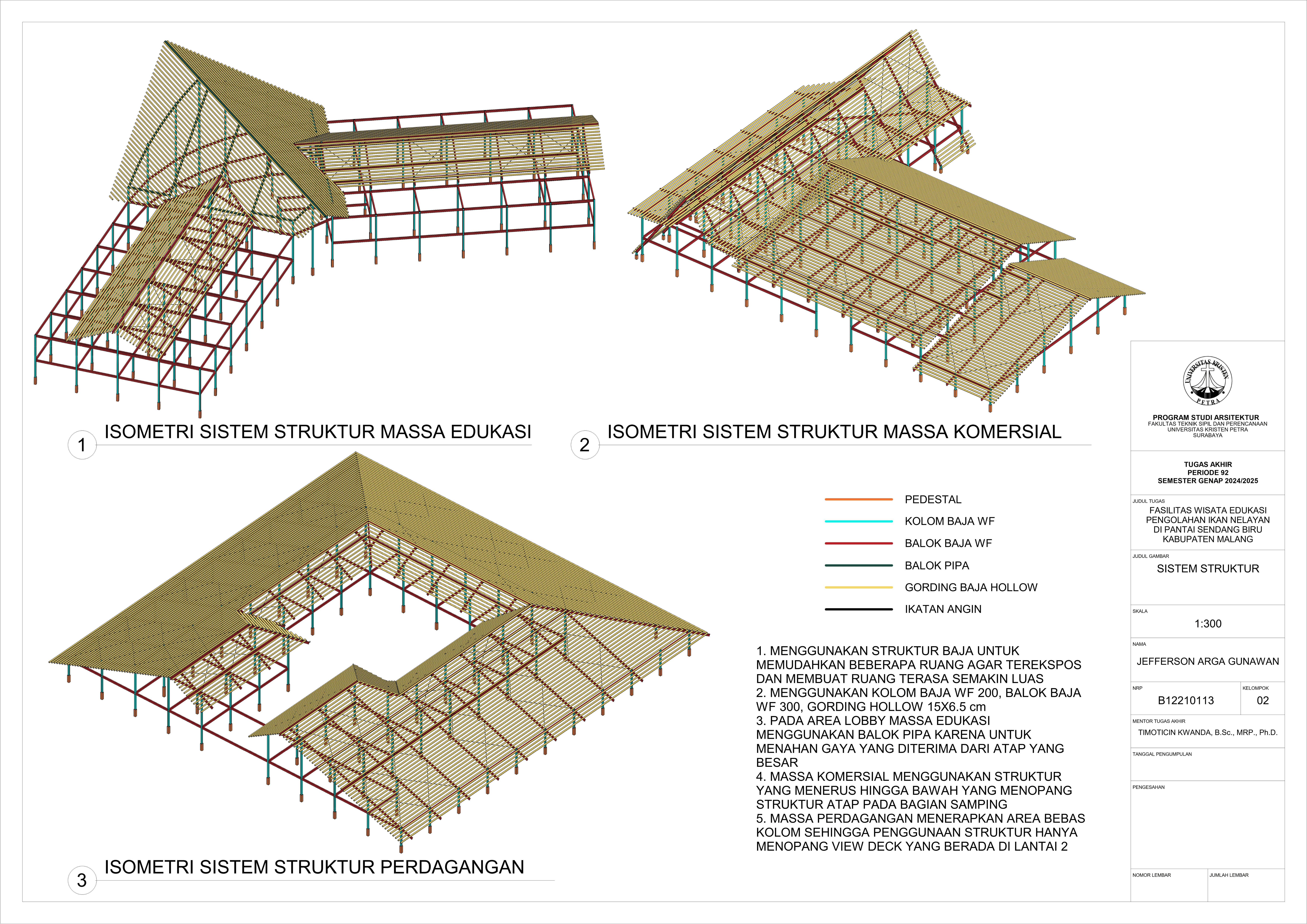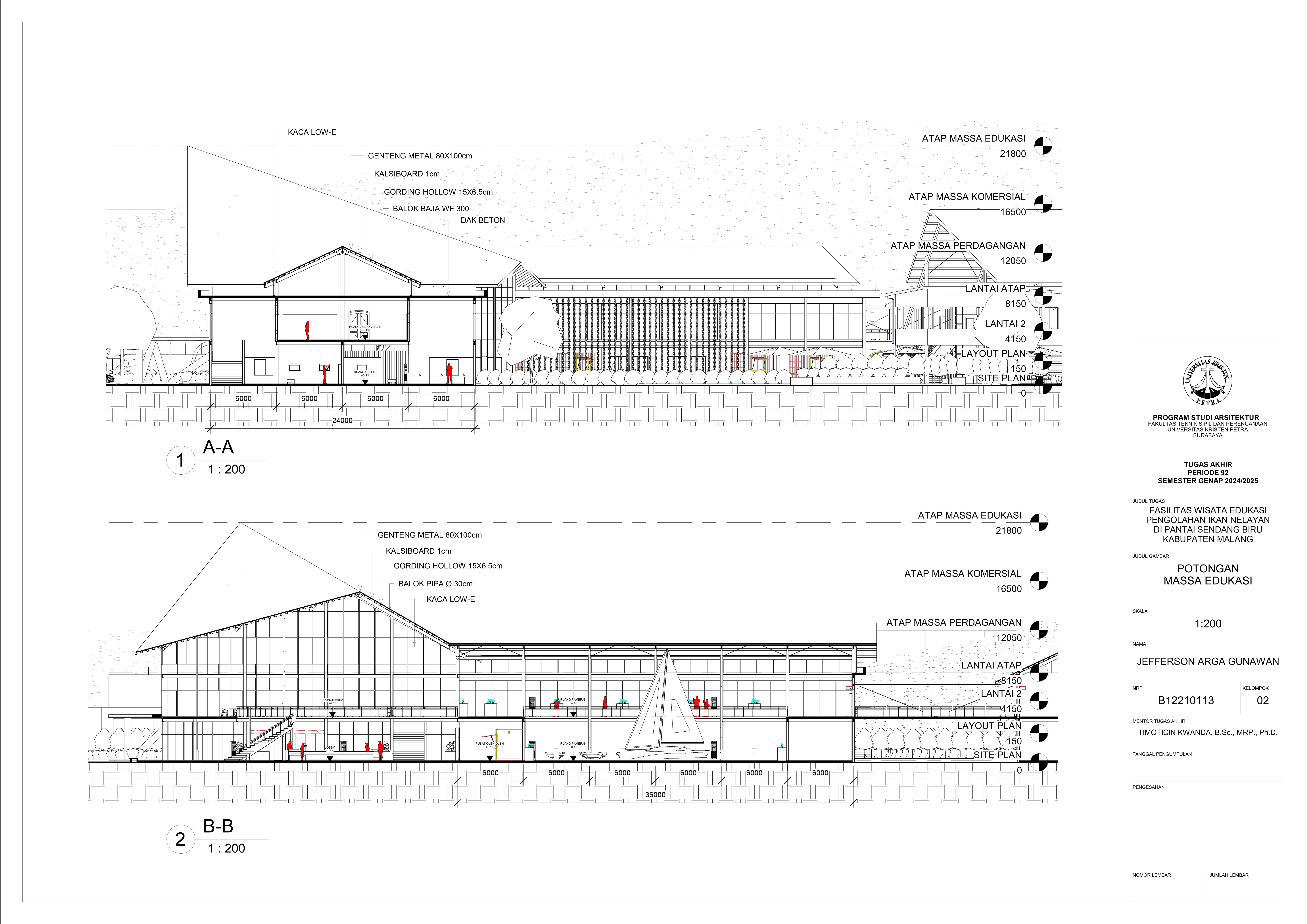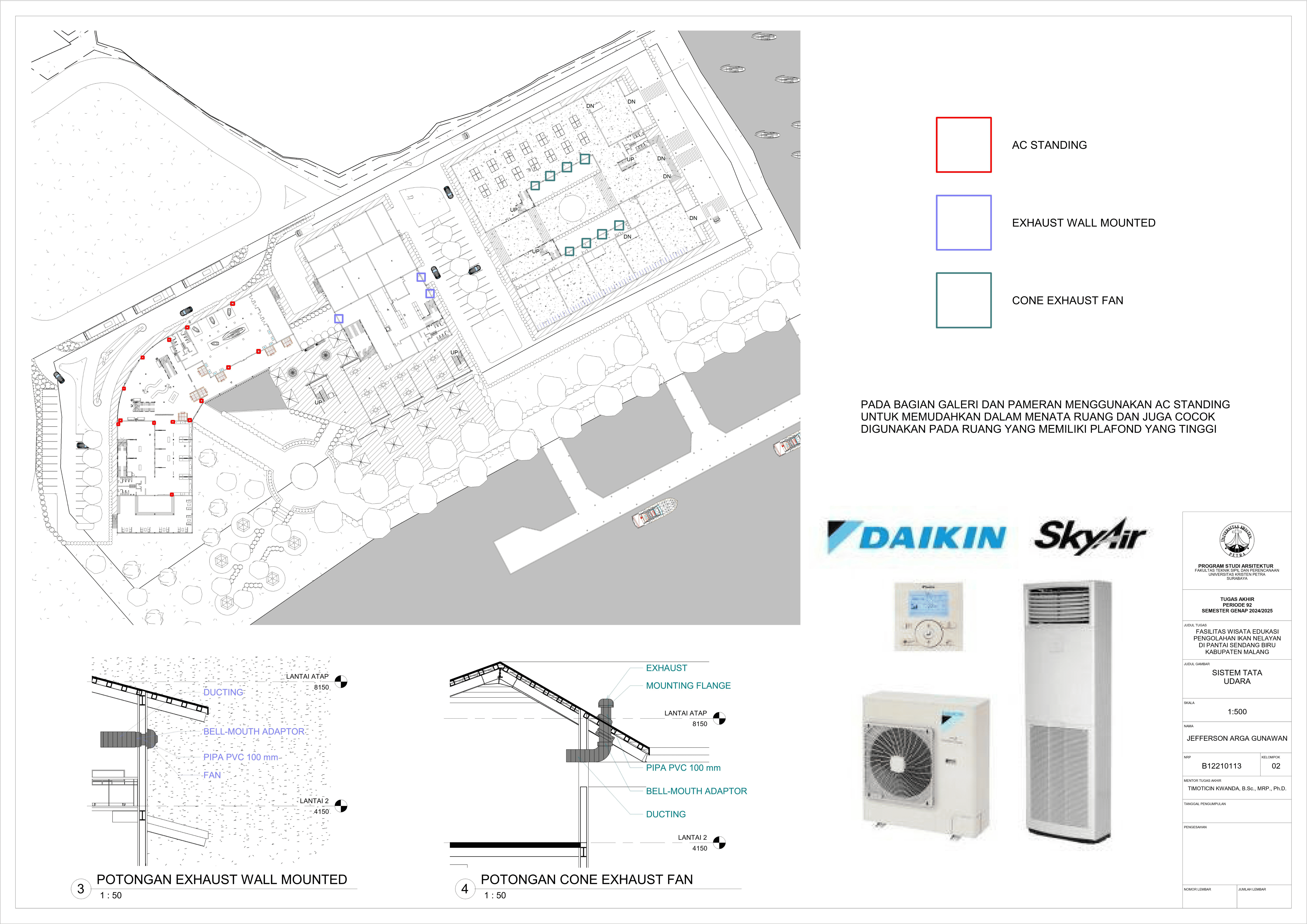 Perancangan fasilitas wisata edukasi di Pantai Sendang Biru bertujuan untuk mengatasi kebutuhan terhadap sarana dalam mengoptimalkan potensi wisata dan edukasi di kawasan pesisir tersebut. Permasalahan utama dalam perancangan fasilitas ini yaitu merancang sebuah bangunan yang tidak hanya informatif tetapi juga memberikan pengalaman kepada pengguna dan mampu mengatasi bau dari aktivitas perikanan pada area tersebut. Konsep perancangan yang digunakan menggunakan pendekatan spasial terhadap hubungan antar ruang dan pendalaman multisensori dengan menggunakan indera agar merasakan pengalaman ruang secara menyeluruh yang nantinya akan menghasilkan parameter desain berupa fleksibilitas ruang, interaksi antar pengguna, dan penggunakan indera. Proses perancangan ini nantinya akan menghasilkan tiga massa dengan fungsi bangunan masing-masing yang saling terhubung melalui ruang transisi dengan mengoptimalkan potensi view dan sirkulasi udara alami agar mendukung pengalaman pengunjung secara menyeluruh. Hasil rancangan ini diharapkan mampu menghasilkan sarana yang dapat menyatukan aktivitas nelayan dengan pengalaman wisata yang informatif dan menghidupkan kembali budaya lokal melalui pengalaman nyata dari proses perikanan. Desain ini tidak hanya menjawab kebutuhan edukasi dan wisata tetapi juga menjadi kontribusi terhadap pemberdayaan ekonomi dan identitas lokal masyarakat setempat.