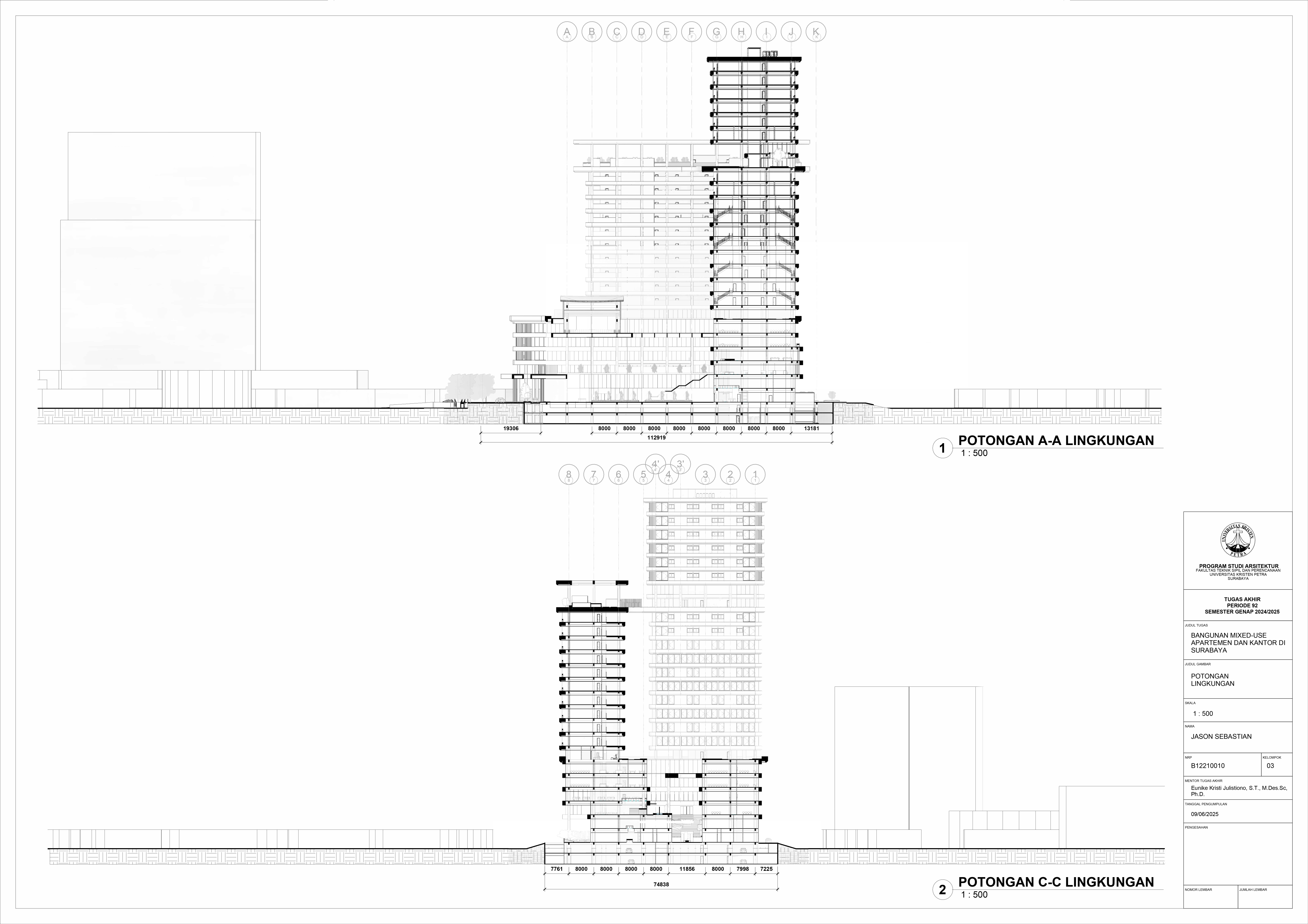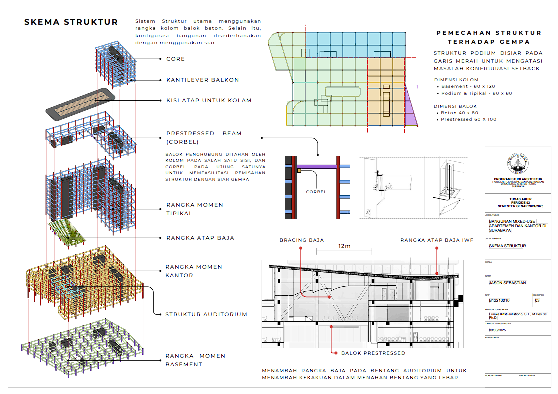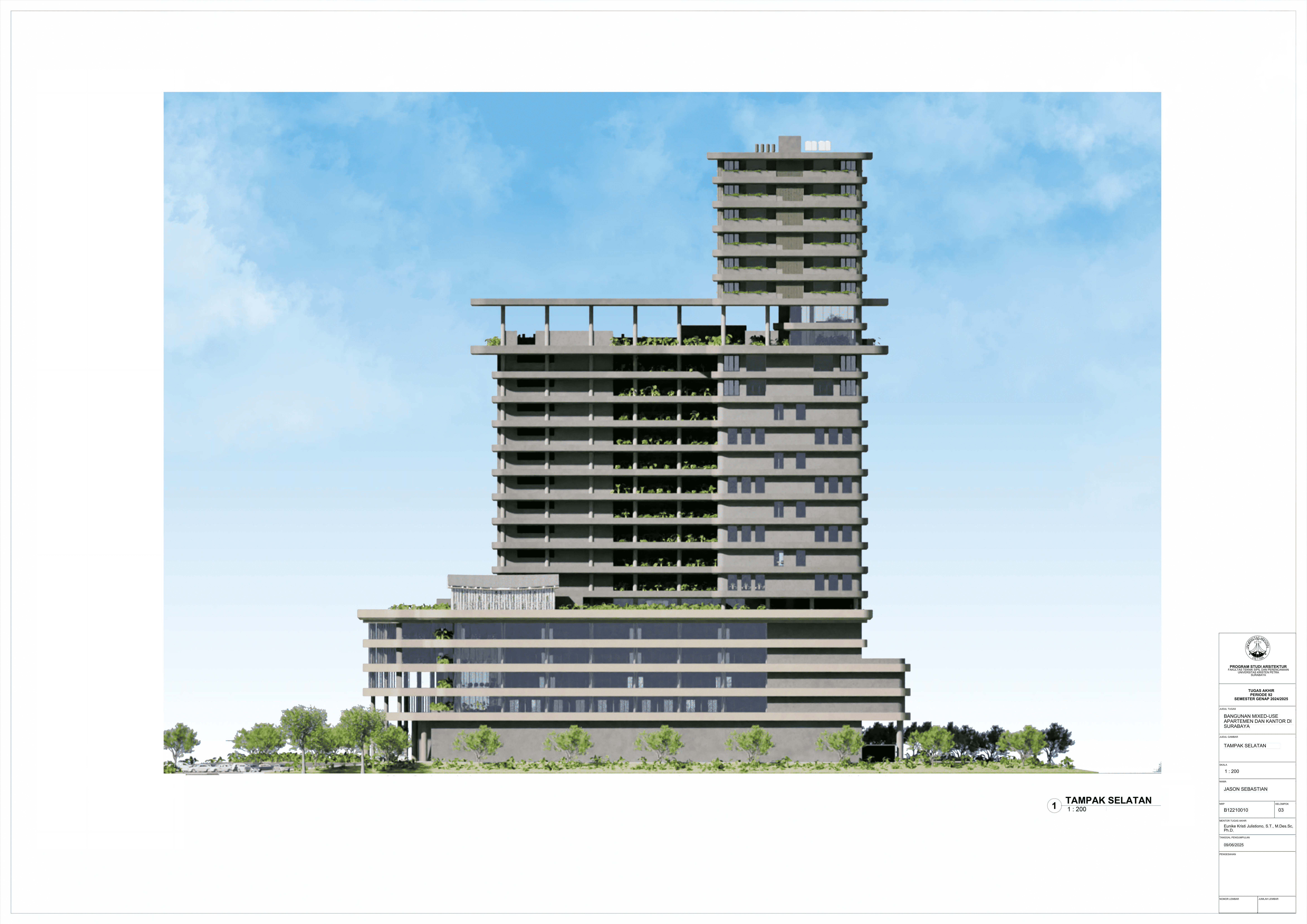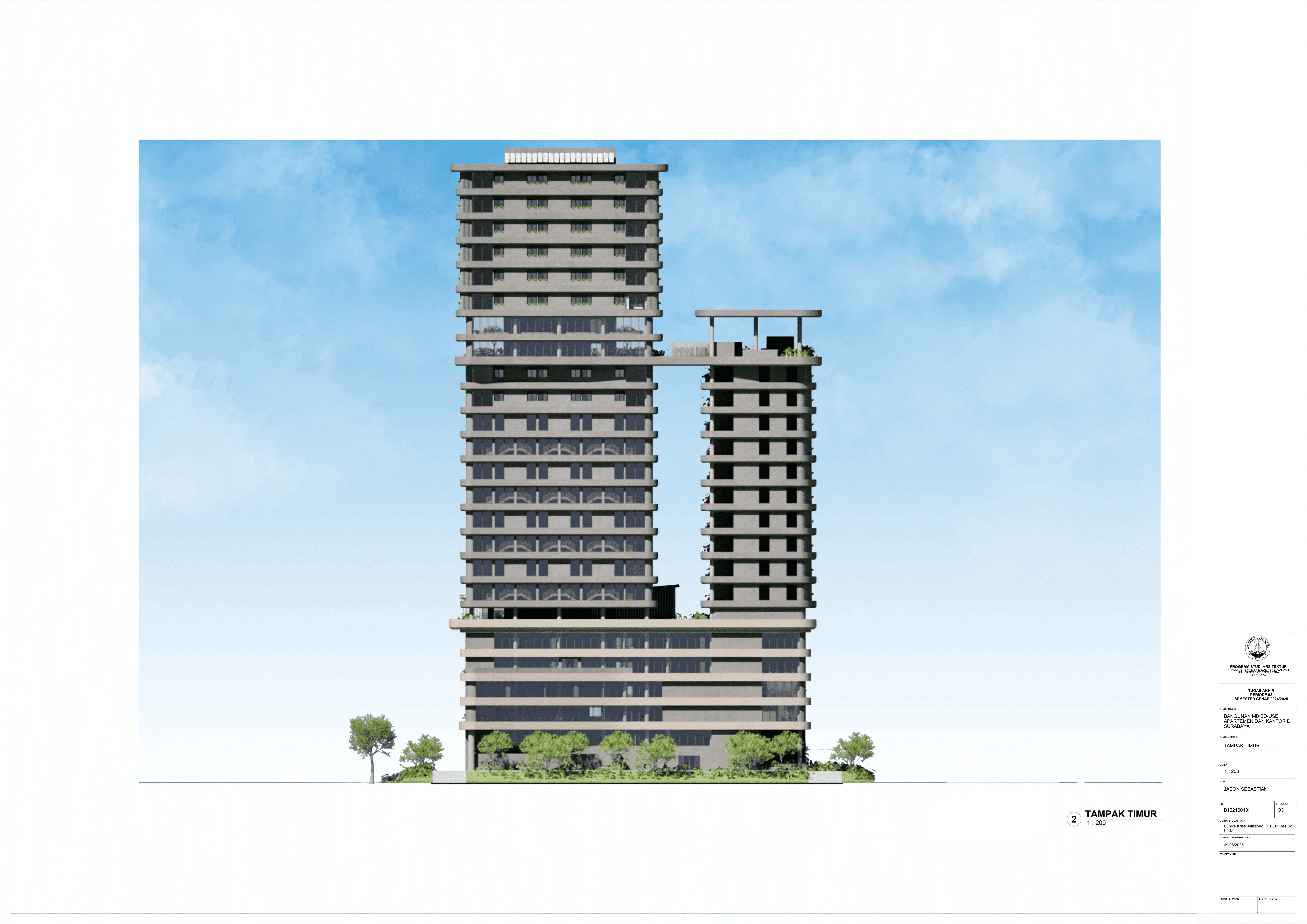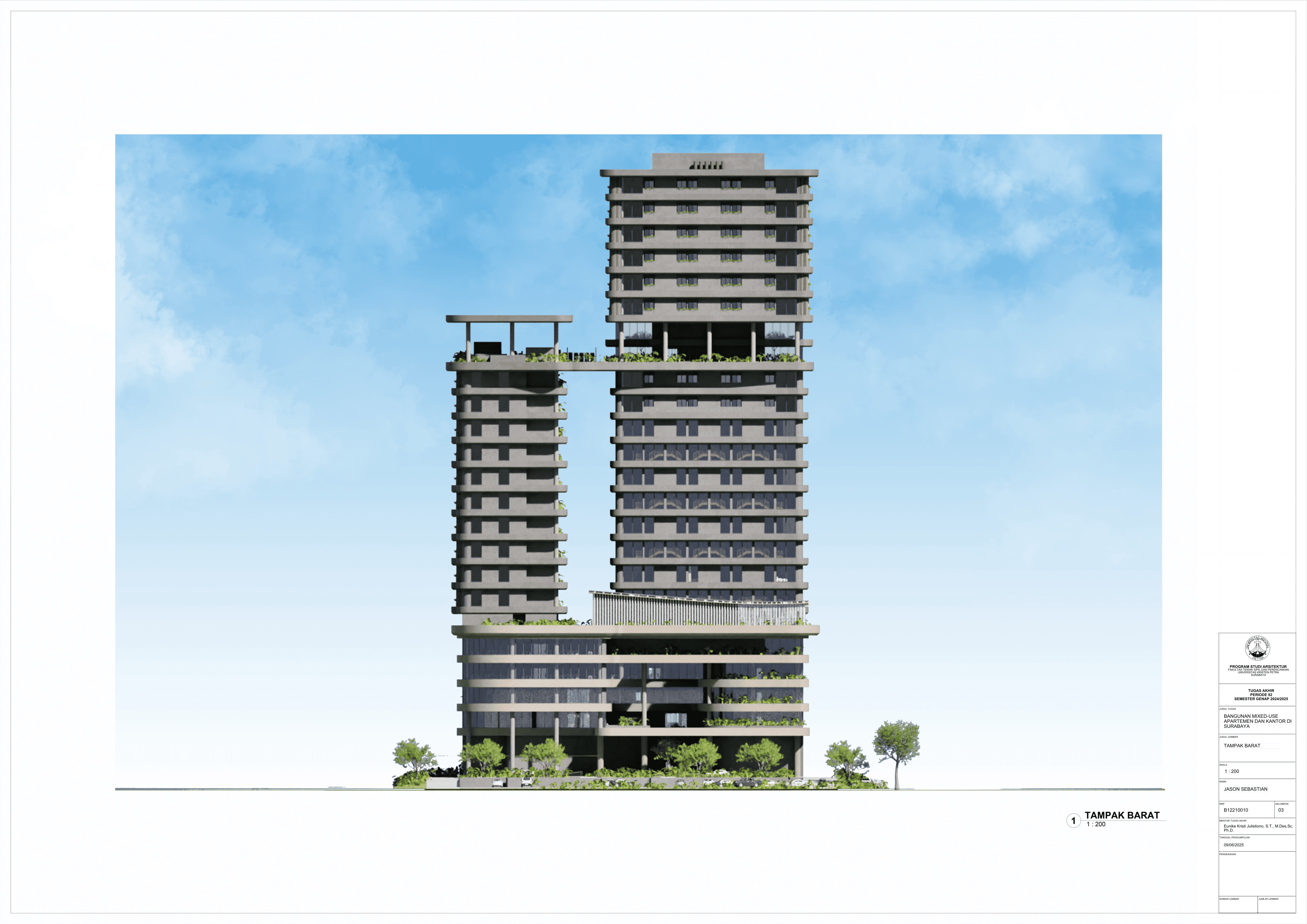 Pertumbuhan urbanisasi dan kebutuhan ruang di Surabaya mendorong pengembangan bangunan vertikal yang mampu mengintegrasikan fungsi hunian dan perkantoran dalam satu lokasi. Perancangan ini bertujuan untuk menghasilkan sebuah bangunan mixed-use yang menggabungkan apartemen dan kantor, dengan pendekatan berkelanjutan sesuai target net-zero emission carbon. Proyek ini mengakomodasi kebutuhan generasi milenial, pengusaha muda, dan pekerja kreatif untuk mengembangkan bisnis startup mereka dengan memaksimalkan efisiensi ruang, kemudahan akses, dan penerapan elemen biophilic untuk meningkatkan kualitas hidup pengguna. Metodologi perancangan melibatkan survei tapak, studi literatur, dan studi preseden untuk bisa menghasilkan desain yang menjawab permasalahan lingkungan saat ini. Bangunan dirancang untuk meminimalisir emisi karbon operasional melalui efisiensi energi, optimalisasi pencahayaan alami, dan penghawaan. Fasilitas yang dirancang meliputi apartemen, kantor sewa, coworking space, area hijau, dan fasilitas penunjang komersial. Perancangan ini juga memperhatikan Sustainable Development Goals (SDGs) terkait penghematan energi dan pertumbuhan ekonomi yang berkelanjutan. Hasil rancangan yang diharapkan adalah desain yang fungsional, fleksibel, dan ramah lingkungan, yang mampu memenuhi kebutuhan masyarakat urban dan memberikan kontribusi positif terhadap arsitektur berkelanjutan di Surabaya.