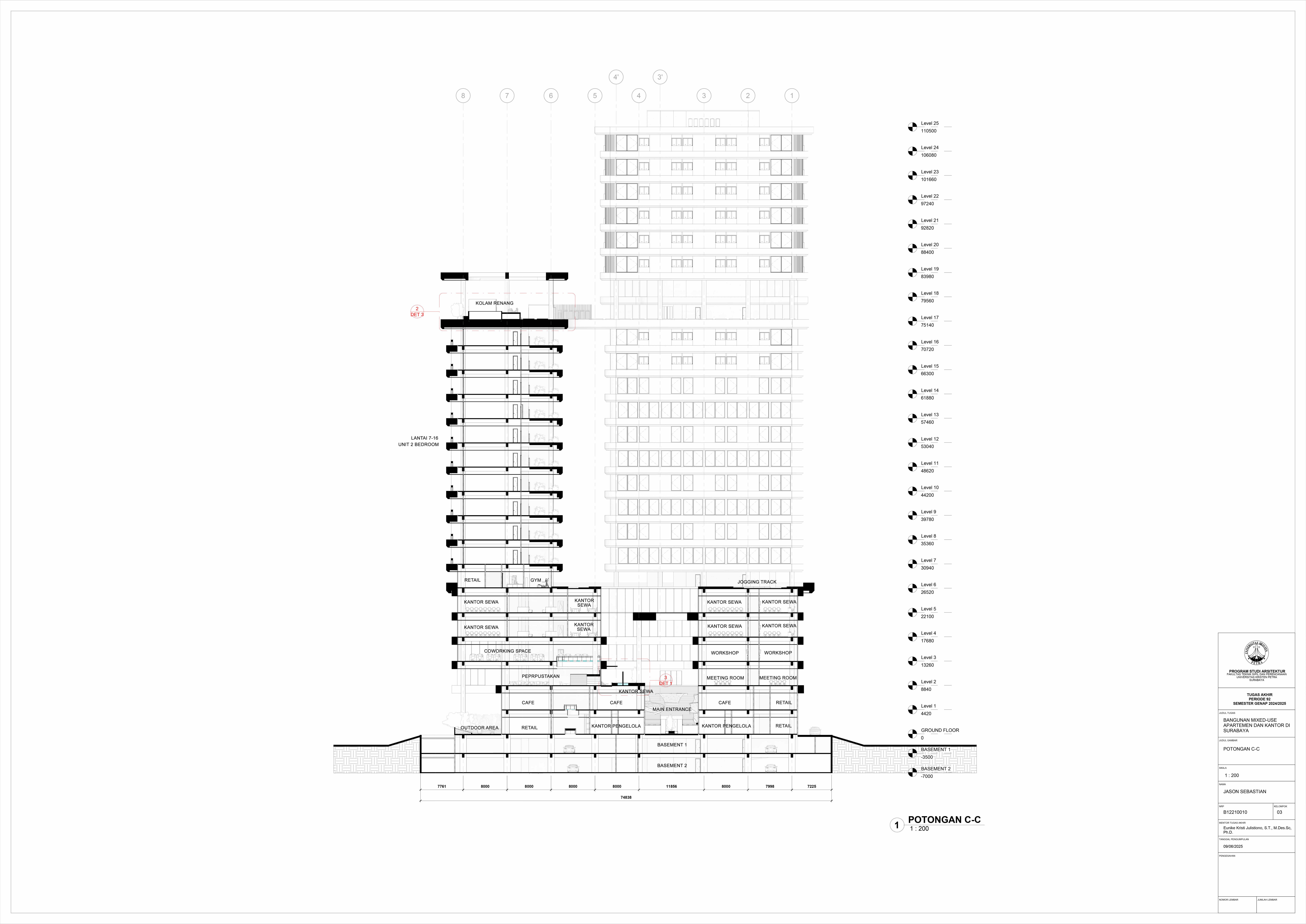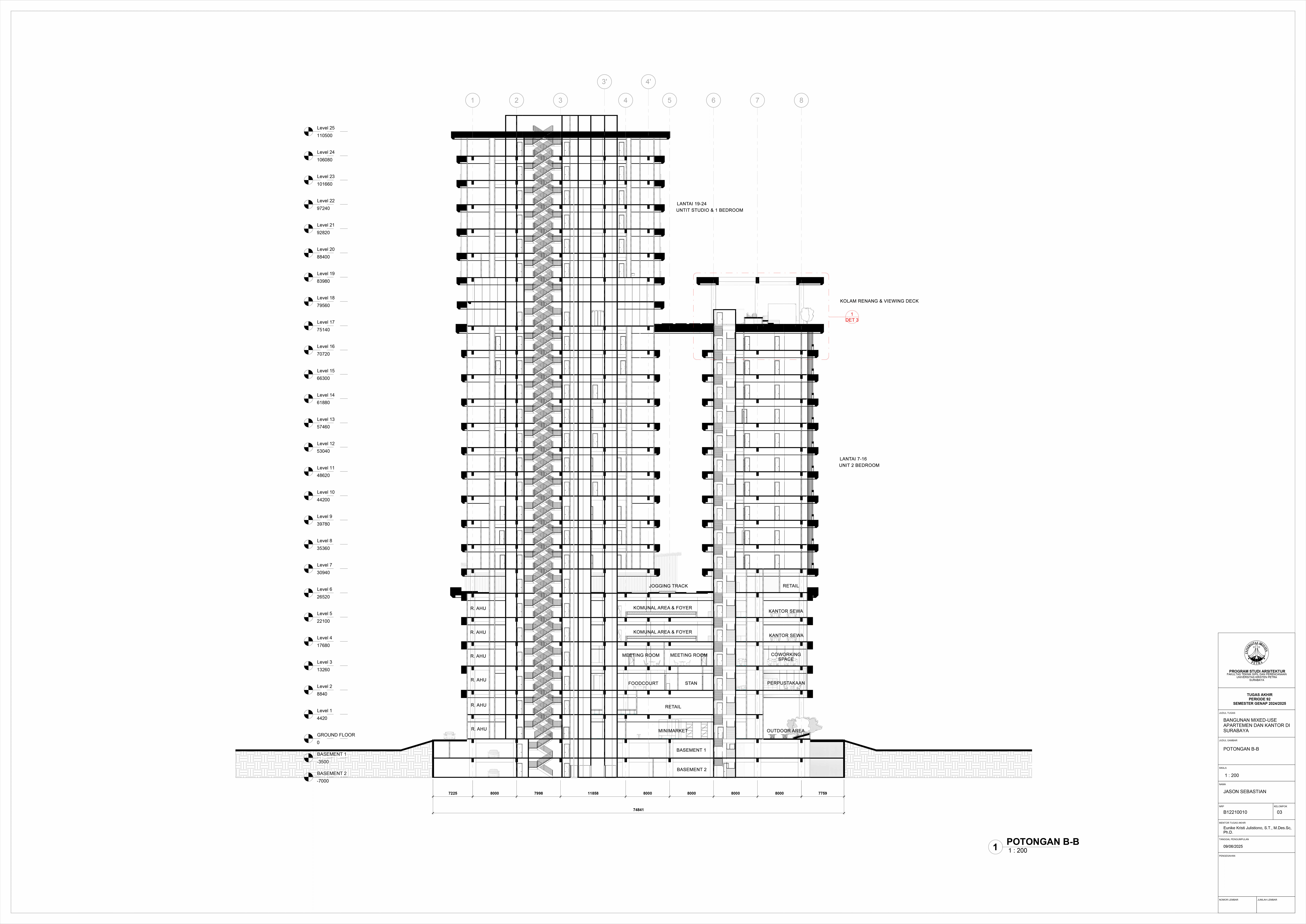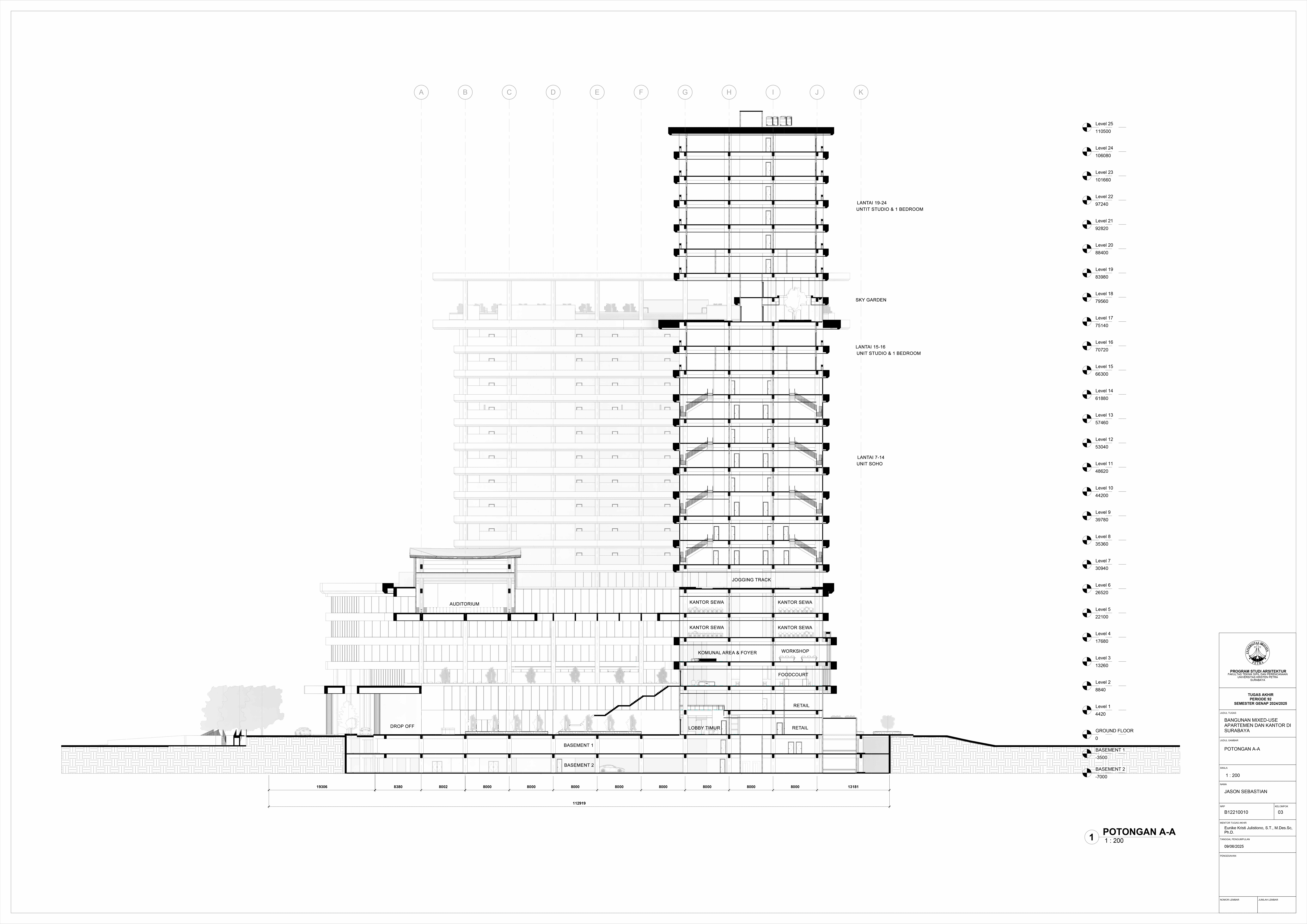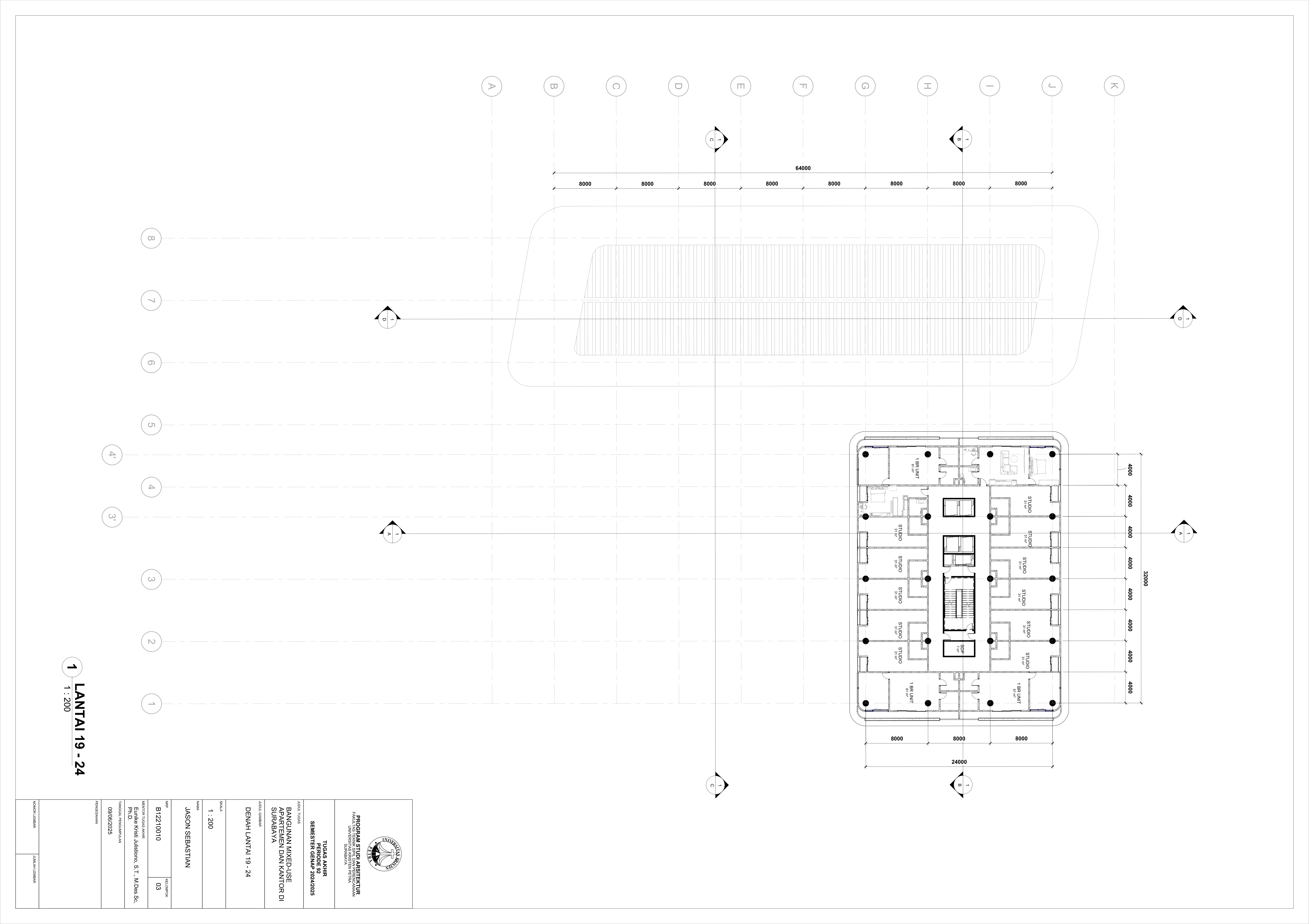 Pertumbuhan urbanisasi dan kebutuhan ruang di Surabaya mendorong pengembangan bangunan vertikal yang mampu mengintegrasikan fungsi hunian dan perkantoran dalam satu lokasi. Perancangan ini bertujuan untuk menghasilkan sebuah bangunan mixed-use yang menggabungkan apartemen dan kantor, dengan pendekatan berkelanjutan sesuai target net-zero emission carbon. Proyek ini mengakomodasi kebutuhan generasi milenial, pengusaha muda, dan pekerja kreatif untuk mengembangkan bisnis startup mereka dengan memaksimalkan efisiensi ruang, kemudahan akses, dan penerapan elemen biophilic untuk meningkatkan kualitas hidup pengguna. Metodologi perancangan melibatkan survei tapak, studi literatur, dan studi preseden untuk bisa menghasilkan desain yang menjawab permasalahan lingkungan saat ini. Bangunan dirancang untuk meminimalisir emisi karbon operasional melalui efisiensi energi, optimalisasi pencahayaan alami, dan penghawaan. Fasilitas yang dirancang meliputi apartemen, kantor sewa, coworking space, area hijau, dan fasilitas penunjang komersial. Perancangan ini juga memperhatikan Sustainable Development Goals (SDGs) terkait penghematan energi dan pertumbuhan ekonomi yang berkelanjutan. Hasil rancangan yang diharapkan adalah desain yang fungsional, fleksibel, dan ramah lingkungan, yang mampu memenuhi kebutuhan masyarakat urban dan memberikan kontribusi positif terhadap arsitektur berkelanjutan di Surabaya.