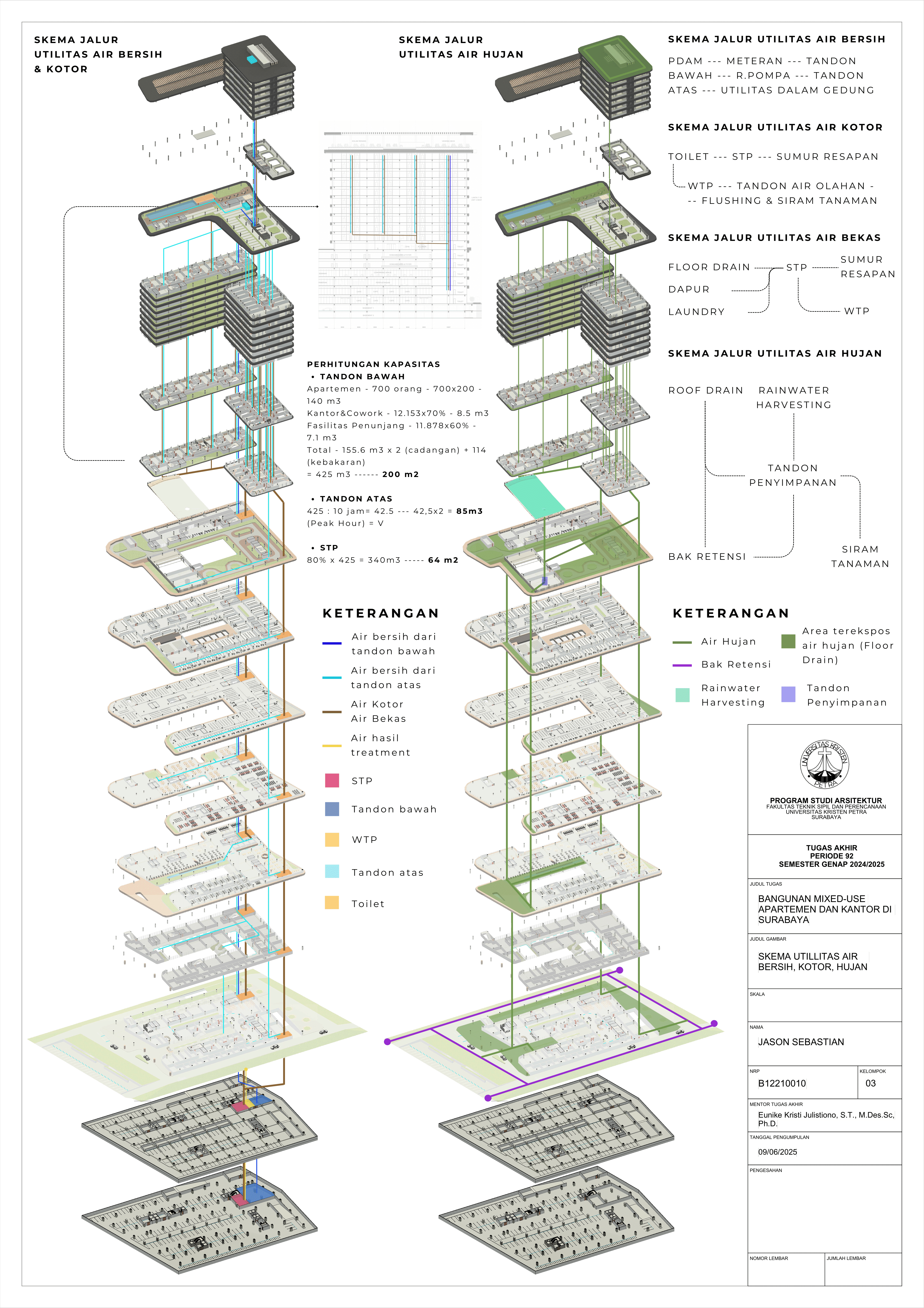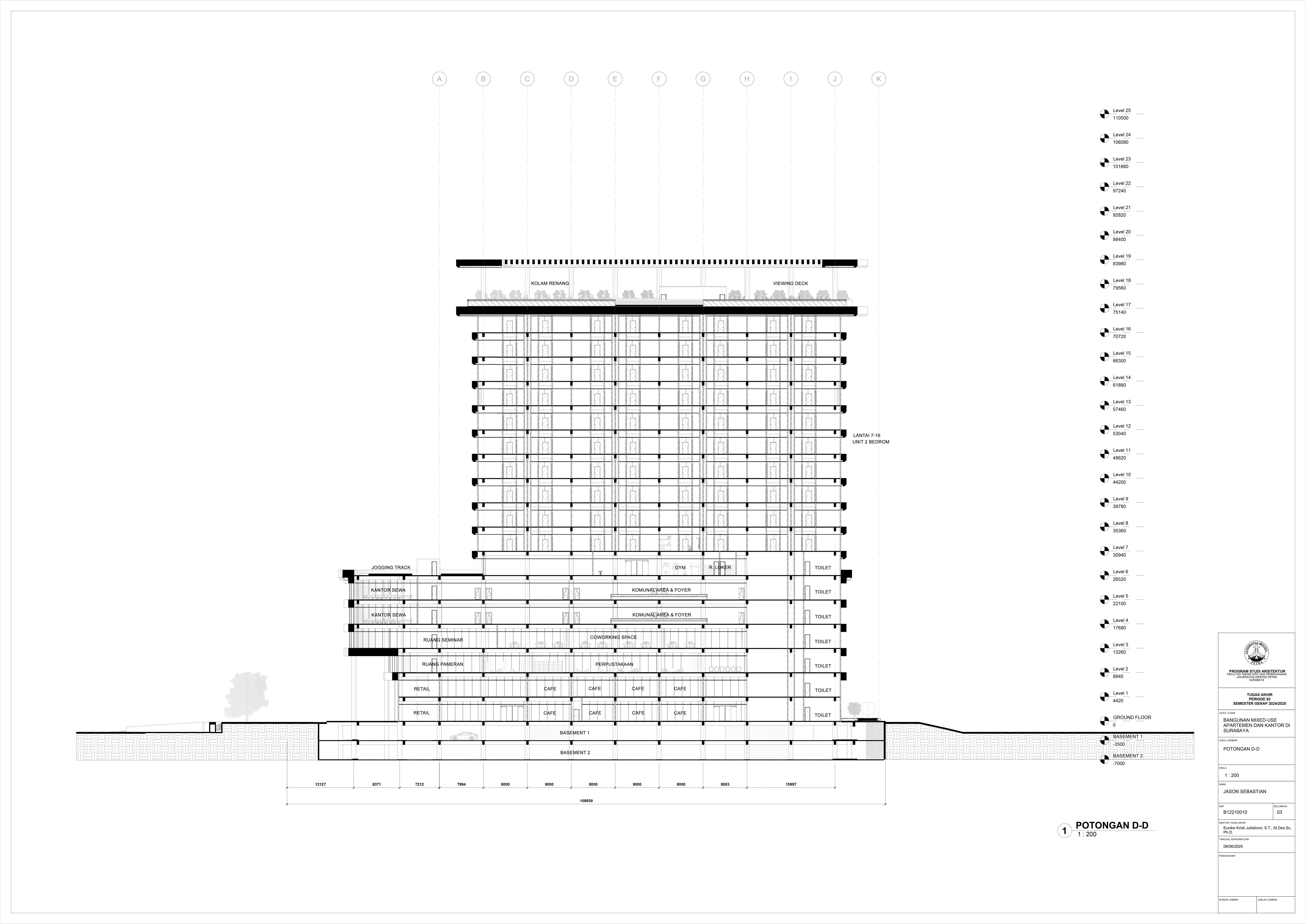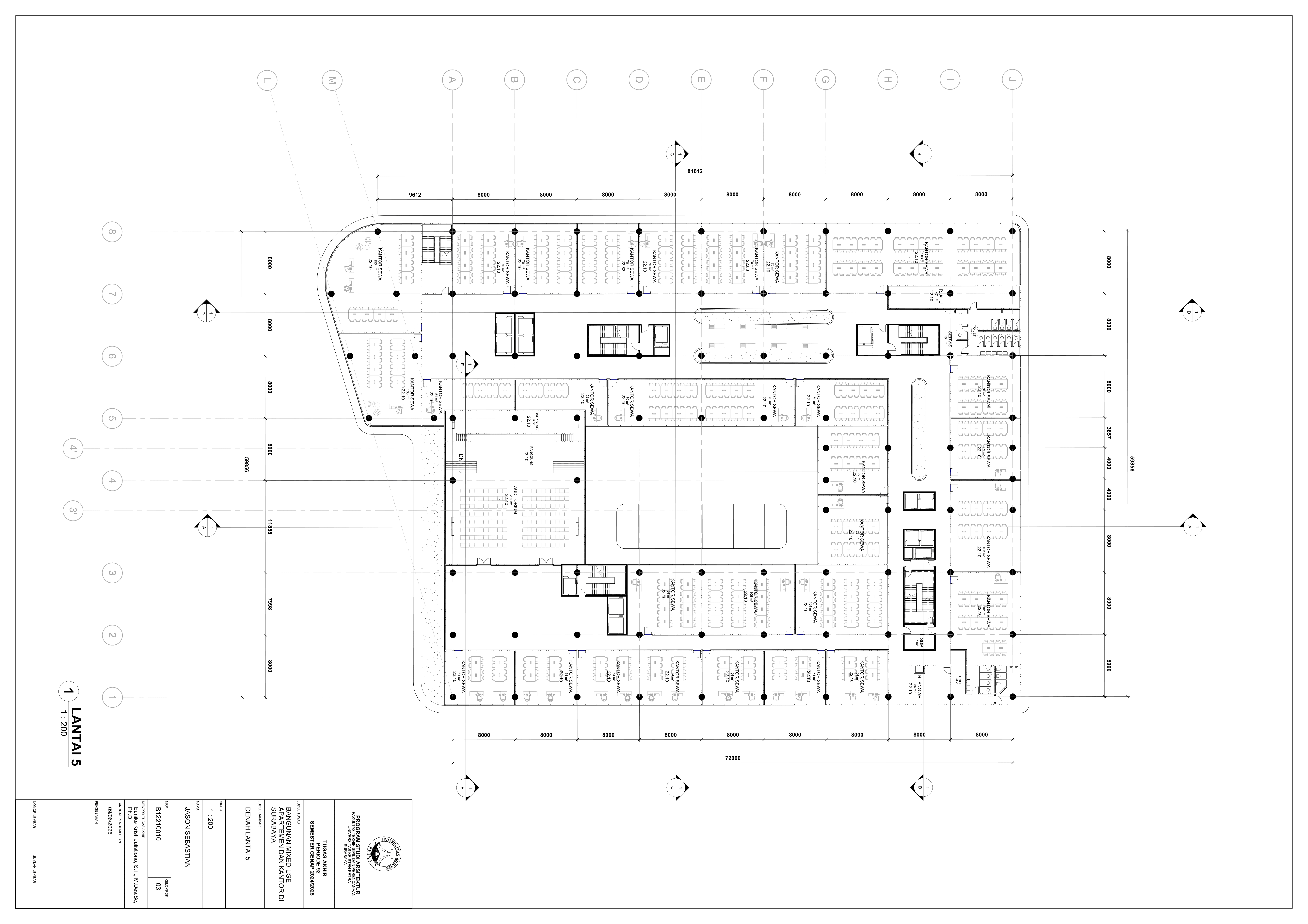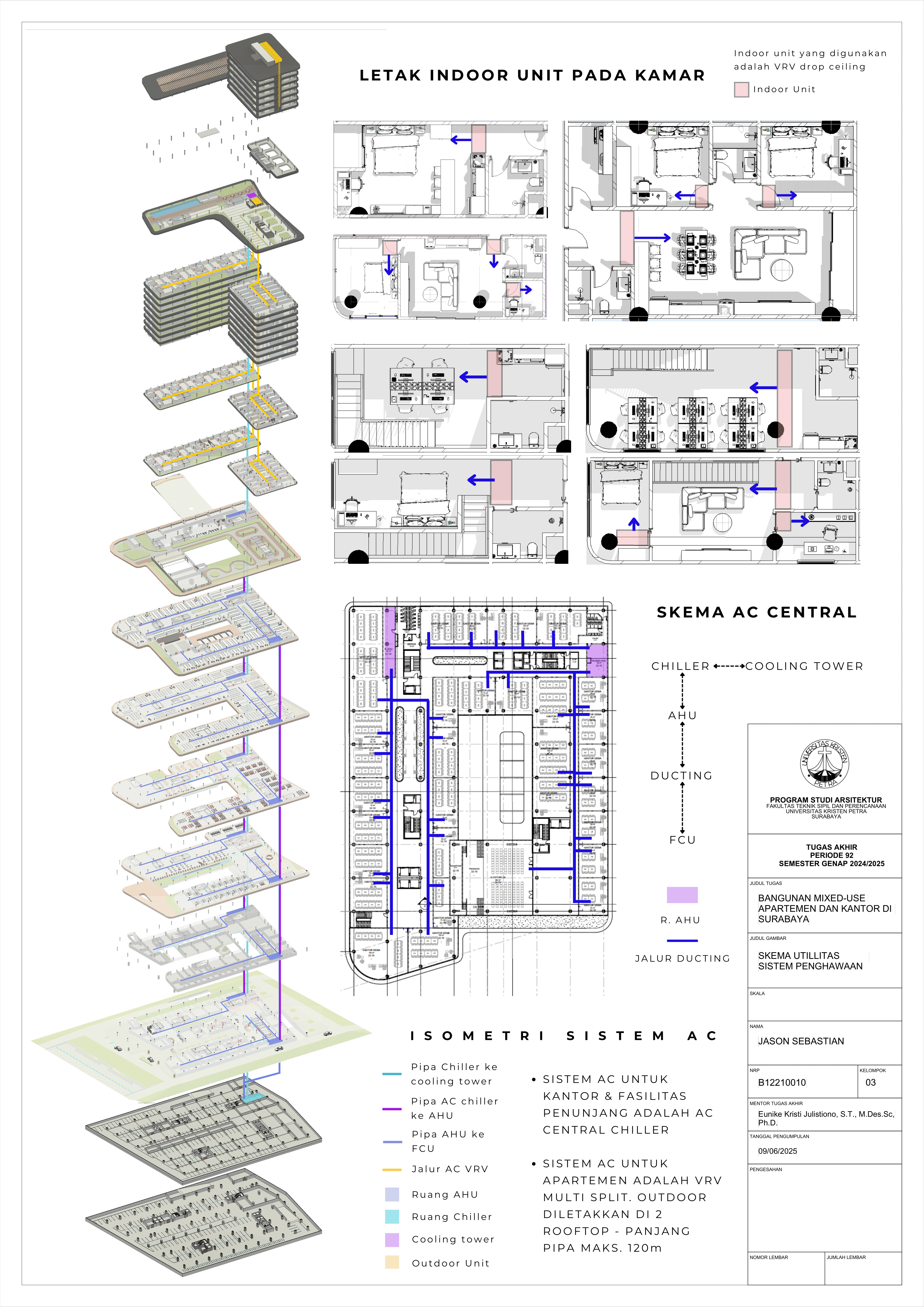 Pertumbuhan urbanisasi dan kebutuhan ruang di Surabaya mendorong pengembangan bangunan vertikal yang mampu mengintegrasikan fungsi hunian dan perkantoran dalam satu lokasi. Perancangan ini bertujuan untuk menghasilkan sebuah bangunan mixed-use yang menggabungkan apartemen dan kantor, dengan pendekatan berkelanjutan sesuai target net-zero emission carbon. Proyek ini mengakomodasi kebutuhan generasi milenial, pengusaha muda, dan pekerja kreatif untuk mengembangkan bisnis startup mereka dengan memaksimalkan efisiensi ruang, kemudahan akses, dan penerapan elemen biophilic untuk meningkatkan kualitas hidup pengguna. Metodologi perancangan melibatkan survei tapak, studi literatur, dan studi preseden untuk bisa menghasilkan desain yang menjawab permasalahan lingkungan saat ini. Bangunan dirancang untuk meminimalisir emisi karbon operasional melalui efisiensi energi, optimalisasi pencahayaan alami, dan penghawaan. Fasilitas yang dirancang meliputi apartemen, kantor sewa, coworking space, area hijau, dan fasilitas penunjang komersial. Perancangan ini juga memperhatikan Sustainable Development Goals (SDGs) terkait penghematan energi dan pertumbuhan ekonomi yang berkelanjutan. Hasil rancangan yang diharapkan adalah desain yang fungsional, fleksibel, dan ramah lingkungan, yang mampu memenuhi kebutuhan masyarakat urban dan memberikan kontribusi positif terhadap arsitektur berkelanjutan di Surabaya.