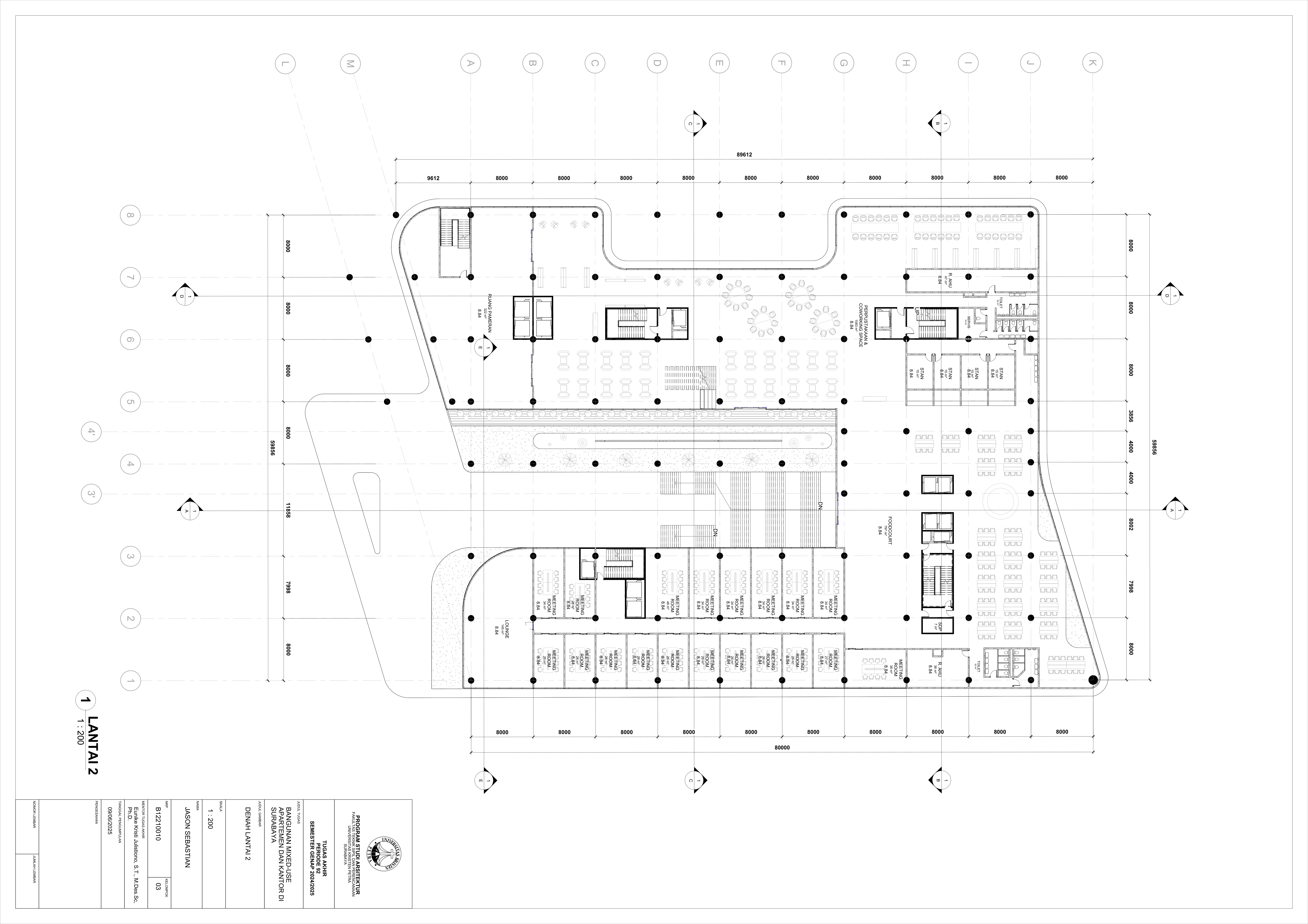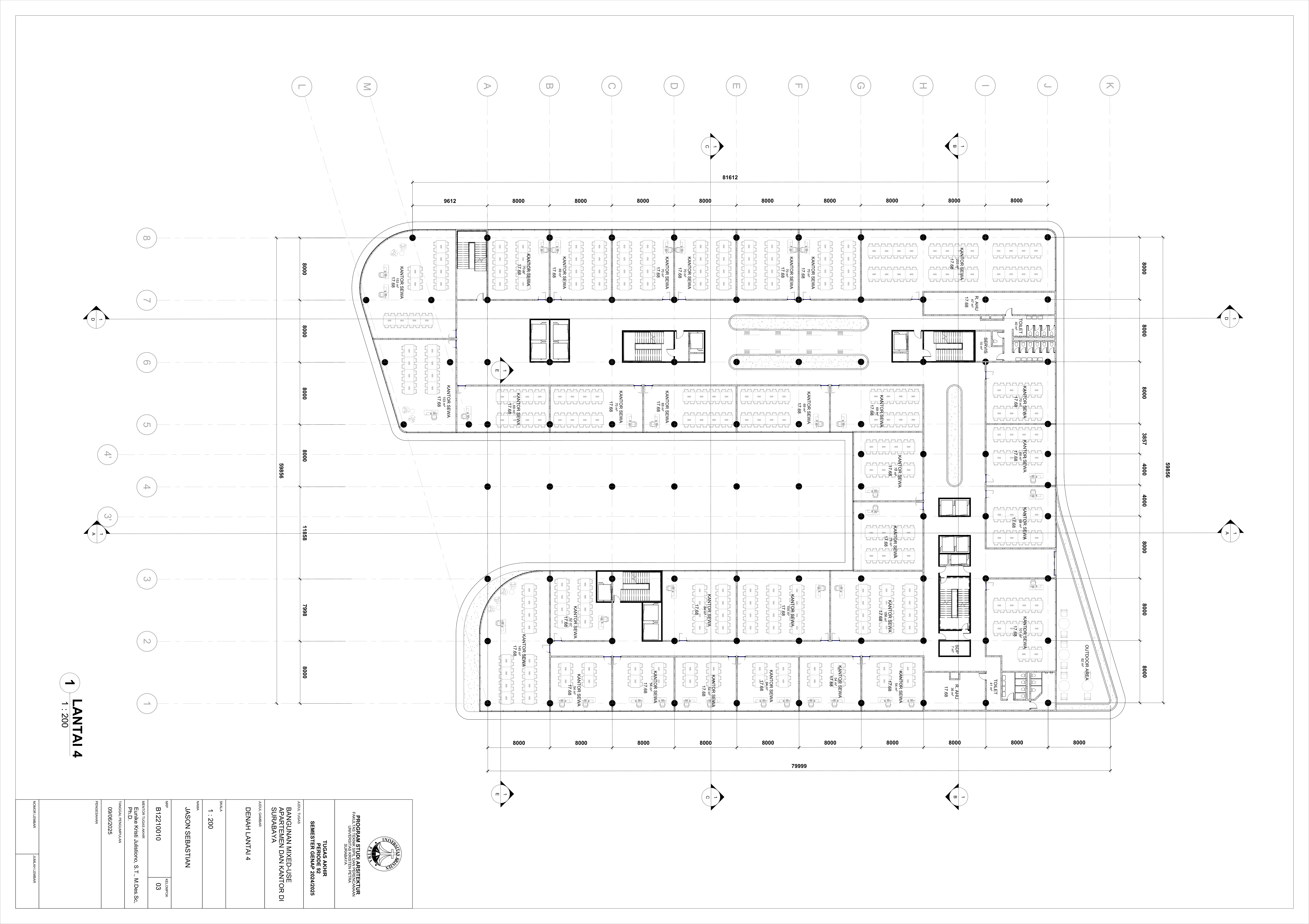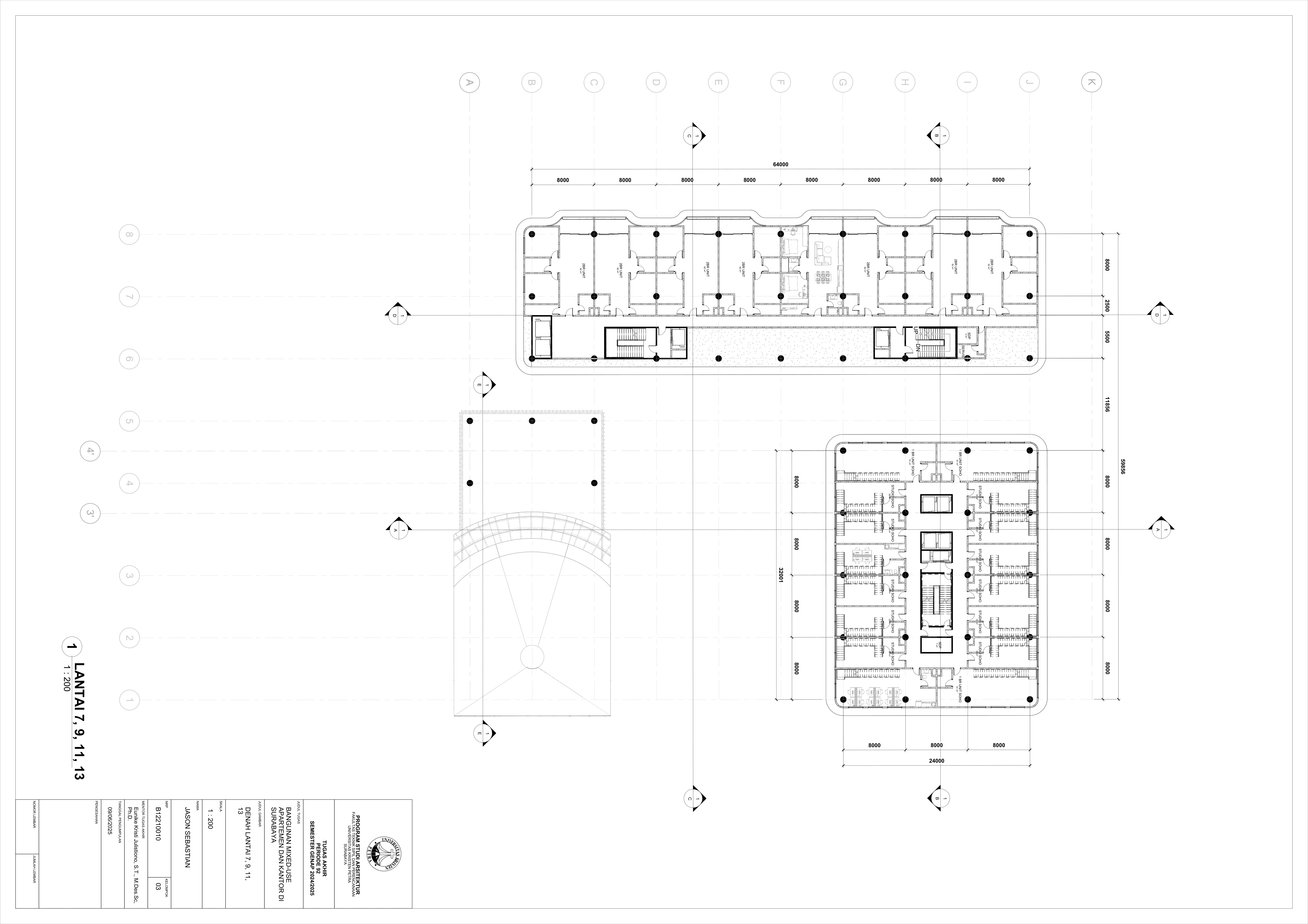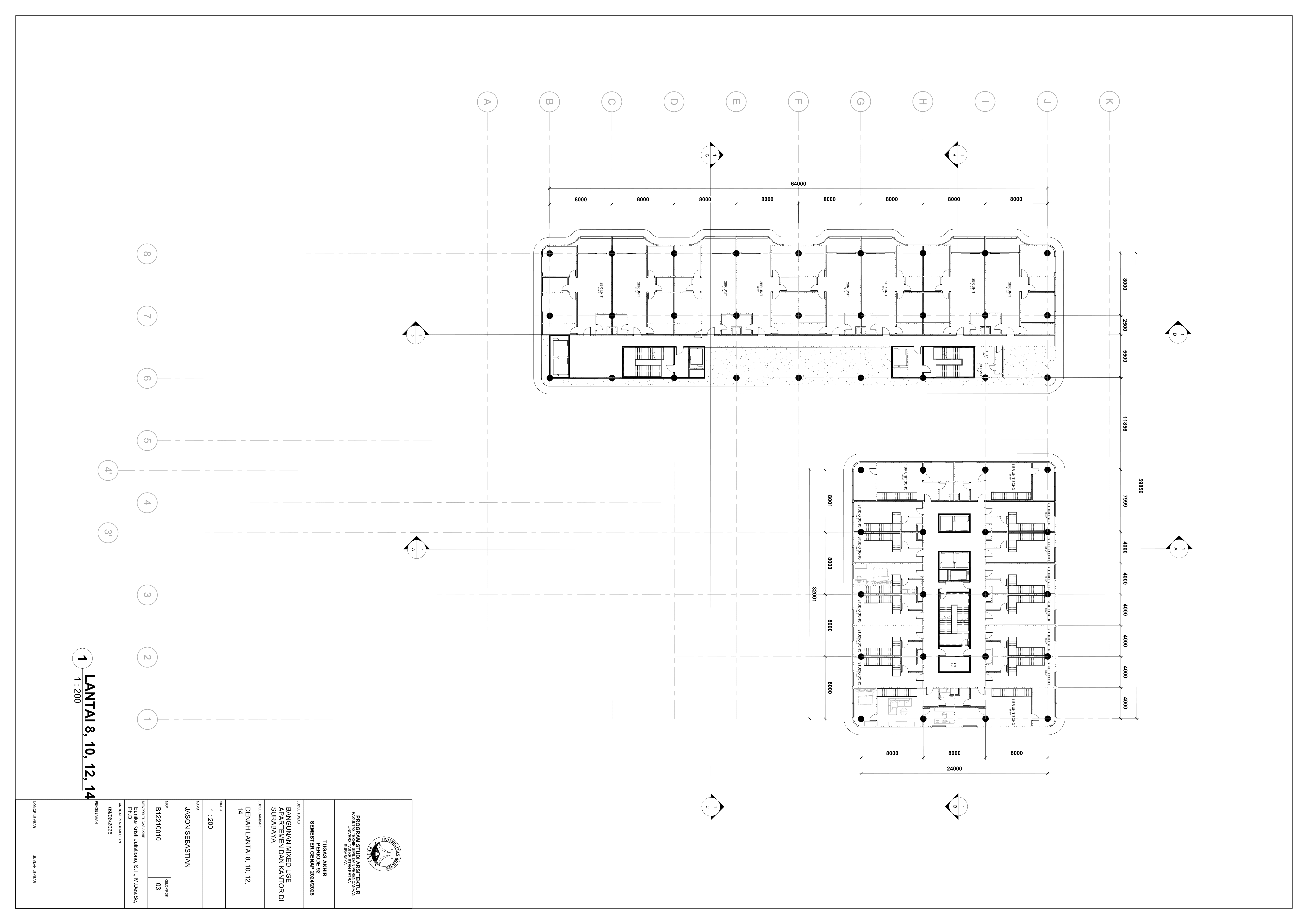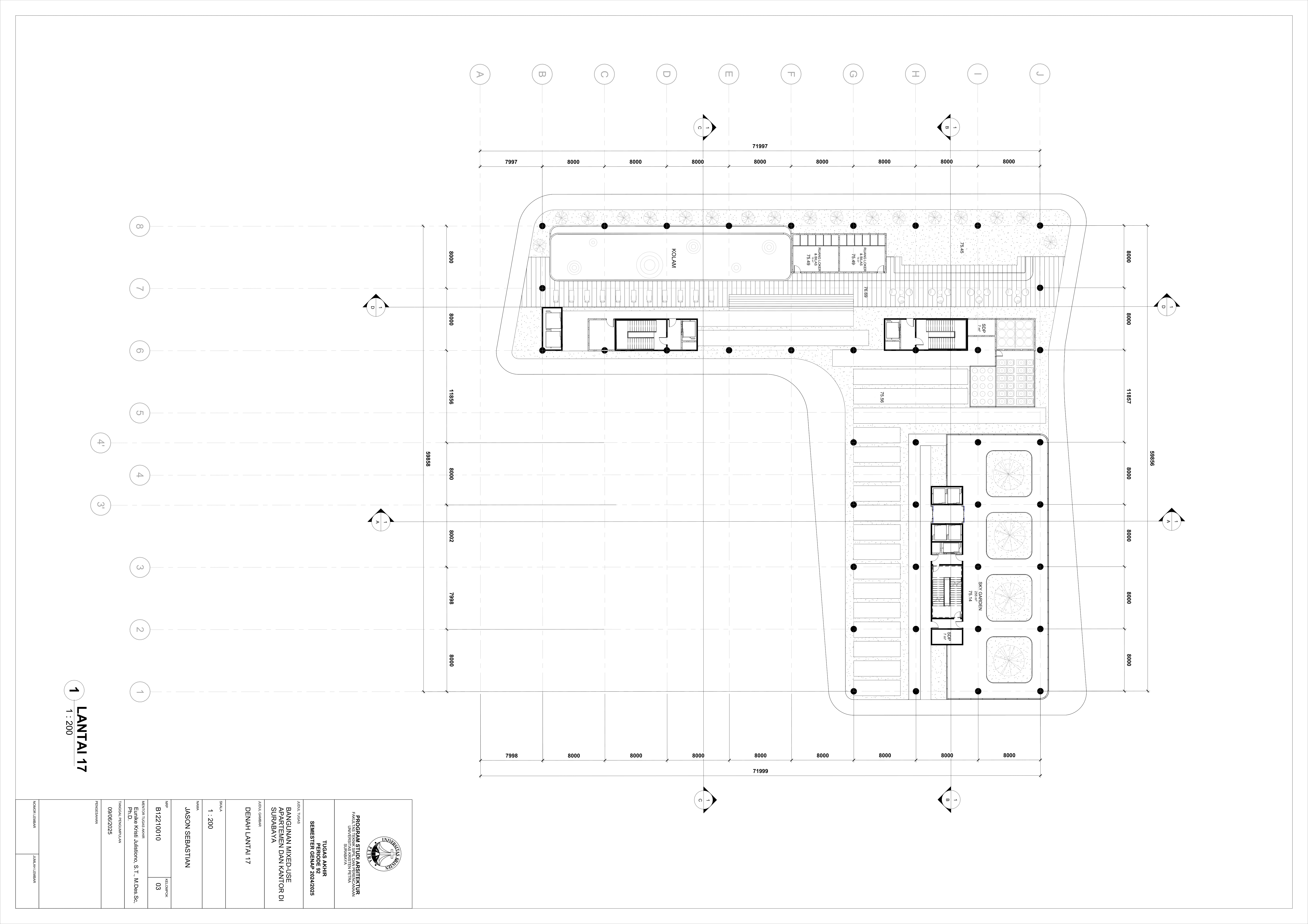 Pertumbuhan urbanisasi dan kebutuhan ruang di Surabaya mendorong pengembangan bangunan vertikal yang mampu mengintegrasikan fungsi hunian dan perkantoran dalam satu lokasi. Perancangan ini bertujuan untuk menghasilkan sebuah bangunan mixed-use yang menggabungkan apartemen dan kantor, dengan pendekatan berkelanjutan sesuai target net-zero emission carbon. Proyek ini mengakomodasi kebutuhan generasi milenial, pengusaha muda, dan pekerja kreatif untuk mengembangkan bisnis startup mereka dengan memaksimalkan efisiensi ruang, kemudahan akses, dan penerapan elemen biophilic untuk meningkatkan kualitas hidup pengguna. Metodologi perancangan melibatkan survei tapak, studi literatur, dan studi preseden untuk bisa menghasilkan desain yang menjawab permasalahan lingkungan saat ini. Bangunan dirancang untuk meminimalisir emisi karbon operasional melalui efisiensi energi, optimalisasi pencahayaan alami, dan penghawaan. Fasilitas yang dirancang meliputi apartemen, kantor sewa, coworking space, area hijau, dan fasilitas penunjang komersial. Perancangan ini juga memperhatikan Sustainable Development Goals (SDGs) terkait penghematan energi dan pertumbuhan ekonomi yang berkelanjutan. Hasil rancangan yang diharapkan adalah desain yang fungsional, fleksibel, dan ramah lingkungan, yang mampu memenuhi kebutuhan masyarakat urban dan memberikan kontribusi positif terhadap arsitektur berkelanjutan di Surabaya.