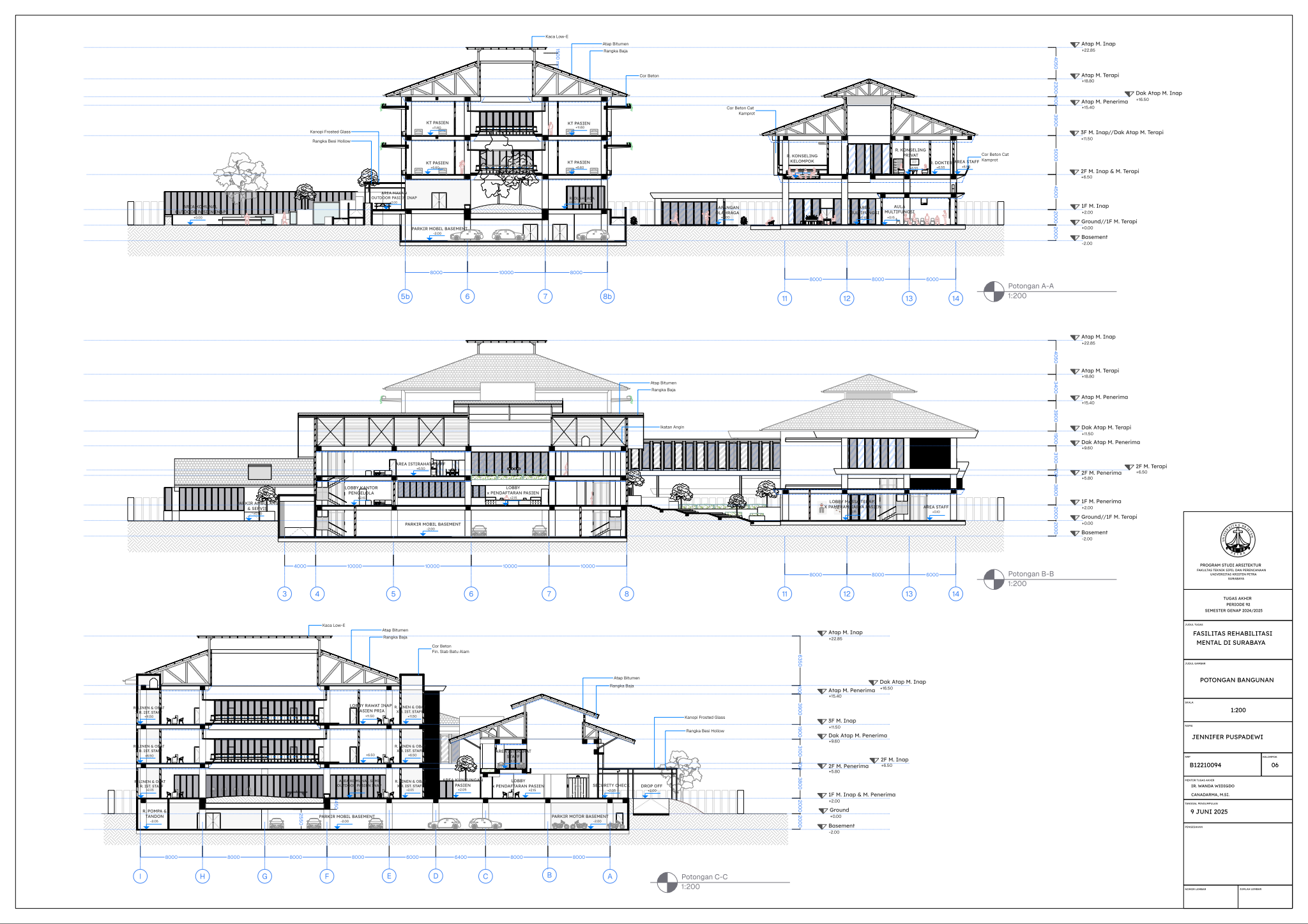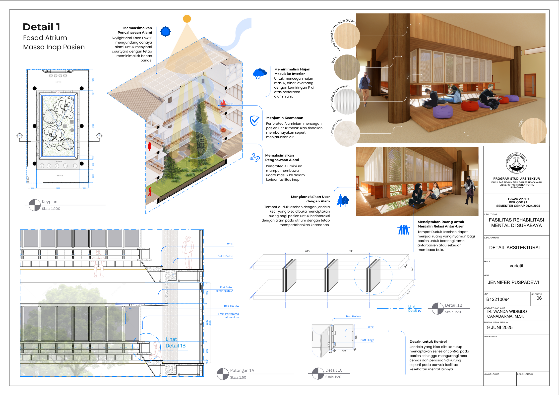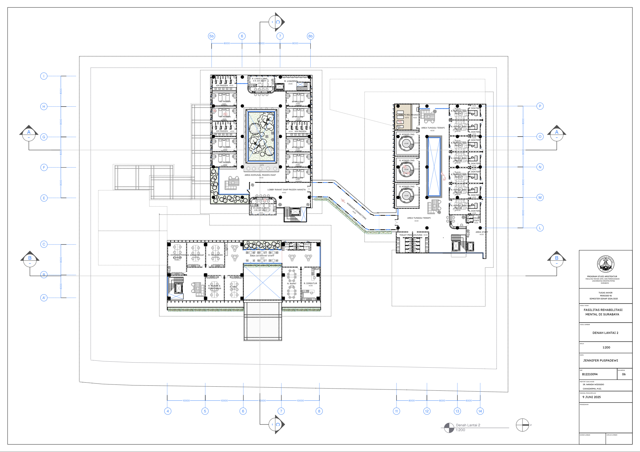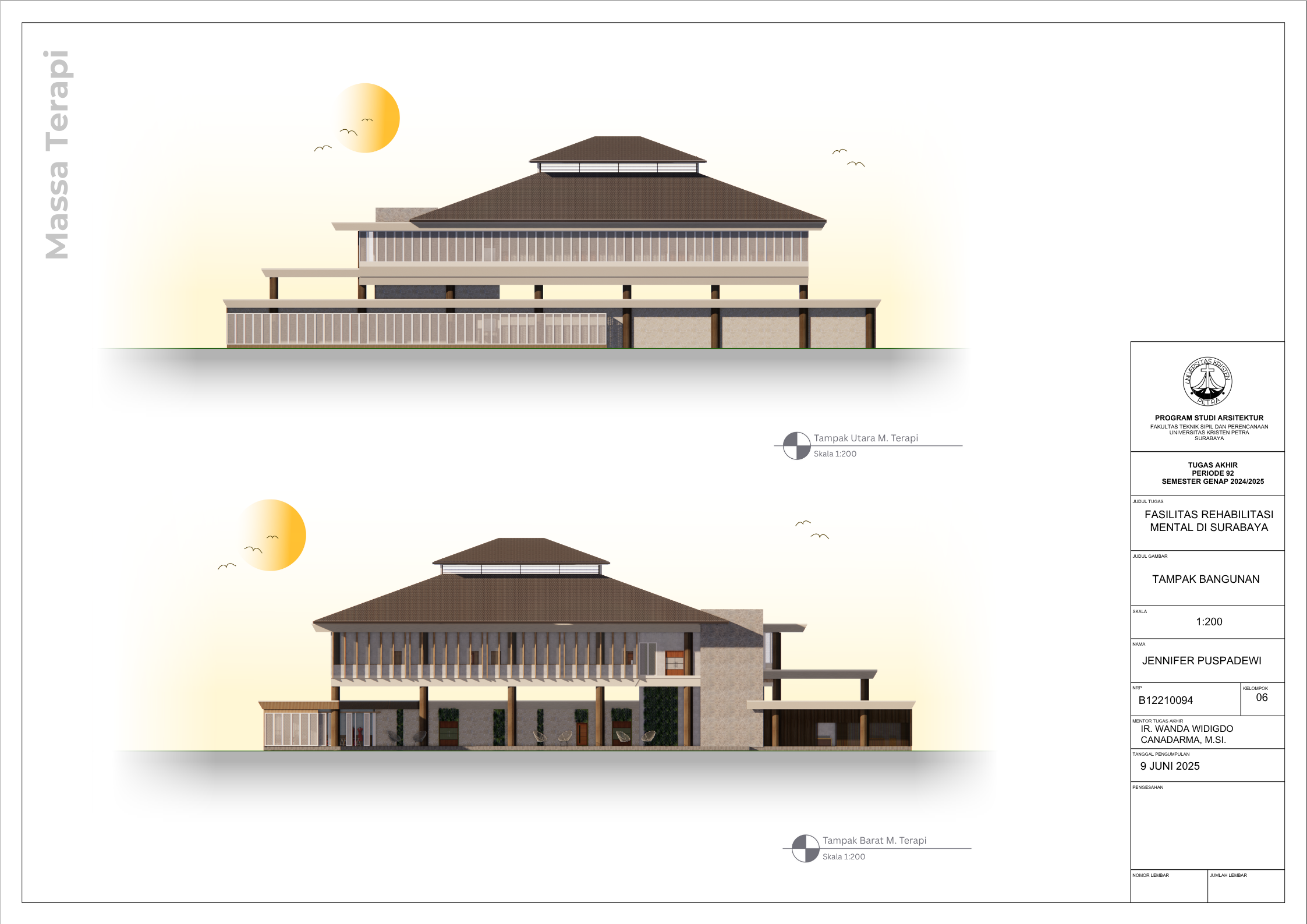 Masyarakat Indonesia yang mengidap gangguan mental mencapai angka 1 dari 5 orang pada tahun 2021 (Dr. C. E. Munthe, 2021) dengan jumlah pasien skizofrenia menduduki peringkat nomor satu di dunia (MetroTV, 2024). Dengan demikian, fasilitas kesehatan mental merupakan kebutuhan yang krusial di Negara Indonesia saat ini di mana tingkat masyarakat dengan gangguan mental tidak sepadan dengan minimnya Fasilitas Kesehatan Mental yang memadai. Karena itu, Tugas Akhir Karya Desain ini bertujuan untuk menciptakan desain Fasilitas Rehabilitasi Mental yang peduli terhadap penggunanya serta menghilangkan stigma negatif masyarakat seputar fasilitas kesehatan mental. Dalam menstudi desain yang paling efektif bagi Fasilitas Rehabilitasi Mental, dilakukan pengumpulan data dengan metode kualitatif dari berbagai literatur profesional serta studi kasus fasilitas serupa yang menerapkan prinsip Healing Architecture. Hasil dari Tugas Akhir ini adalah sebuah desain arsitektur Fasilitas Rehabilitasi Mental dengan fasilitas rawat jalan dan rawat inap yang sesuai dengan standar internasional dan mengimplementasikan elemen-elemen healing di seluruh fasilitas.