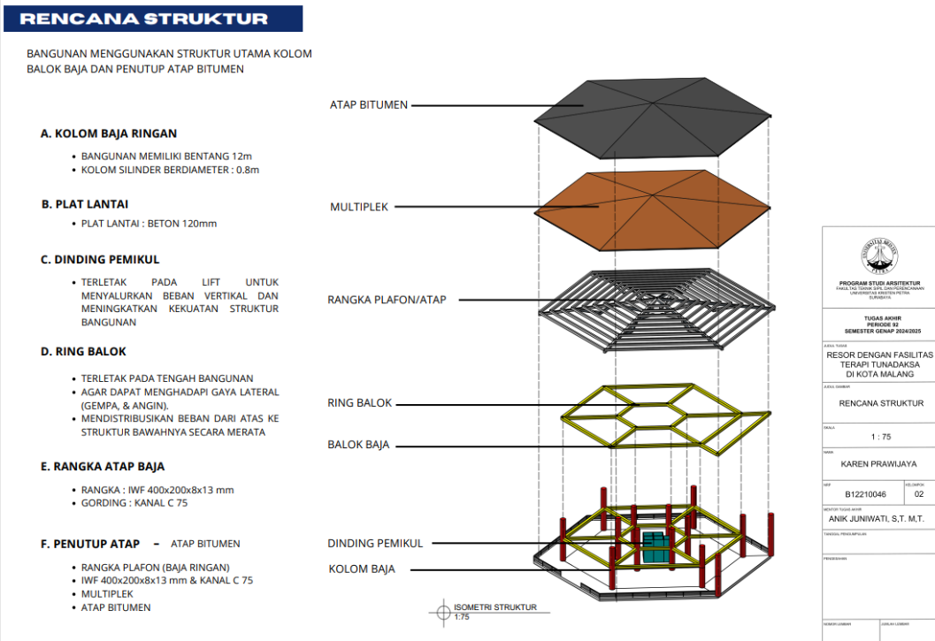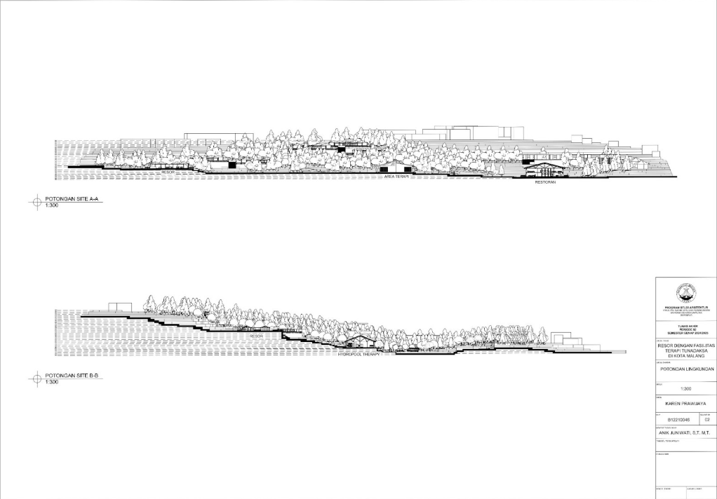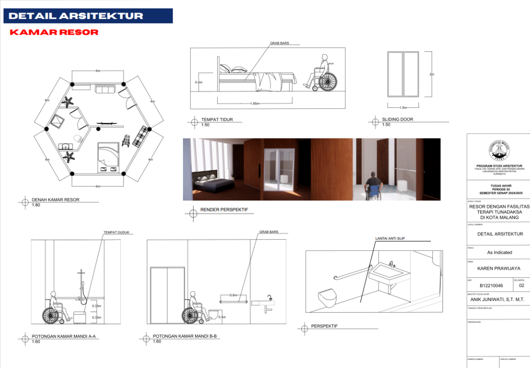 Kota Malang memiliki visi sebagai "Health City" yang mendorong tersedianya fasilitas pendukung kesehatan bagi seluruh kalangan, termasuk penyandang disabilitas. Namun, ketersediaan fasilitas wisata yang universal bagi tunadaksa masih sangat terbatas. Sehingga Resort dengan Fasilitas Terapi Tunadaksa dirancang sebagai tanggapan terhadap meningkatnya jumlah disabilitas, di sisi lain semua orang tanpa terkecuali memerlukan refreshing Konsep utama yang diangkat adalah Equitable Experience, yang artinya semua orang dapat mendapat pengalaman yang sama tanpa terkecuali. Salah satunya diwujudkan melalui perpaduan massa bangunan berbentuk segi enam guna menciptakan kesan menyambut sekaligus efisien dalam penataan ruang. Fasilitas terapi seperti fisioterapi, refleksologi, yoga, terapi berkebun, terapi pijat, hingga forest therapy dirancang secara terintegrasi dengan lanskap kontur dan sirkulasi universal agar dapat diakses tanpa hambatan oleh semua pengguna, baik penyandang disabilitas maupun non-disabilitas. Dengan pendekatan desain universal yang mempertimbangkan topografi, aksesibilitas, serta kebutuhan psikologis dan fisik pengguna, resort ini diharapkan dapat menjadi awal dalam pengembangan kawasan wisata terapi yang humanis dan berkelanjutan di Indonesia.