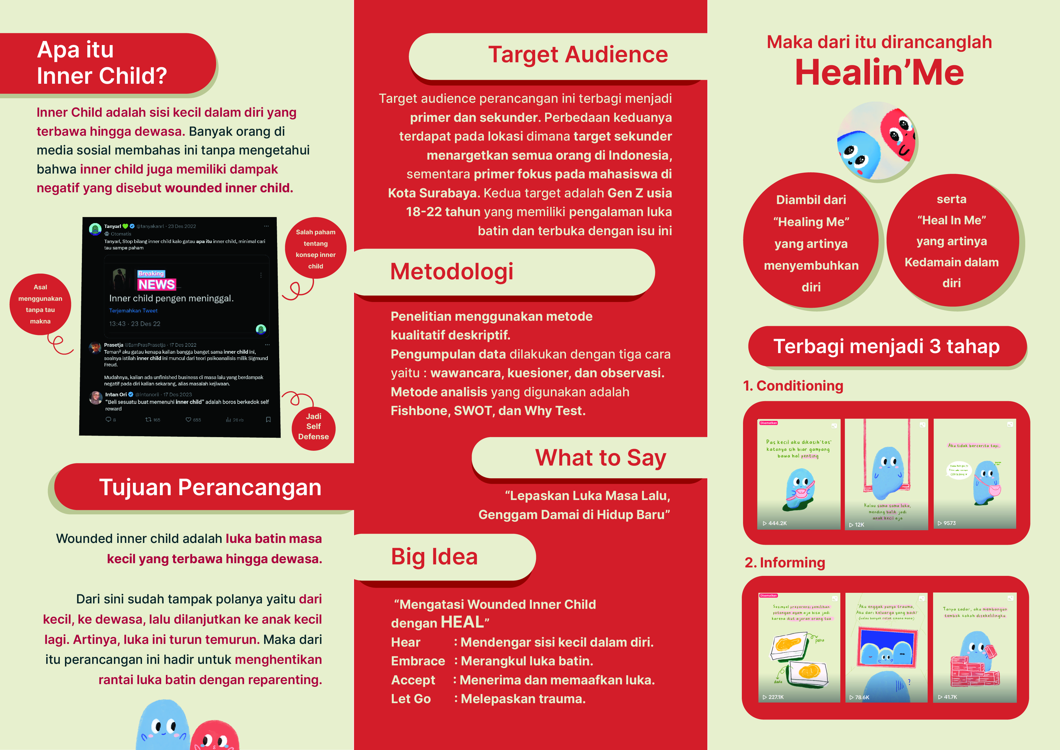 Perilaku manusia seringkali dipengaruhi oleh pengalaman di masa lalu. Trauma atau luka batin yang dialami saat masa kanak-kanak dapat terbawa hingga dewasa dan menimbulkan dampak negatif, baik terhadap diri sendiri, lingkungan sekitar, maupun generasi berikutnya. Berdasarkan hal tersebut, perancangan kampanye ini bertujuan untuk membantu target audiens dalam mengenali, menerima, dan menyembuhkan luka batin yang dimiliki. Kampanye dilaksanakan secara daring melalui media sosial seperti TikTok dan Instagram, serta diperkuat dengan kegiatan luring dan pembagian merchandise sebagai bentuk aktivasi kampanye. Perancangan menggunakan metode kualitatif deskriptif dengan teknik pengumpulan data berupa wawancara, kuesioner, dan observasi. Solusi yang ditawarkan adalah kampanye sosial bernama Healin’Me dengan slogan “Healing The Inner Child in Me”. Kampanye ini dirancang sebagai sarana edukasi dan ekspresi diri yang mendorong audiens untuk menyadari penyebab dan dampak dari wounded inner child, serta memberikan ruang untuk berbagi pengalaman dan membangun empati bersama. Melalui kampanye ini, diharapkan proses penyembuhan luka batin dapat dimulai dan tidak diwariskan secara emosional kepada generasi berikutnya.
