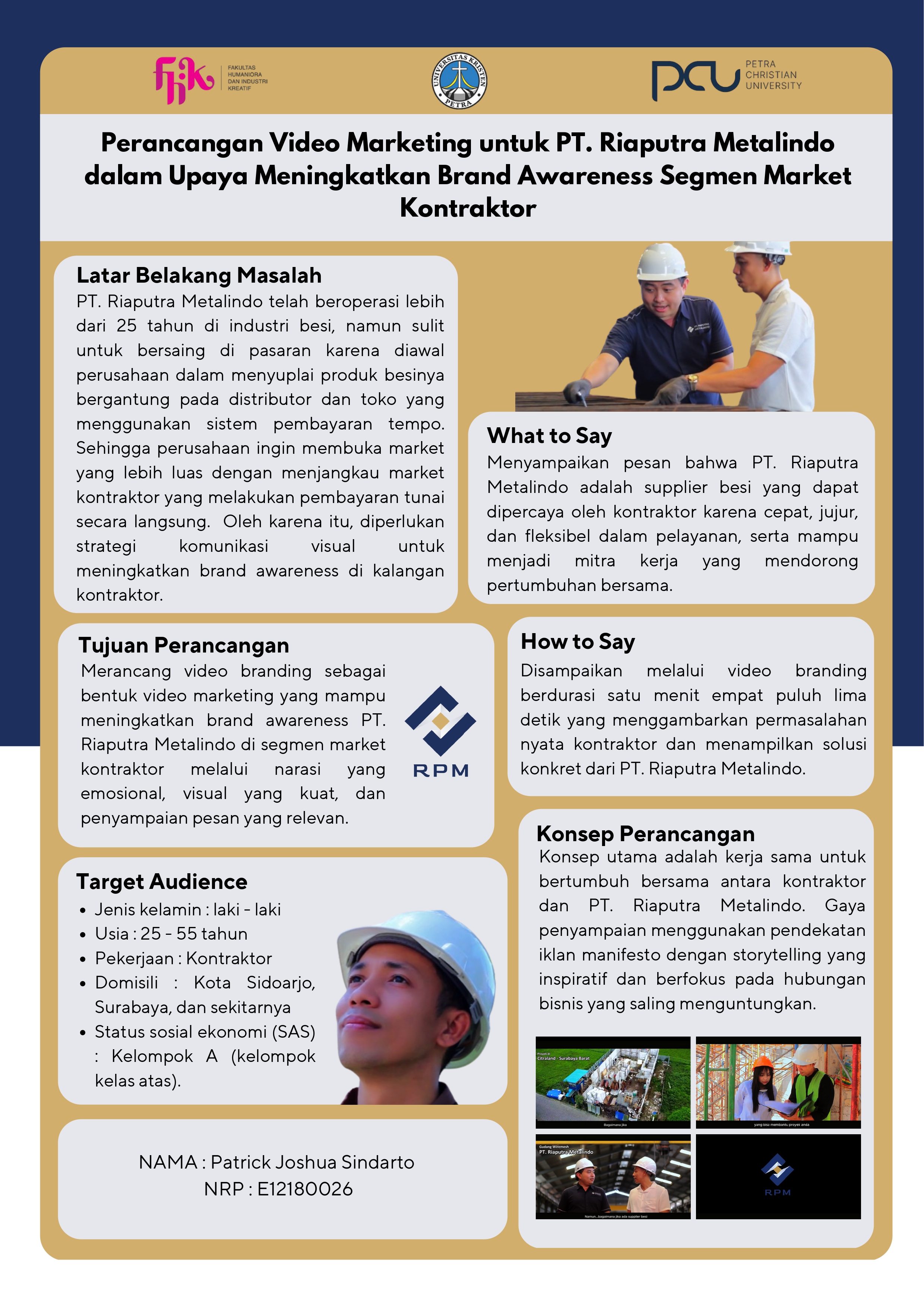 PT Riaputra Metalindo merupakan perusahaan besi dengan pengalaman lebih dari dua puluh lima tahun yang menghadapi tantangan dalam membangun brand awareness di segmen kontraktor. Ketergantungan pada sistem distribusi melalui toko atau distributor yang menggunakan metode pembayaran tempo membuat perusahaan sulit bersaing secara langsung di pasar. Penelitian ini bertujuan merancang video marketing berupa video branding guna meningkatkan brand awareness di kalangan kontraktor. Metode yang digunakan adalah deskriptif kualitatif melalui wawancara dengan Kepala Branding PT Riaputra Metalindo dan studi literatur. Proses perancangan dilakukan melalui tahap pra-produksi, produksi, dan pasca-produksi. Hasil akhirnya berupa video berdurasi satu menit empat puluh lima detik yang menampilkan permasalahan umum kontraktor serta solusi yang ditawarkan oleh perusahaan. Video dipublikasikan melalui akun resmi PT. Riaputra Metalindo di Facebook Ads, Instagram Ads, dan kanal YouTube. Hasil menunjukkan bahwa video branding mampu menarik perhatian audiens, menyampaikan pesan perusahaan secara kuat, dan meningkatkan interaksi. Kesimpulan menyatakan bahwa video branding merupakan media yang efektif dalam membangun citra profesional dan meningkatkan brand awareness di kalangan kontraktor.