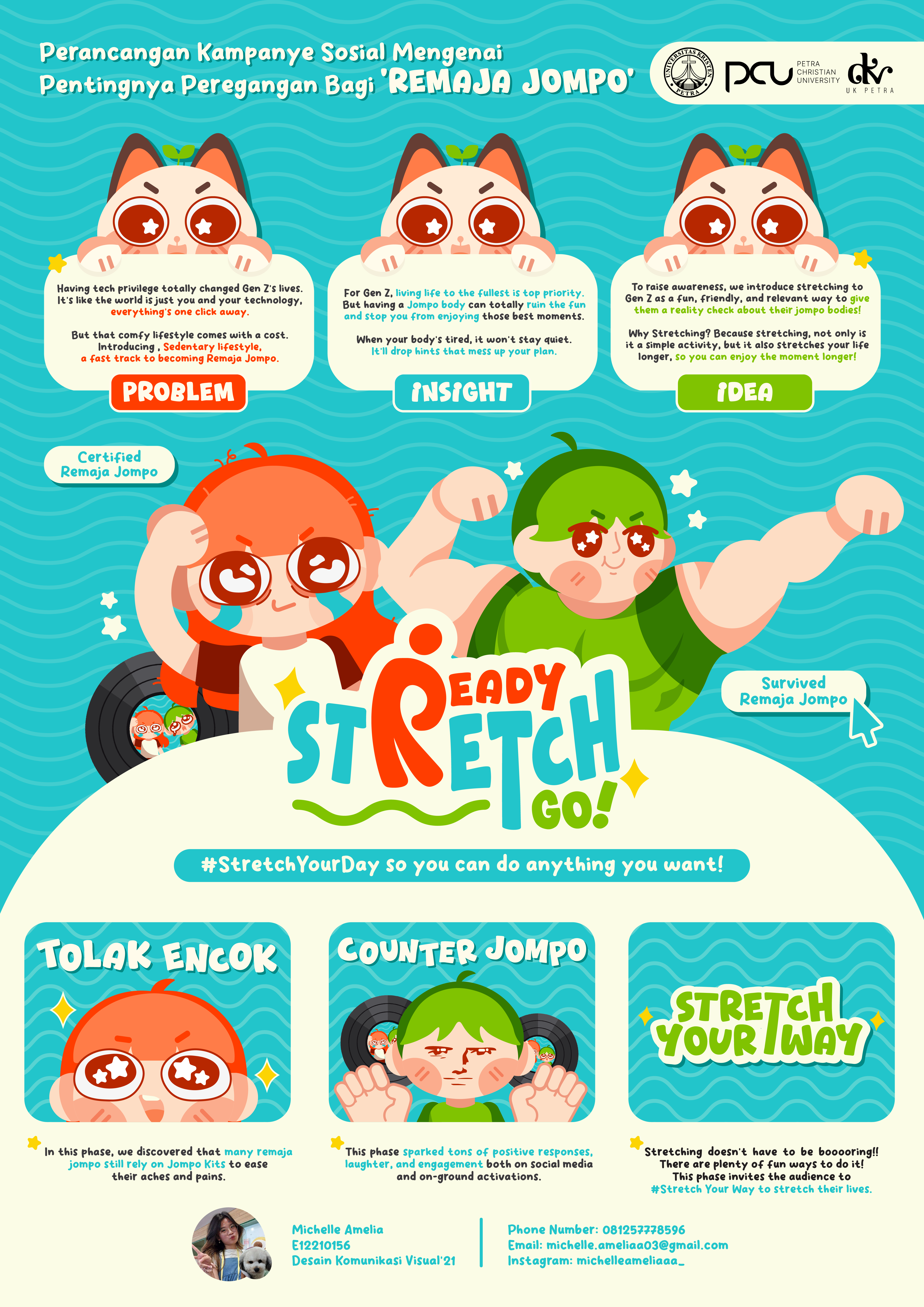 Generasi Z tumbuh dalam era digtal yang membawa kemudahan dalam berbagai aspek keseharian hidup. Namun, kegiatan ini turut berkontribusi terhadap meningkatnya gaya hidup sedentari yang berdampak negatif pada kesehatan fisik dan mental, serta menurunkan kualitas hidup secara keseluruhan. Kondisi ini memunculkan fenomena “Remaja Jompo”. Perancangan ini dimulai dengan meneliti akar masalah Generasi Z dengan menggunakan analisis fishbone. Hasil analisis tersebut digunakan untuk membuat konsep perancangan kampanye sosial dengan tujuan untuk meningkatkan kesadaran terhadap pentingnya aktivitas fisik, khususnya peregangan sebagai langkah awal menjaga kesehatan tubuh. Kampanye ini menggunakan pendekatan kreatif melalui aktivitas luring, media sosial, serta distribusi zine interaktif untuk menjangkau target audiens. Hasil evaluasi kampanye menunjukkan adanya peningkatan pemahaman terhadap isu serta kesadaran akan manfaat peregangan bagi tubuh. Selain itu, kampanye ini juga mendorong perubahan perilaku dengan meningkatnya minat untuk melakukan peregangan dalam rutinitas harian mereka. Temuan ini menunjukkan bahwa pendekatan komunikasi visual yang ringan, menyenangkan, dan relevan dapat efektif dalam menyampaikan pesan-pesan kesehatan kepada generasi muda.