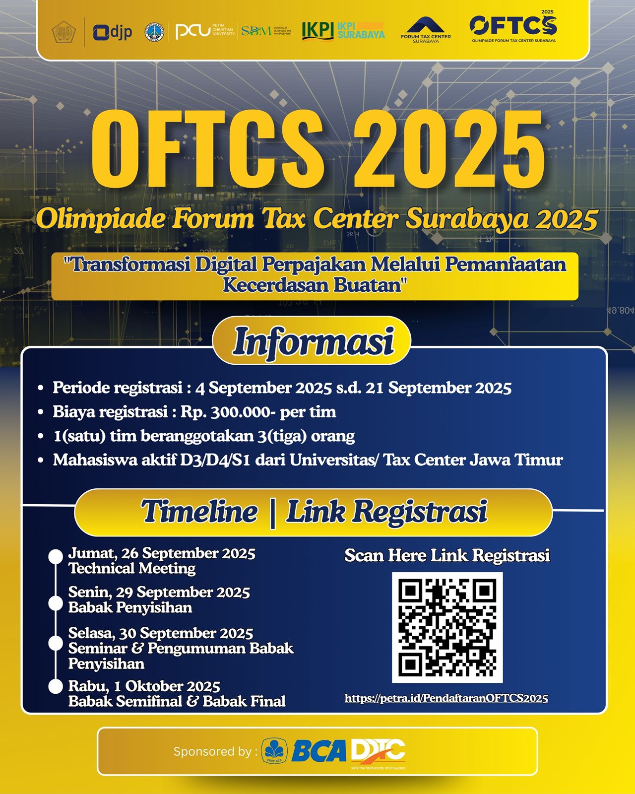 OFTCS 2025 (Olimpiade Forum Tax Center Surabaya) merupakan ajang kompetisi tahunan yang diselenggarakan oleh Forum Tax Center Surabaya bekerja sama dengan berbagai institusi terkait, dengan tujuan meningkatkan literasi, kreativitas, dan inovasi mahasiswa dalam bidang perpajakan.