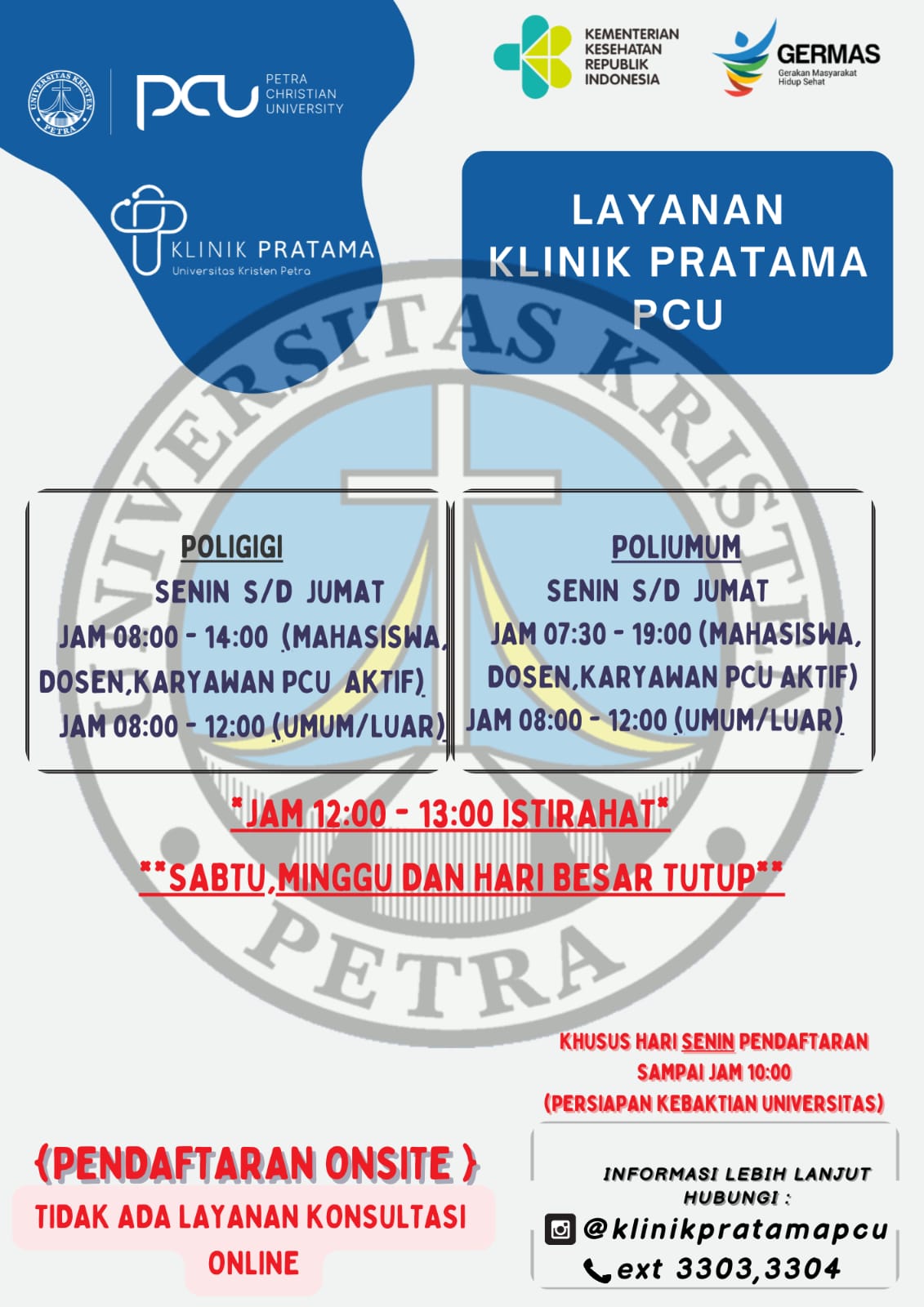 Untuk menunjang perkuliahan disaat sekarang ini, maka poliklinik yang dikelola UK Petra mengadakan jadwal layanan terbaru.