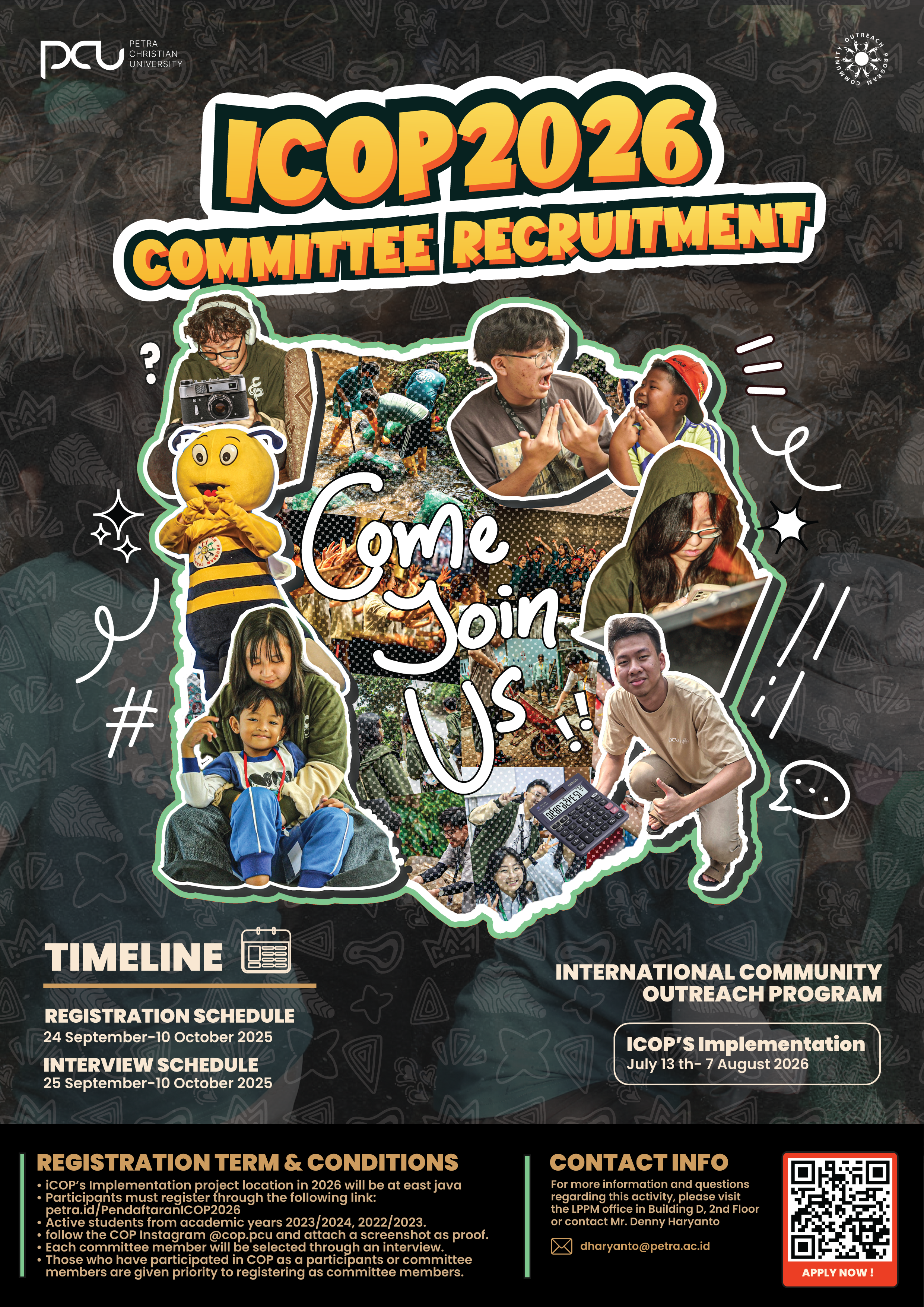International Community Outreach Program (iCOP) 2026 membuka pendaftaran PANITIA. Kegiatan International Community Outreach Program (iCOP) akan kembali dilaksanakan tahun 2026 mendatang. iCOP merupakan International Service Learning Program yang dapat diikuti oleh mahasiswa UK Petra dari berbagai prodi dan mahasiswa dari berbagai universitas yang baik dari dalam maupun dari luar negeri.