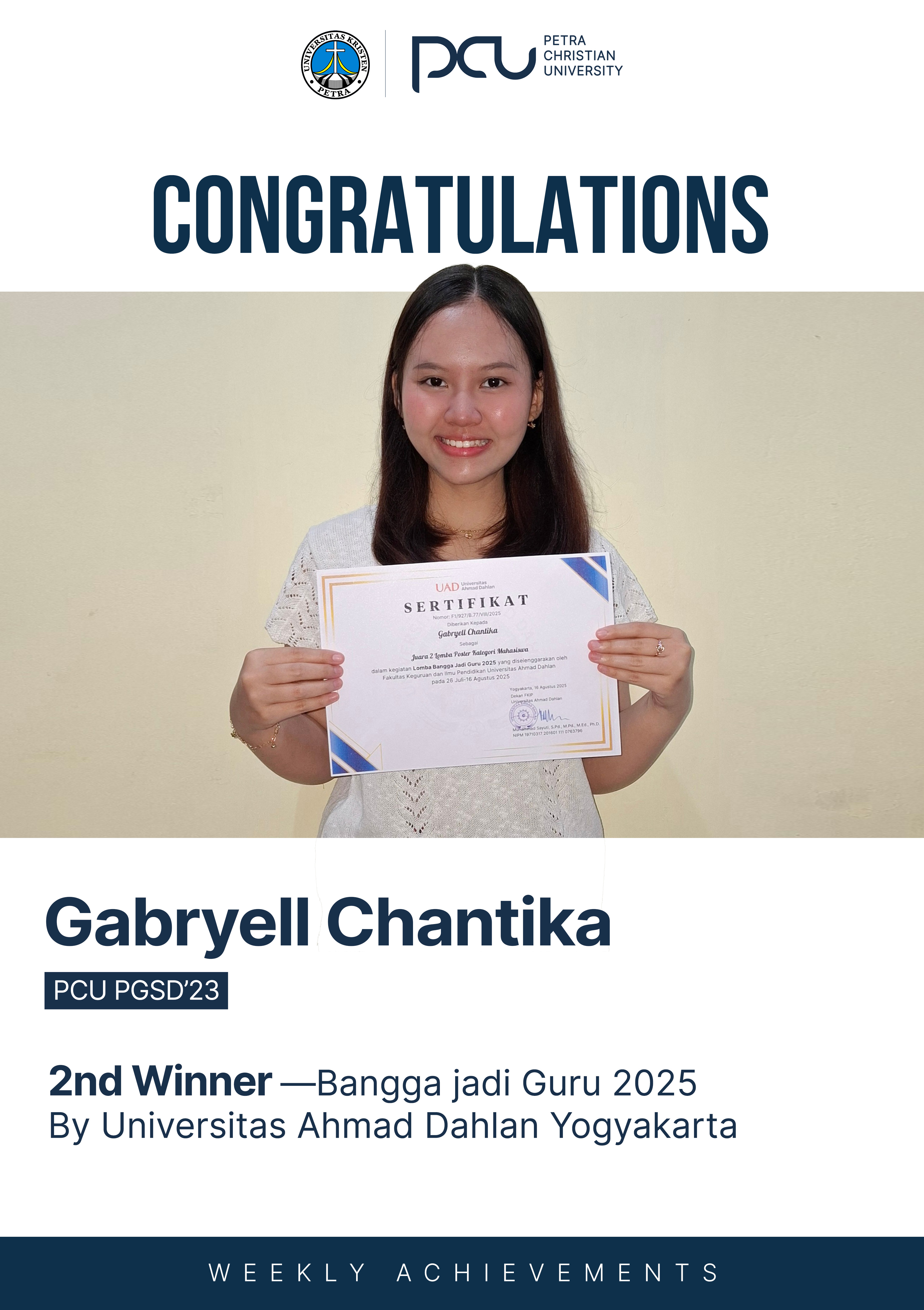 Selamat atas prestasi yang diraih Gabryell Chantika sebagai 2nd Winner dalam Lomba Poster-Bangga jadi Guru 2025 by Universitas Ahmad Dahlan Yogyakarta