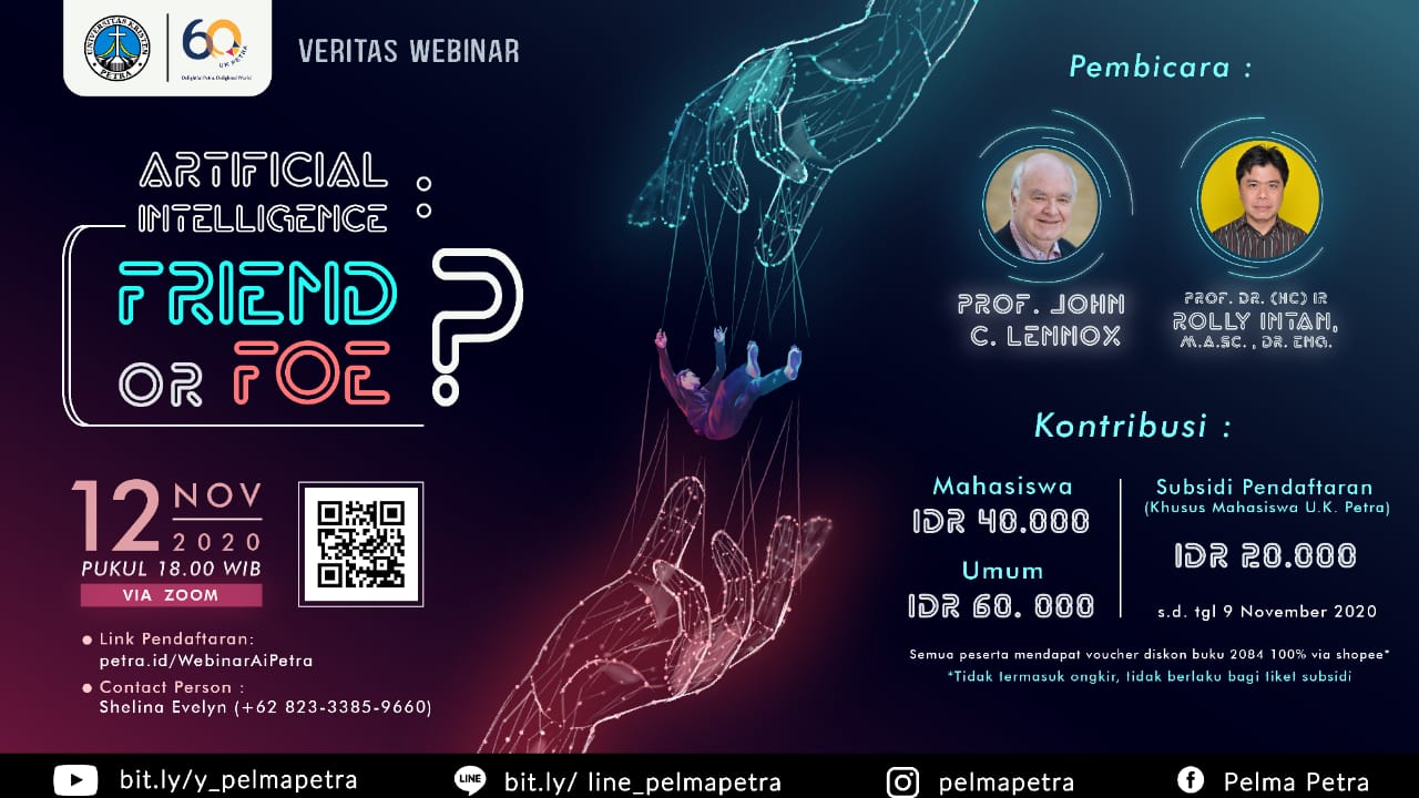 Pusat Kerohanian UK Petra mengadakan acara Veritas Webinar pada Senin, 12 Nov 2020 jam 18.00 WIB. diselenggarakan secara daring, via Zoom meeting. Topik yang diangkat ialah artificial Itelligence, friend to foe? Sebagai narasumber Prof. John C. Lennox dan Prof. Rolly Intan