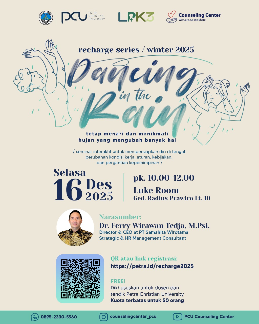 Pusat Konseling dan Pengembangan Pribadi Universitas Kristen Petra Surabaya pada 16 Desember 2025 jam 10.00 - 12.00 WIB bertempat di Luke room lantai 10 gedung Radius Prawiro, akan menyelenggarakan seminar dengan topik "Dancing in the Rain." Seminar interaktif untuk mempersiapkan diri di tengah perubahan kondisi kerja, aturan dan kebijakan ini sebagai narasumbernya adalah Dr. Ferry Wirawan Tedja, M.Psi.