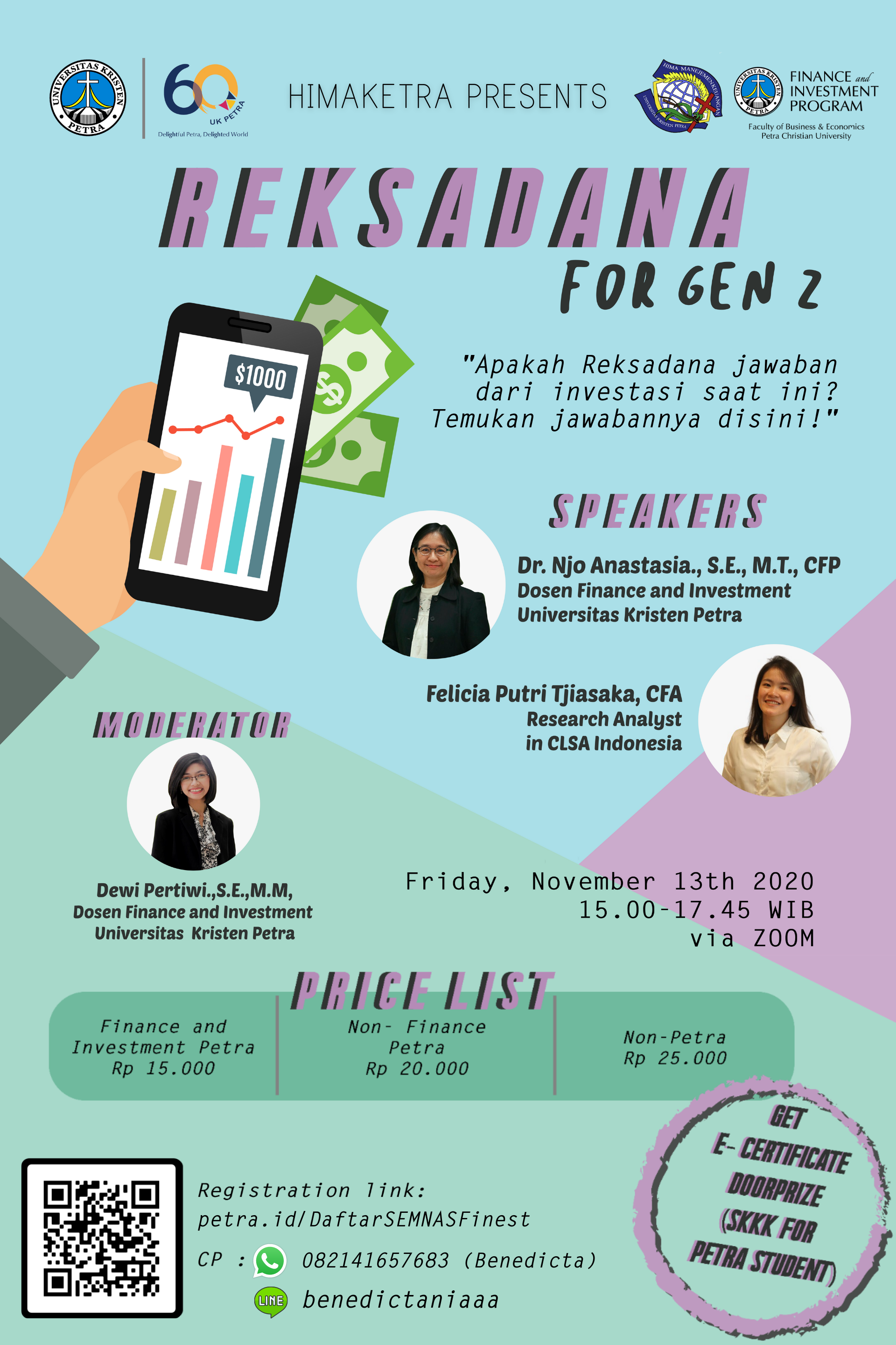 Apakah kamu pernah berinvestasi? Pernah dengar gak tentang Reksadana? Ada anggapan yang mengatakan Reksadana tidak pernah rugi? Benarkah? Seminar ini akan membahas tentang seluk beluk Investasi di Reksadana dan bagaimana Reksadana memungkinkan kita memiliki alternatif investasi, khususnya saat kondisi sedang tidak menentu. Bagi kalian yang tertarik, khususnya para pemula, generasi Gen Z, Yuk gabung dan isi harimu dengan informasi investasi yang penting bagi masa depanmu. Ditunggu ya!