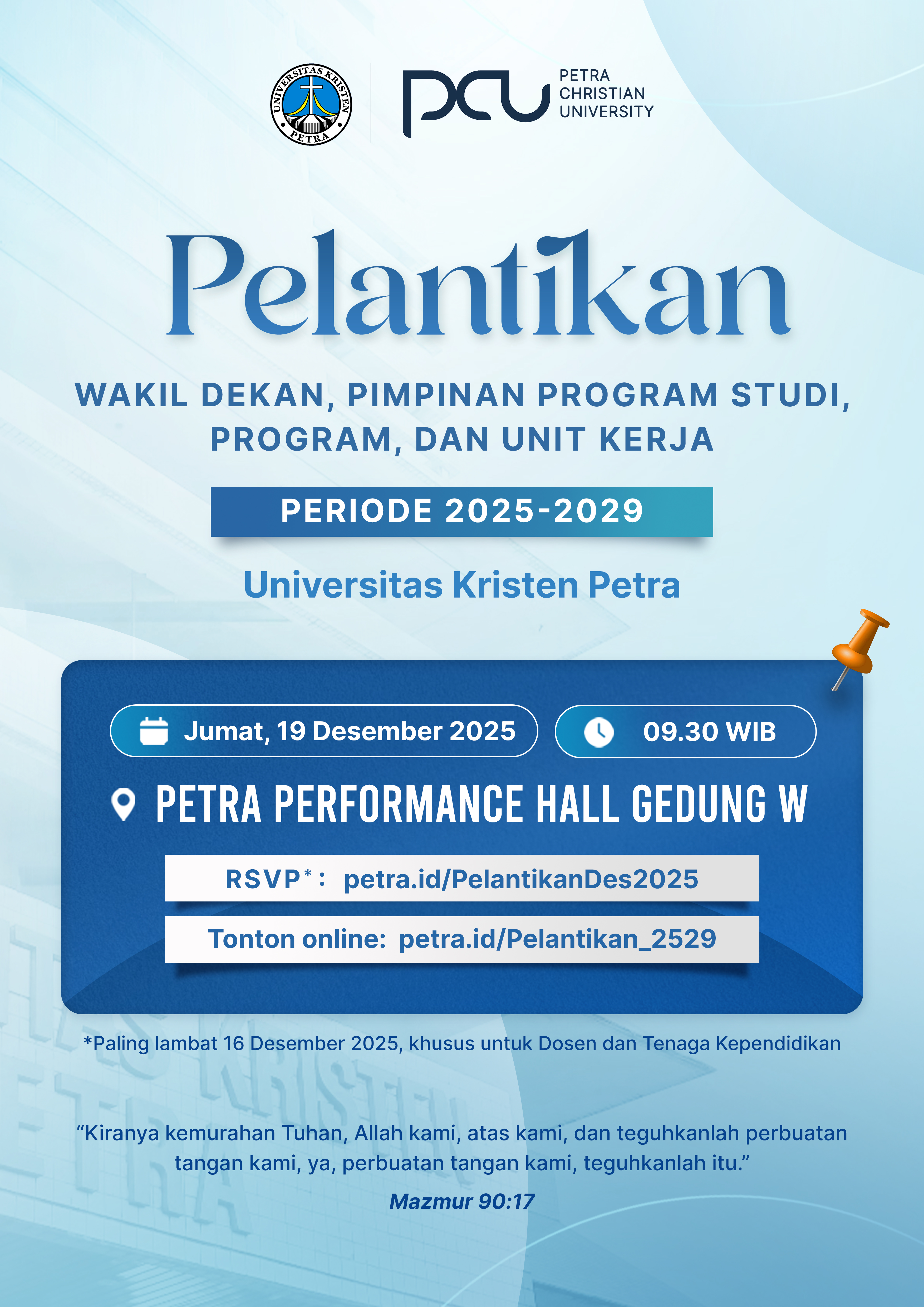 Pada 19 Desember 2025 jam 09.30 WIB bertempat di Petra Performance Hall UK Petra, akan diselenggarakan acara pelantikan wakil dekan, pimpinan program studi, program, dan unit kerja periode 2025-2029.