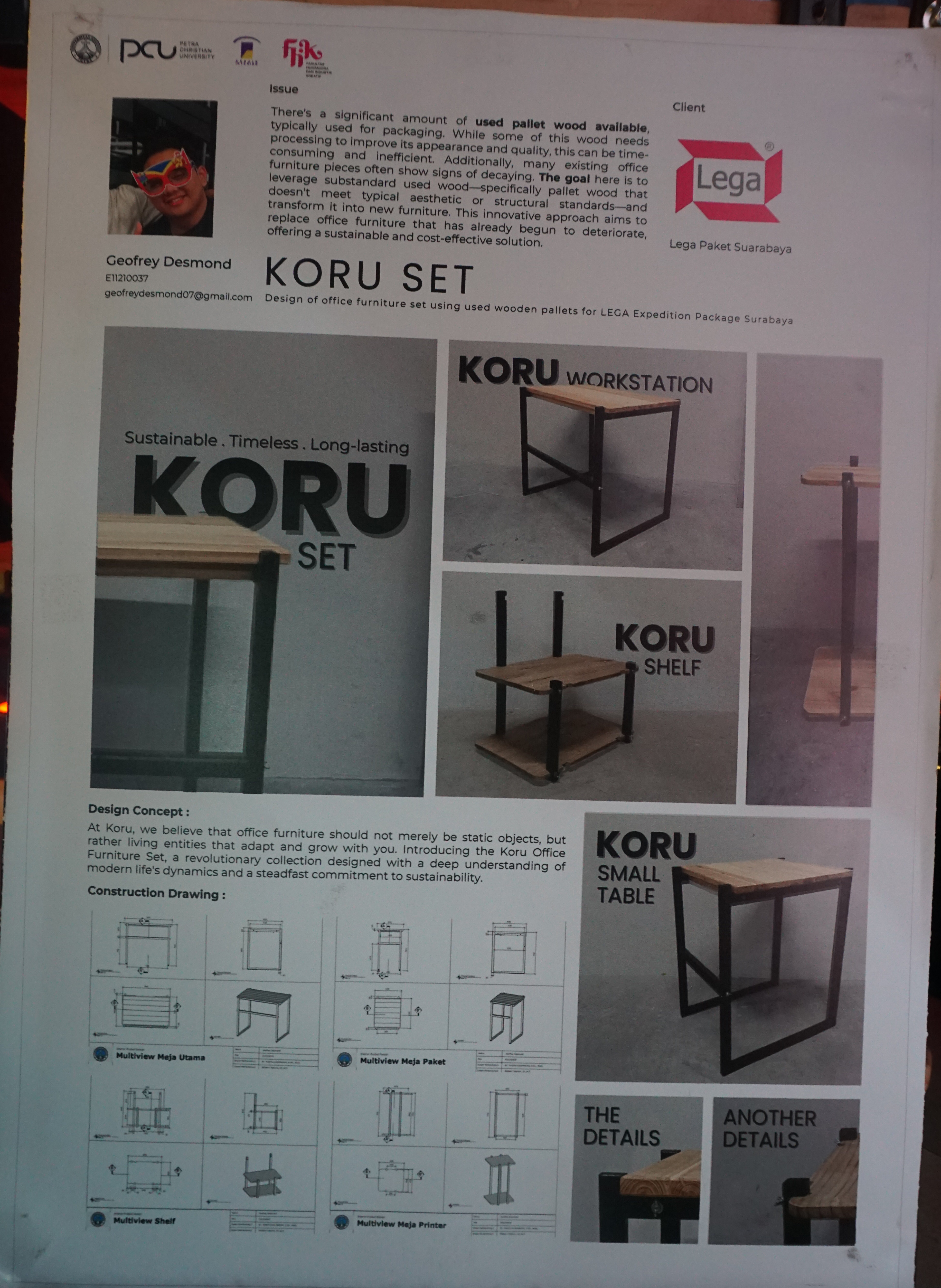 Interior Design Exhibition (INDEX) 2025 dengan mengangkat tema Synced menampilkan beberapa ide baru dari mahasiswa Desain Interior UK Petra. Pameran interior design ini diselenggarakan pada 31 Juli - 03 Agustus 2025, di kampus UK Petra. Salah satu materi pameran adalah "Koru set: design of office furniture set using used wooden pallets for LEGA expedition package Surabaya". Ide karya renovasi desain interior pada Jissai Restaurant.