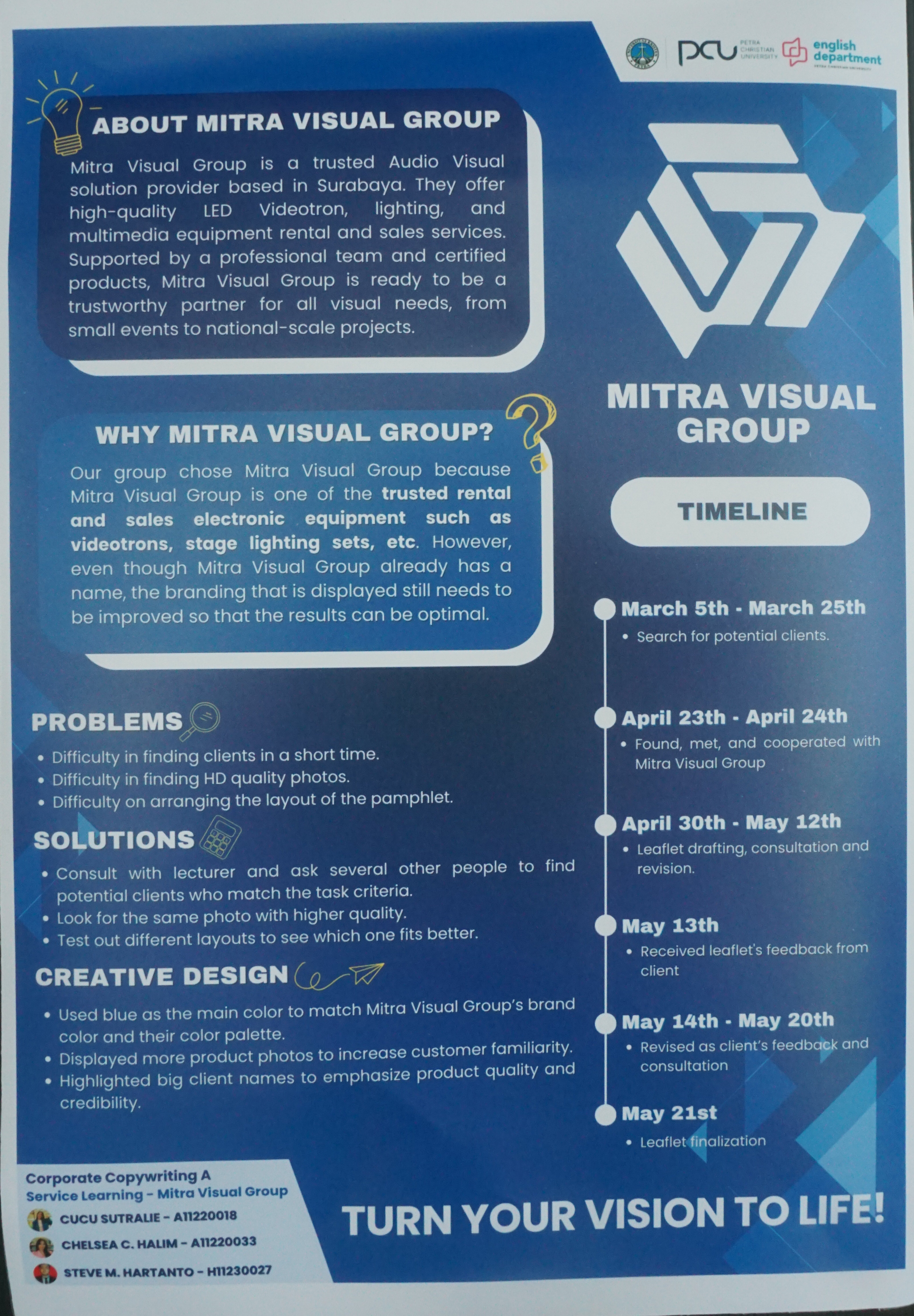 Poster ini dibuat untuk final project exhibition dari mahasiswa Program Studi English for Creative Industry. Salah satu materi pameran adalah Company Profile Mitra Visual Group