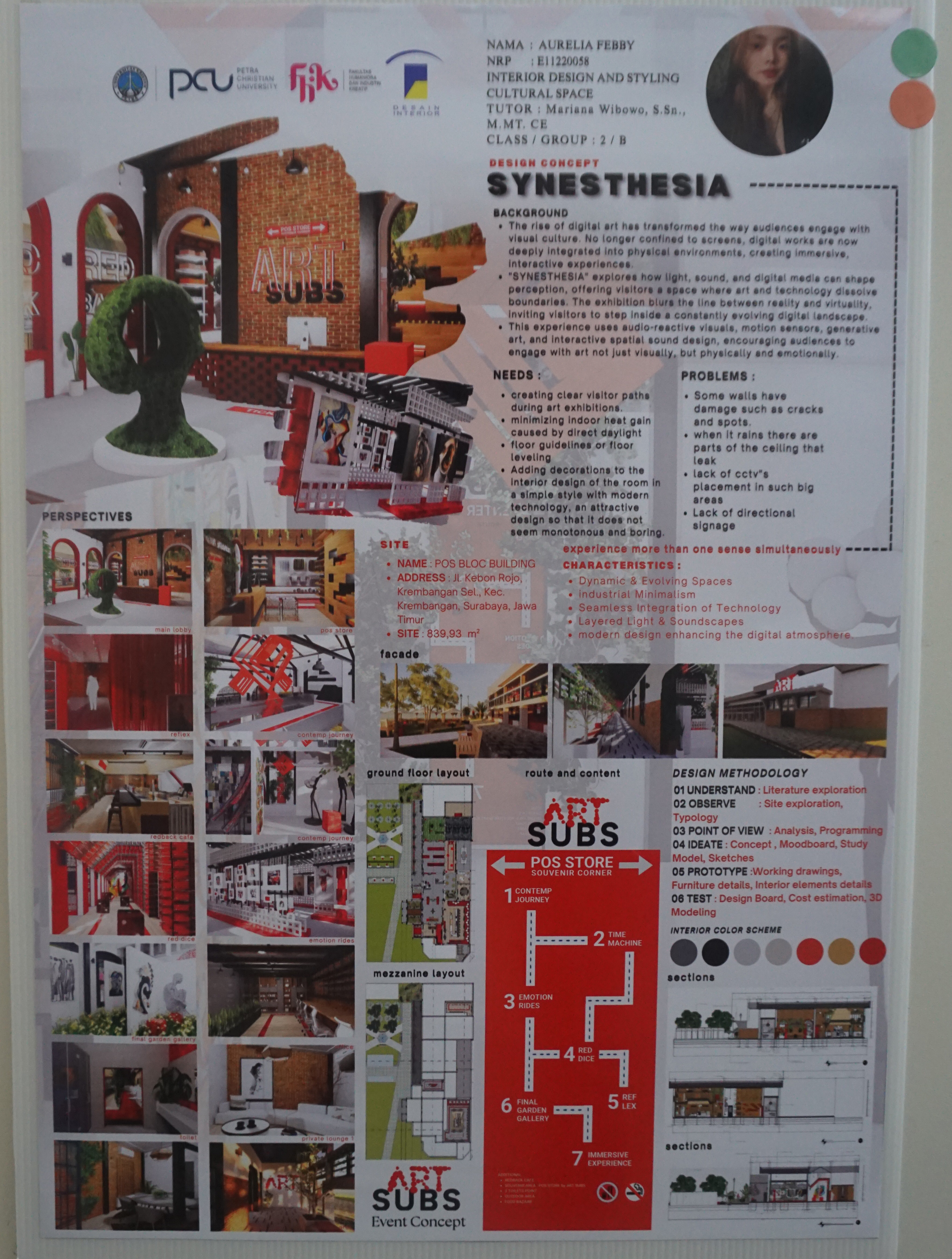 Dalam rangka menyemarakkan 27 tahun Prodi Desain Interior diselenggarakan seminar Insight bersama alumni dan pengguna lulusan, serta rangkaian acara IDE+ (Interior Design Exhibition and Workshop) 18-20 Juni 2025 yang menyajikan berbagai karya mata kuliah Personal Space, Presentasi Visual, Interior Design for Workspace, Furniture Design for Workspace, Interior Design for Cultural Space, Interior Product Design For Cultural Space, Craft and Furnishing, dan LEAP Final Project. Dalam pameran IDE+ tahun ini disajikan pula hasil karya kolaborasi project based learning Prodi Desain Interior PCU - UCSI dan UiTM. Salah satu materi pameran ini ialah Synesthesia: interior design and styling cultural space. Karya Aurelia Febby (E11220058)
