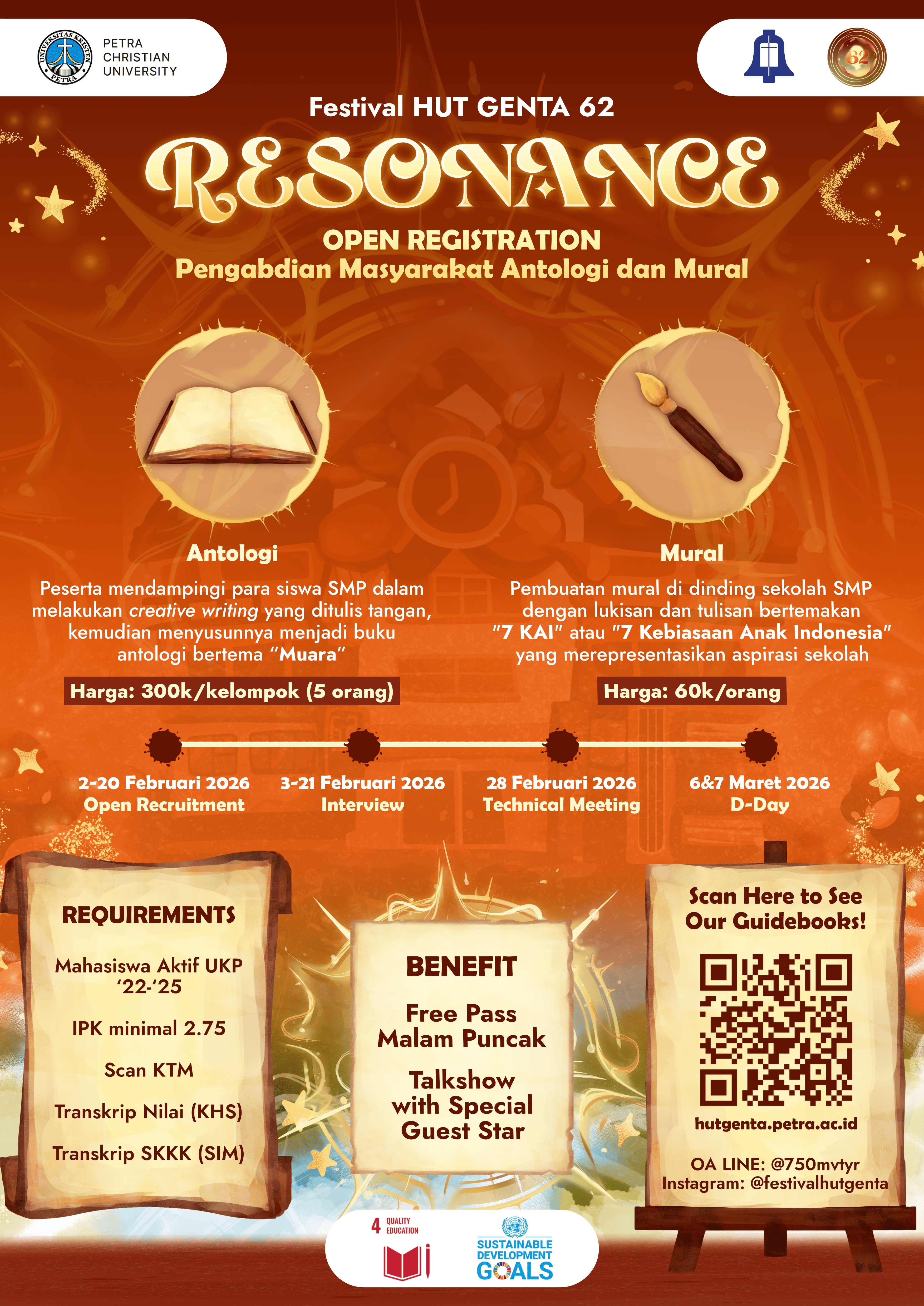 Para mahasiswa mengajak para siswa SMPN 57 untuk menceritakan kisah hidup mereka melalui buku antologi berjudul “Muara”. Para siswa diajak untuk mengenali kemampuan, minat, ketakutan, dan harapan mereka. Melalui pengenalan ini, mereka dapat mengetahui langkah yang harus diperjuangkan untuk meraihnya. Tak hanya itu, mereka juga diajak untuk merefleksikan kembali kondisi lingkungan keluarga, pertemanan, dan pendidikan seperti apa yang memadai serta perlu diubah untuk mewujudkan perjuangan mencapai harapan tersebut. Kemudian para anak dapat menuangkannya dalam bentuk tulisan, gambar, dan warna dalam buku tersebut. Selain itu, juga terdapat Pengabdian Masyarakat sektor Mural. Peserta melukis gambar dan membuat tulisan di dinding SMPN 57. Kegiatan ini diharapkan dapat menyalurkan keberanian berekspresi dan aspirasi SMPN 57. Kegiatan ini dilaksanakan pada 6-7 Maret 2026.