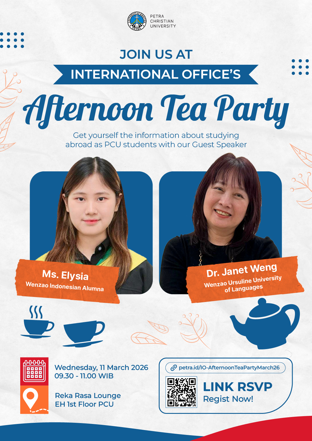 Biro Administrasi Kerjasama dan Pengembangan UK Petra, pada Rabu, 11 Maret 2026 bertempat Reka Rasa gedung EH lantai 1 mengadakan acara Sesi Informasi terkait Program Outbound studi di luar negeri untuk mahasiswa PCU.