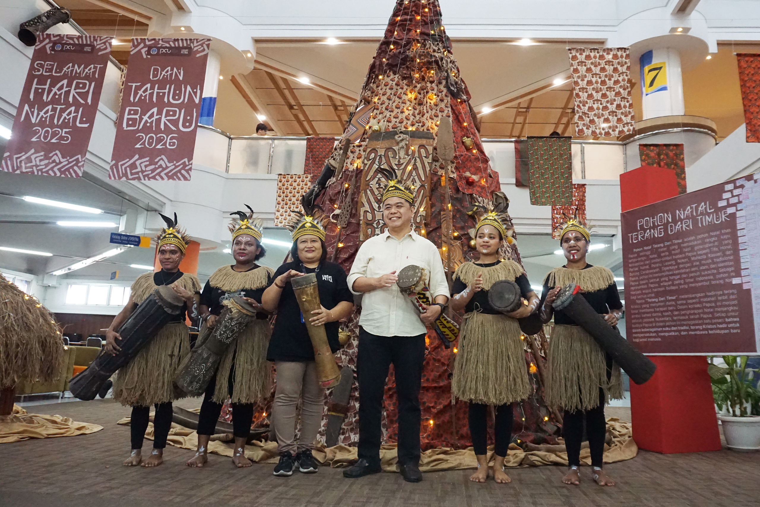 18 Desember 2025 bertempat di ruang pameran lantai 6 Perpustakaan UK Petra diselenggarakan acara Launching Pohon Natal Terang dari Timur. Pohon Natal Terang dari Timur adalah pohon Natal khas Papua setinggi 7 meter yang memadukan rangka kayu, lampu-lampu Natal, serta motif hasil generative-AI yang terinspirasi dari simbol-simbol budaya Papua seperti Tifa, Honai, Perisai Asmat, Perahu Lesung, Noken, Mahkota Kasuari, dan Burung Cendrawasih. Diperkaya dengan alat musik tradisional Papua, pohon ini menampilkan keindahan seni, alam, dan identitas Papua dalam bentuk yang hangat dan penuh sukacita. Sebagai representasi Papua, wilayah paling timur Indonesia, pohon ini menjadi wujud harmoni budaya yang menyambut terang Natal bagi semua umat.