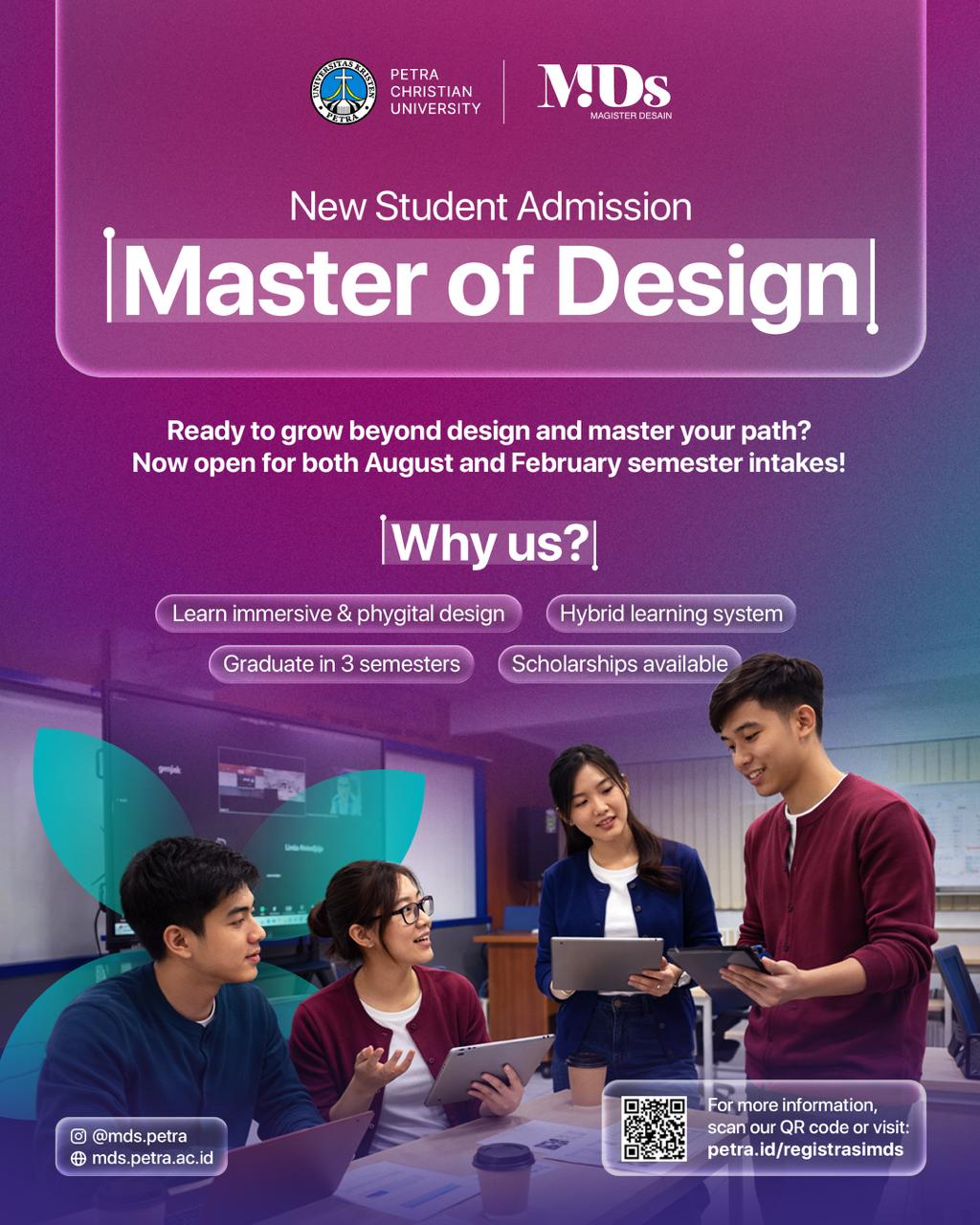 Program Studi Magister Desain Universitas Kristen Petra Surabaya, membuka pendaftaran Penerimaan Mahasiswa Baru. Pendaftaran dibuka hingga 1 Agustus 2026