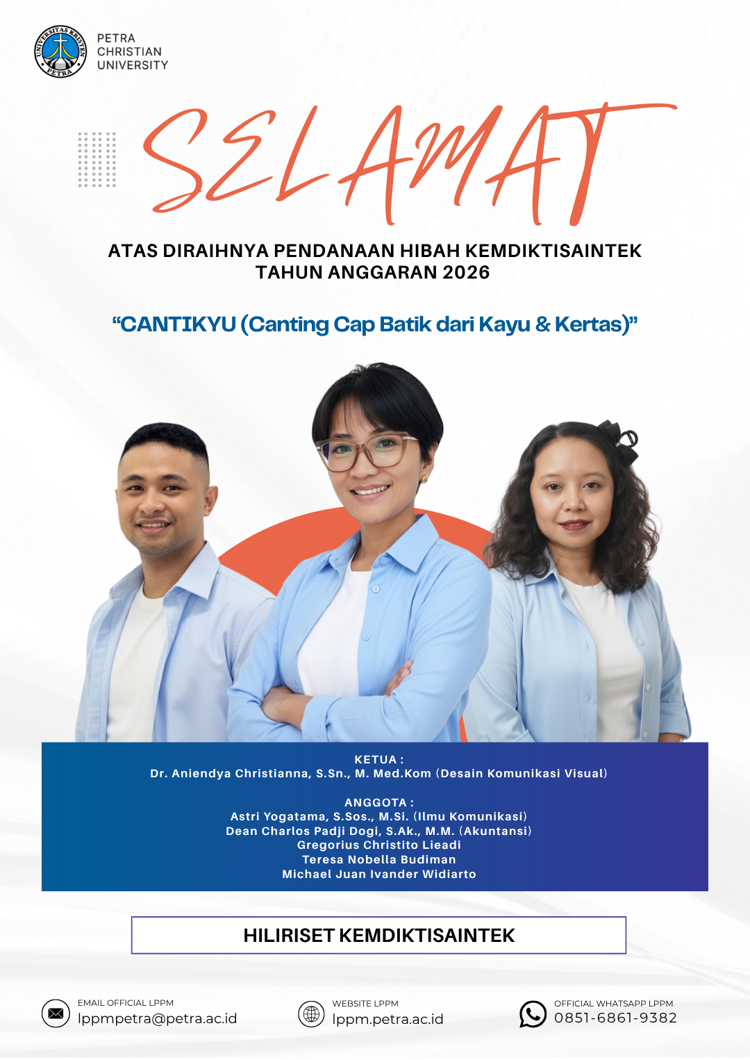 Ucapan selamat atas prestasi yang diraih oleh Dr. Aniendya Christiana, S.Sn., M.Med.Kom., serta Astri Yogatama, S.Sos., M.Si., Dean Charlos Padji Dogi, S.Ak., M.M., dan Gregorius Christito Lieadi, Teresa Nobella Budiman, Michael Juan Ivander Widiarto sebagai penerima pendanaan hibah Kemdiktisaintek tahun anggaran 2026, dengan skema Hiliriset Kemdiktisaintek.