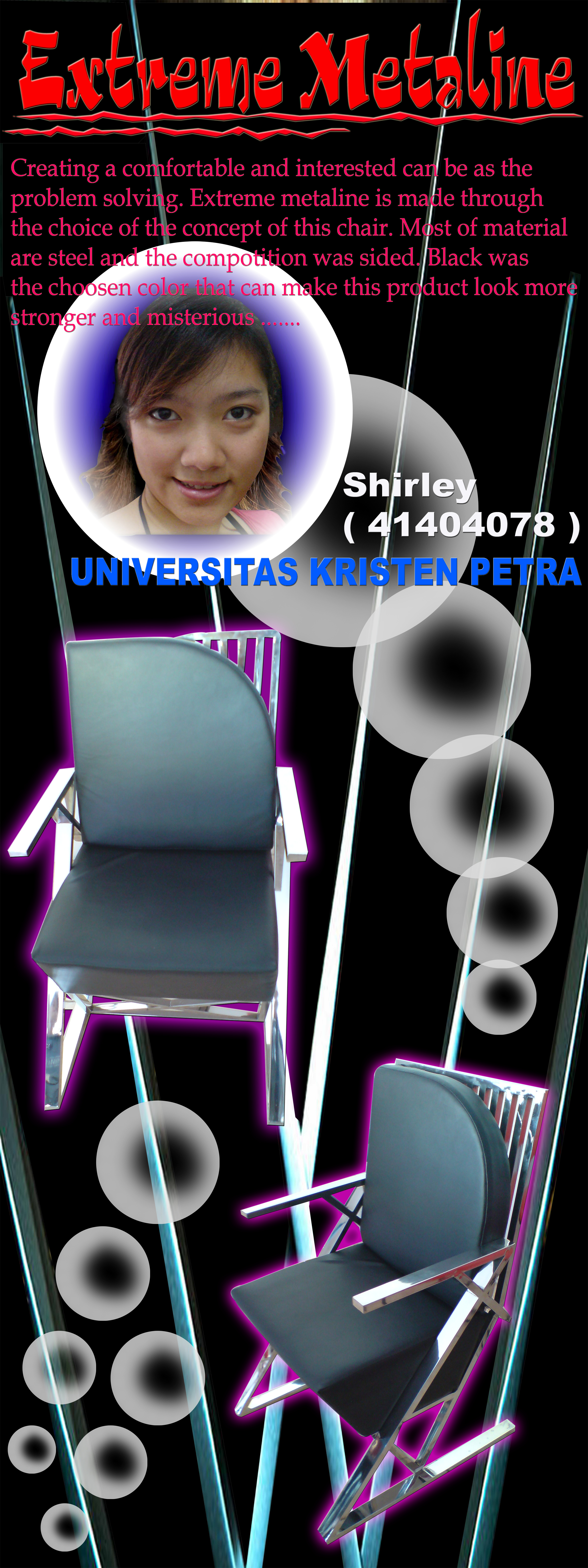 Creating a comfortable and interested can be as the problem solving. Extreme metaline is made through the choice of the concept of this chair. Most of material are steel and the competition was sided. Black was the choosen color that can make this product look more stronger and misterious.