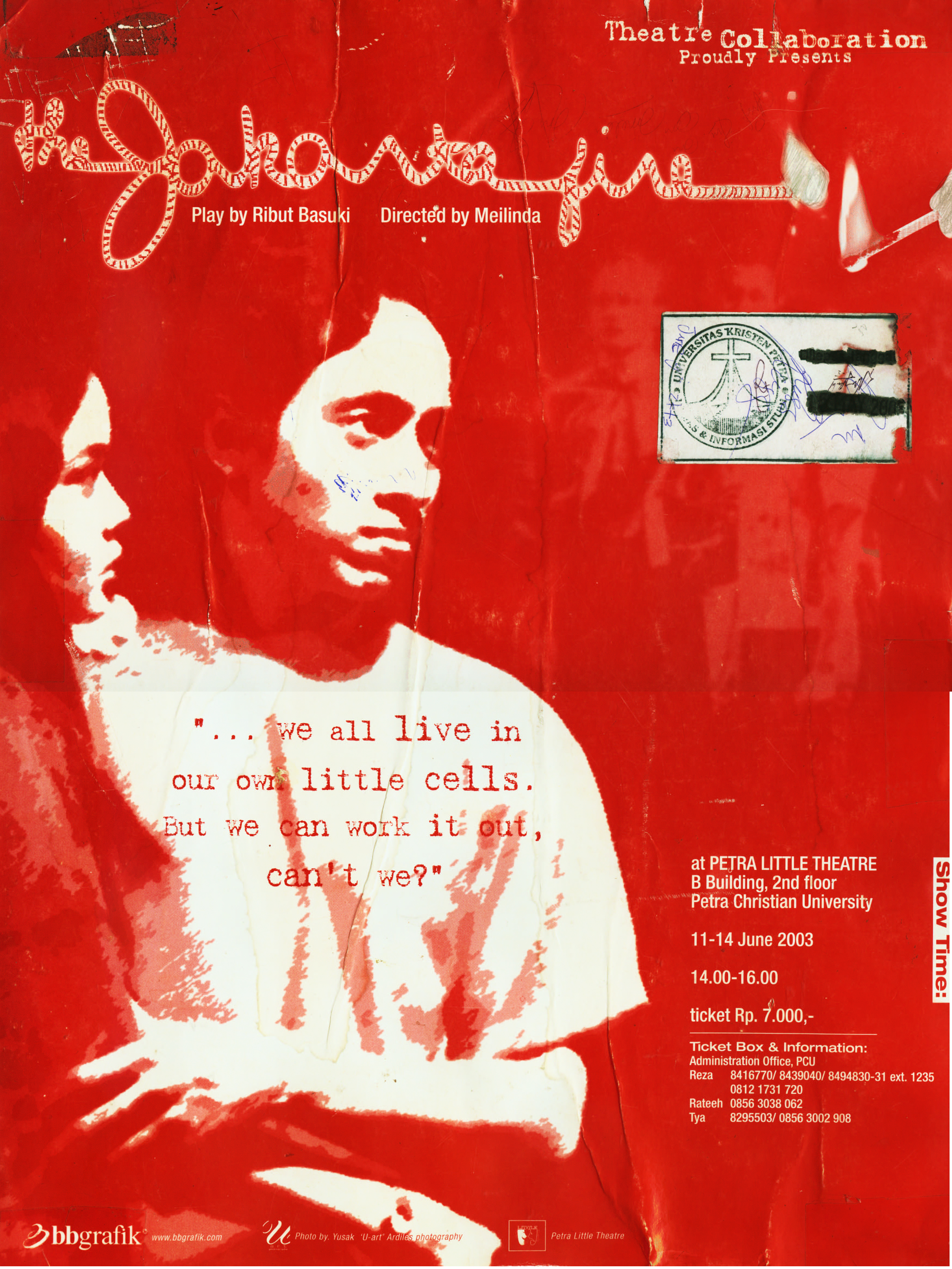Poster kegiatan yang diadakan oleh Petra Little Theatre di Gedung B lantai 2 Jurusan Sastra Inggris Fakultas Sastra Universitas Kristen Petra pada tanggal 11-14 Juni 2003