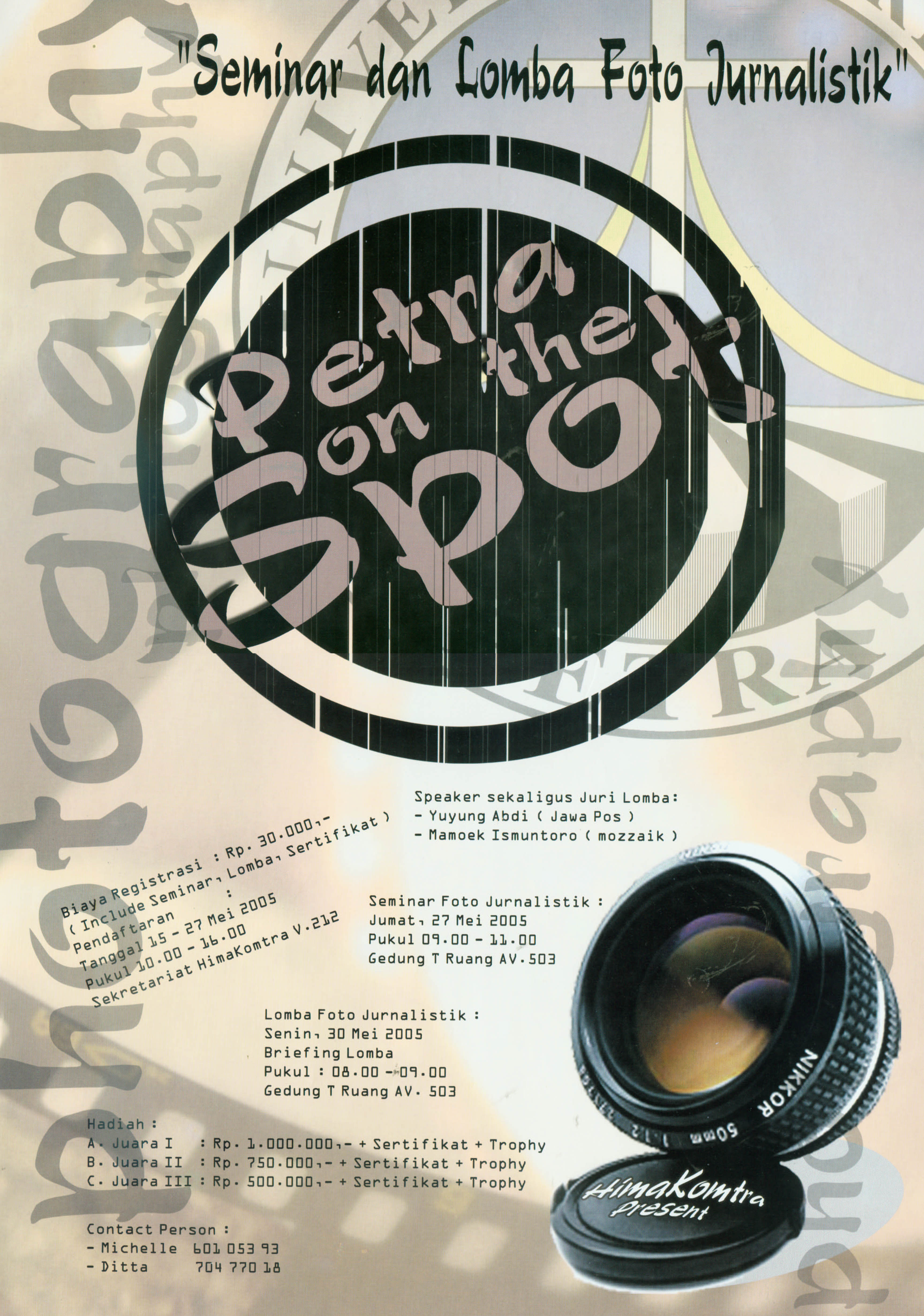 Pelatihan dan lomba foto jurnalistik ini bertujuan agar peserta dapat mengetahui lebih jauh mengenai fotografi jurnalistik serta mempererat hubungan jurusan ilmu komunikasi yang ada di Surabaya. Acara ini diselenggarakan oleh Himpunan Mahasiswa Jursan Ilmu Komunikasi UK Petra yang telah dilaksanakan pada tanggal 27 dan 30 Mei 2005 bertempat di Gedung T, UK Petra.