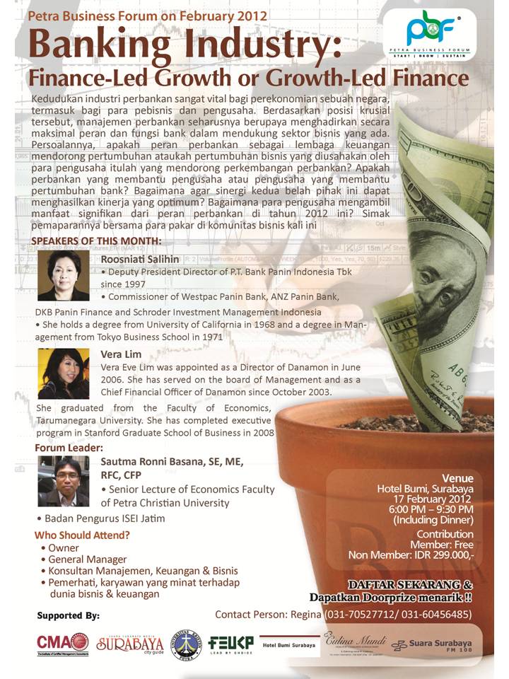 Kedudukan industri perbankan sangat vital bagi perekonomian sebuah negara. Apakah peran perbankan sebagai lembaga keuangan mendorong pertumbuhan atau pertumbuhan bisnis yang diusahakan oleh para pengusaha itulah yang mendorong perbankan? Acara ini dihelat pada tanggal 17 Februari 2012 bertempat di Hotel Bumi Surabaya.