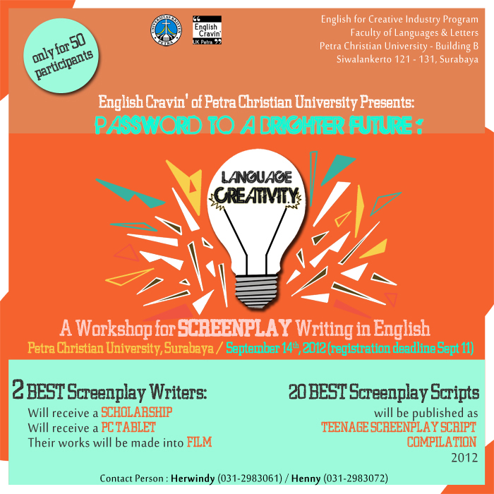English Cravin' of Petra Christian University presents: Password to A Brighter Future. A Workshop for screenplay writing in English, on September 14, 2012 and only for 50 participants.