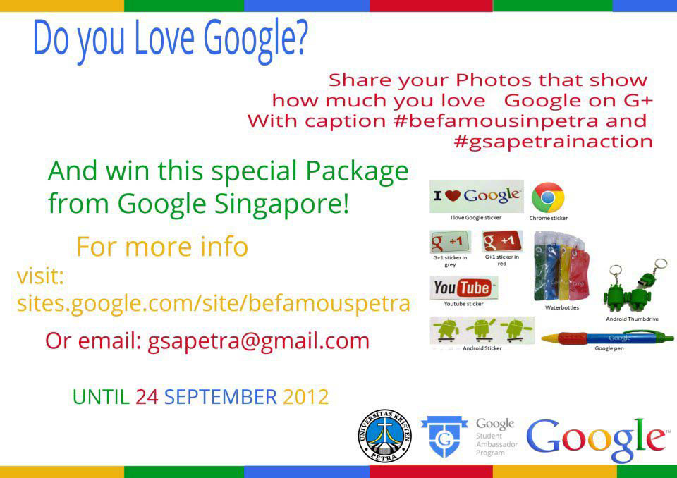 Share photos that show how much you love Google and win special package from Google Singapore; until 24 september 2012