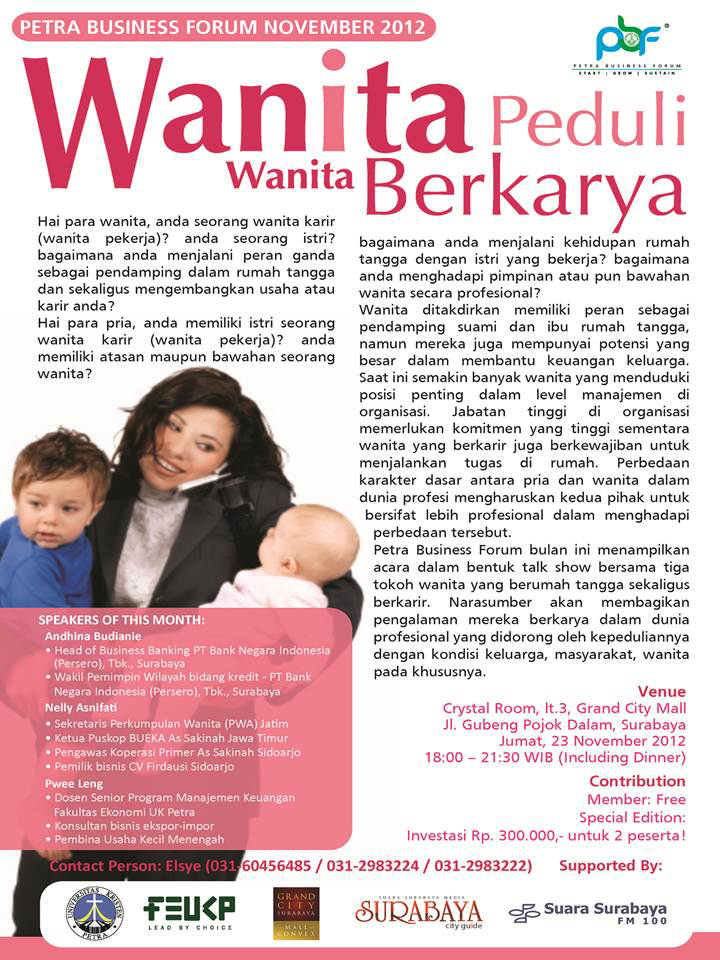 Petra Business Forum kali ini menampilkan acara dalam bentuk talk show bersama tiga tokoh wanita yang berumah tangga sekaligus berkarier. Narasumber akan membagikan pengalaman mereka berkarya dalam dunia profesional yang didorong oleh kepeduliannya dengan kondisi keluarga, masyarakat, wanita pada khususnya. Acara ini digelar pada tanggal 23 November 2012 bertempat di Crystal Room, Grand City Mall lt.3.