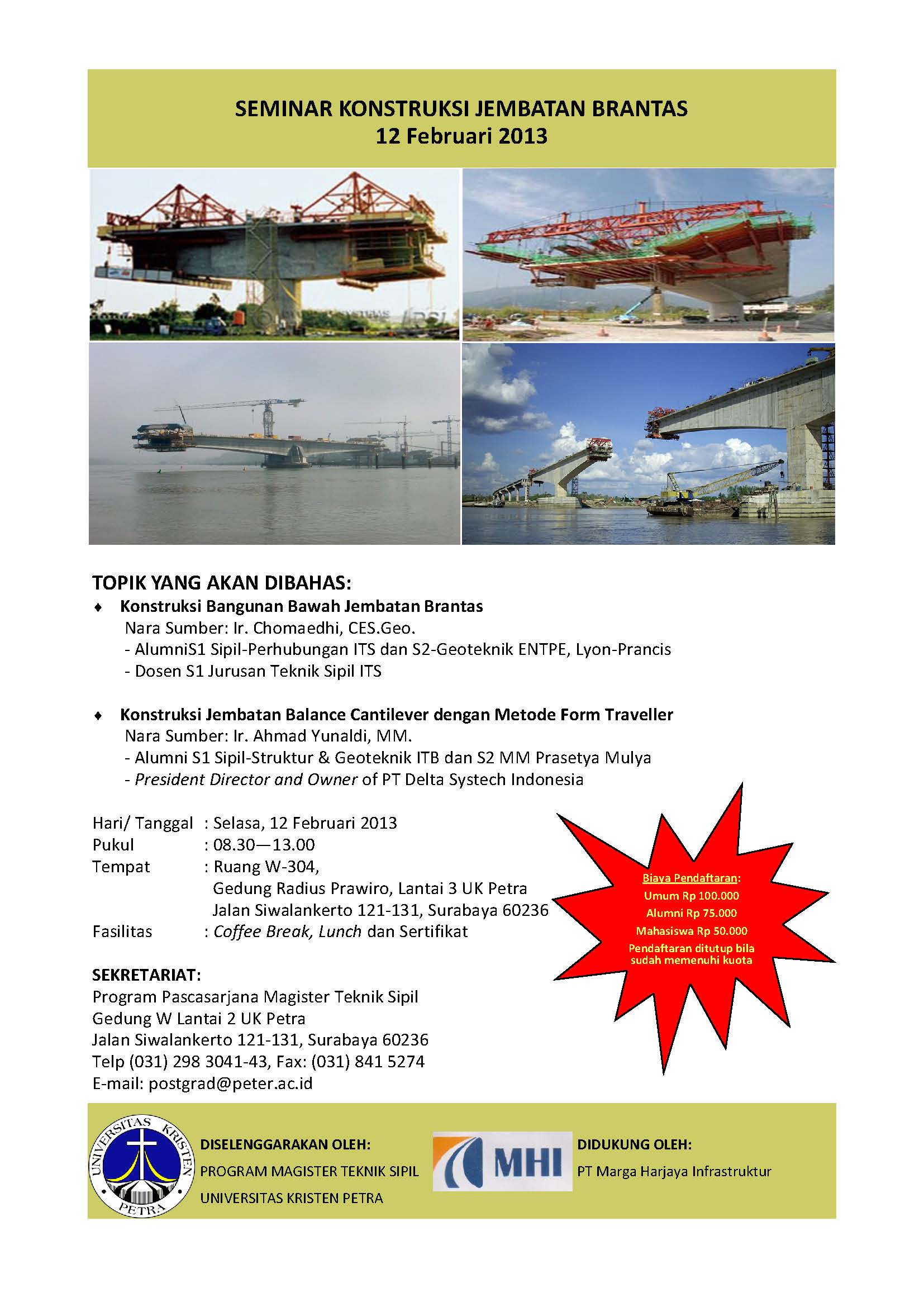 Seminar Konstruksi Jembatan Brantas diadakan pada tanggal 12 Februari 2013 bertempat di W-304 dengan menghadirkan Ir.Chomaedi , CES, Geo., Ir.Ahmad Yunaldi, MM.