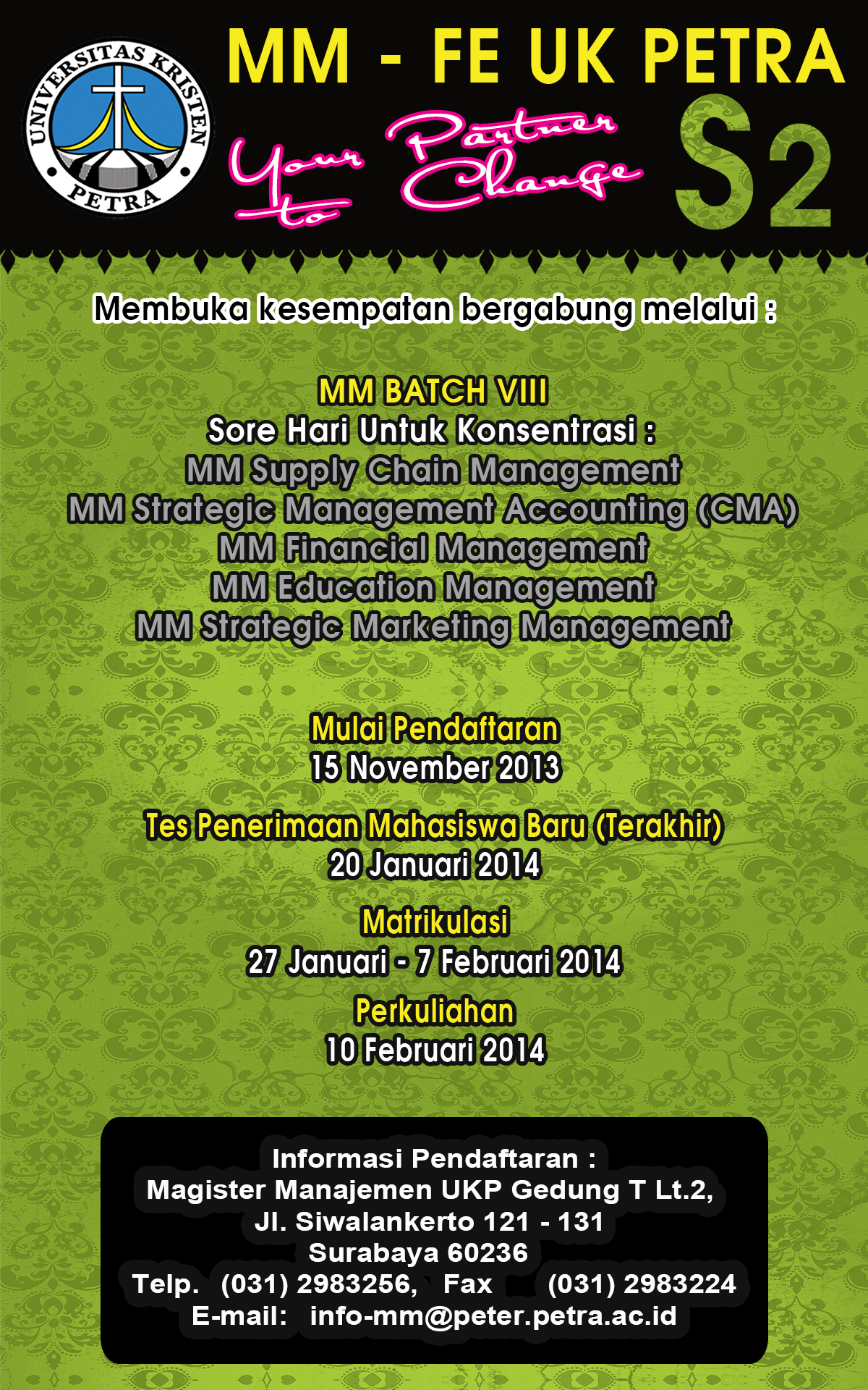 Fakultas Ekonomi UK. Petra membuka kesempatan bagi mahasiswa yang ingin melanjutkan studi S2 di UK Petra untuk mendapatkan gelar MM (Magister Managemen). Pendaftaran dimulai pada tangal 15 Nopember 2013. Tes pendaftaran diadakan pada tanggal 20 Januari 2014.
