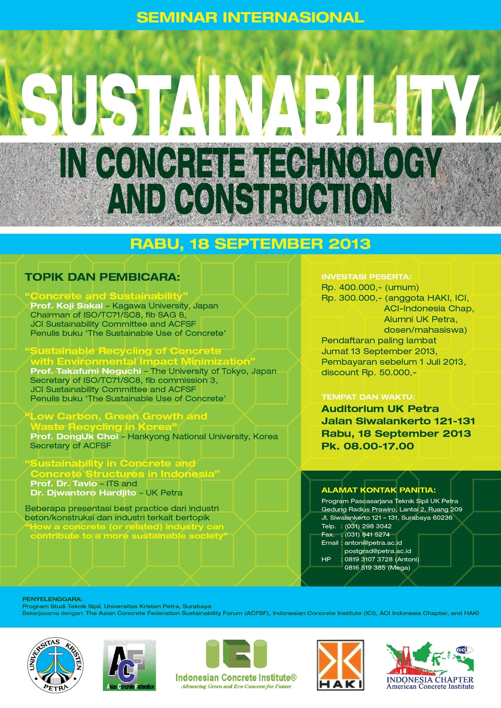 Program studi Teknik Sipil UK. Petra mengadakan seminar yang bertema :Sustainability in Concrete Technologi and Construction. Seminat ini diadakan pada tanggal 18 September 2013 di Auditorium Gedung W UK. Petra. Acara ini dibuka untuk umum dengan biaya sebesar Rp 400.000,00, sedangkan bagi mahasiswa, dosen, alumnus UK Petra akan dikenakan biaya sebesar Rp 300.000,00. Pendaftaran untuk mengikuti acara ini ialah pada tanggal 13 September 2013.