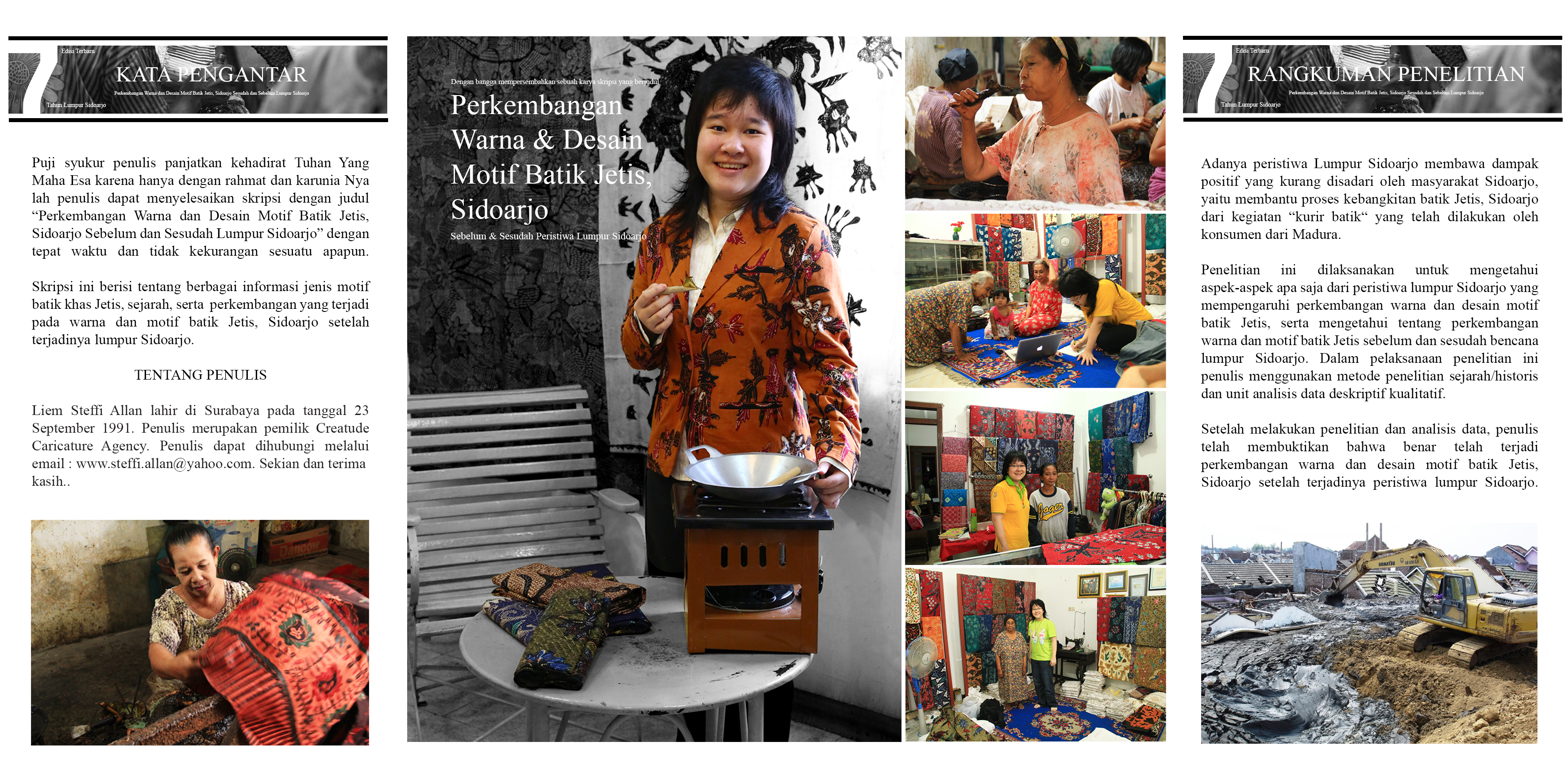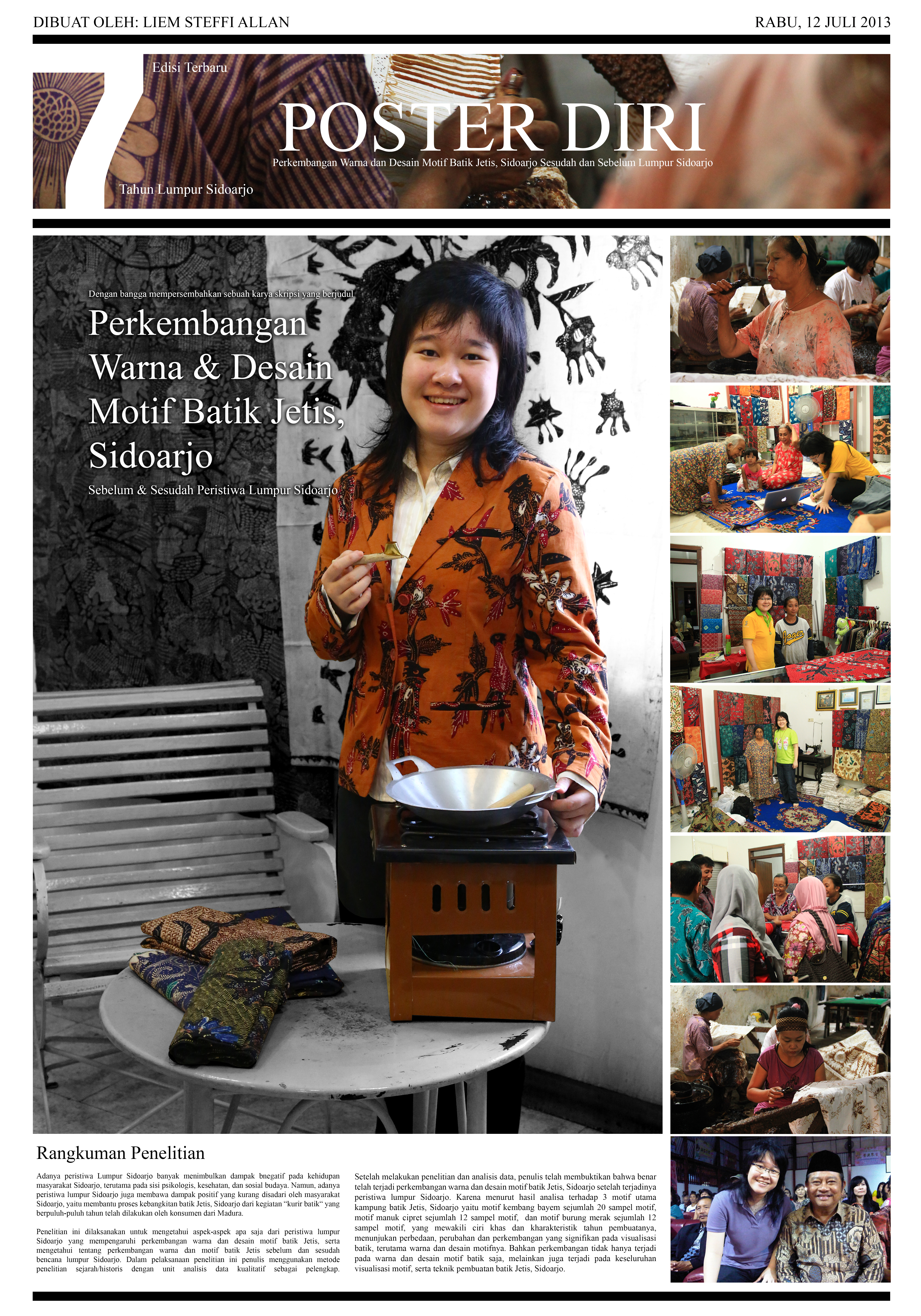 Adanya peristiwa lumpur Sidoarjo membawa dampak positif yaitu membantu proses kebangkitan batik Jetis, Sidoarjo dari kegiatan “kurir batik“ oleh konsumen dari Madura. Dengan menggunakan metode penelitian sejarah/historis dan unit analisis data kualitatif penelitian ini dilaksanakan untuk mengetahui aspek-aspek apa saja dari peristiwa lumpur Sidoarjo yang mempengaruhi perkembangan warna dan desain motif batik Jetis, serta mengetahui tentang perkembangan warna dan motif batik Jetis sebelum dan sesudah bencana lumpur Sidoarjo. Kesimpulan yang dapat diambil dari penelitian ini adalah telah terjadi perkembangan warna dan desain motif batik Jetis, Sidoarjo sebelum dan setelah terjadinya peristiwa lumpur Sidoarjo.